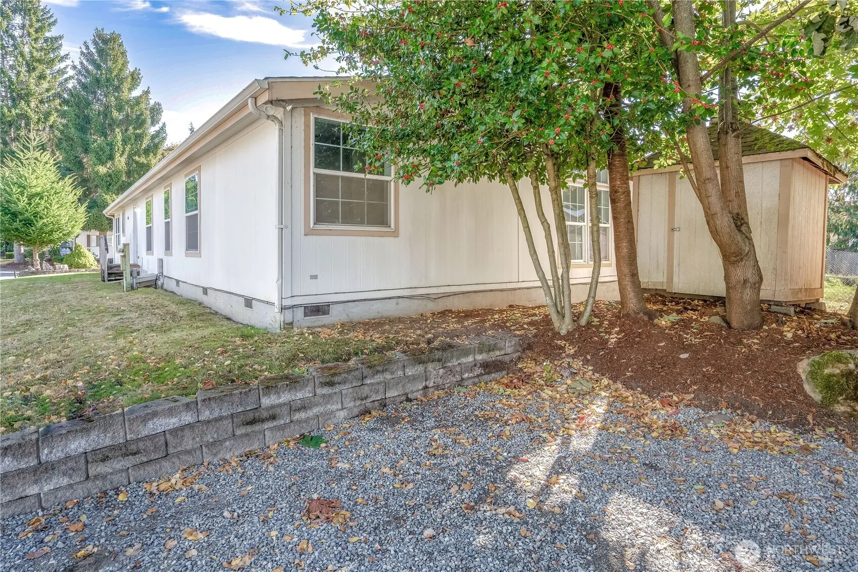 Own both the home and the land in Kenton Firs. No monthly lease payments. 3 Bedrooms, 2 Full Baths. Primary Bath has soaking tub and separate shower. New interior paint and flooring. Open concept Kitchen, Dining Room, Living Room with fireplace and ceiling fan and another Family Room with ceiling fan. All appliances stay. Outside you will find 2 storage units on a nice corner lot. Several common areas to enjoy.