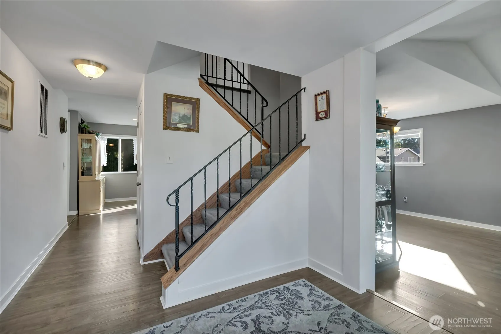 Well-maintained home on a large corner lot. The updated kitchen features an oversized island with quartz countertops and opens to the dining area. Step out to the new wraparound deck overlooking the fully fenced backyard with garden space and shed. The primary bedroom upstairs includes an ensuite, with three additional bedrooms on the upper level. Two-car garage offers extra storage and access to a dog run or extra outdoor storage. Conveniently located near 405, 167, and the Sounder light rail for an easy commute. Make this your next home!