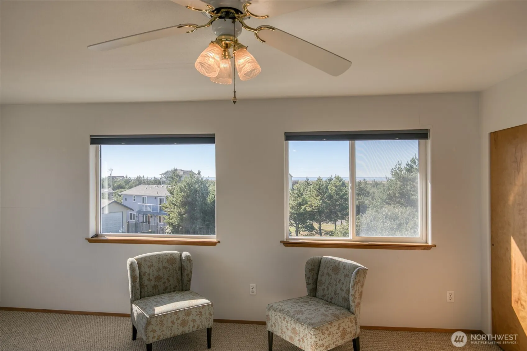 New siding and new roof (2022) on this freshly painted 2.5 story home with tasteful architecture and ocean views. Second level main living area features 2 bedrooms, full bath, and an open floor plan with dining area and built in window seat by the propane fireplace insert. A sliding glass door leads to a large wrap around deck. Lower level accessible through double garage, side door, or front and includes living area, mud room/laundry, ¾ bath, and an office/flex space. Top floor features oversized primary bedroom, large windows overlooking the ocean, and a full bath with a jetted tub and separate shower. Attractive low-maintenance landscaping and fully fenced back yard. Quiet cul-de-sac one block from the public beach trail.