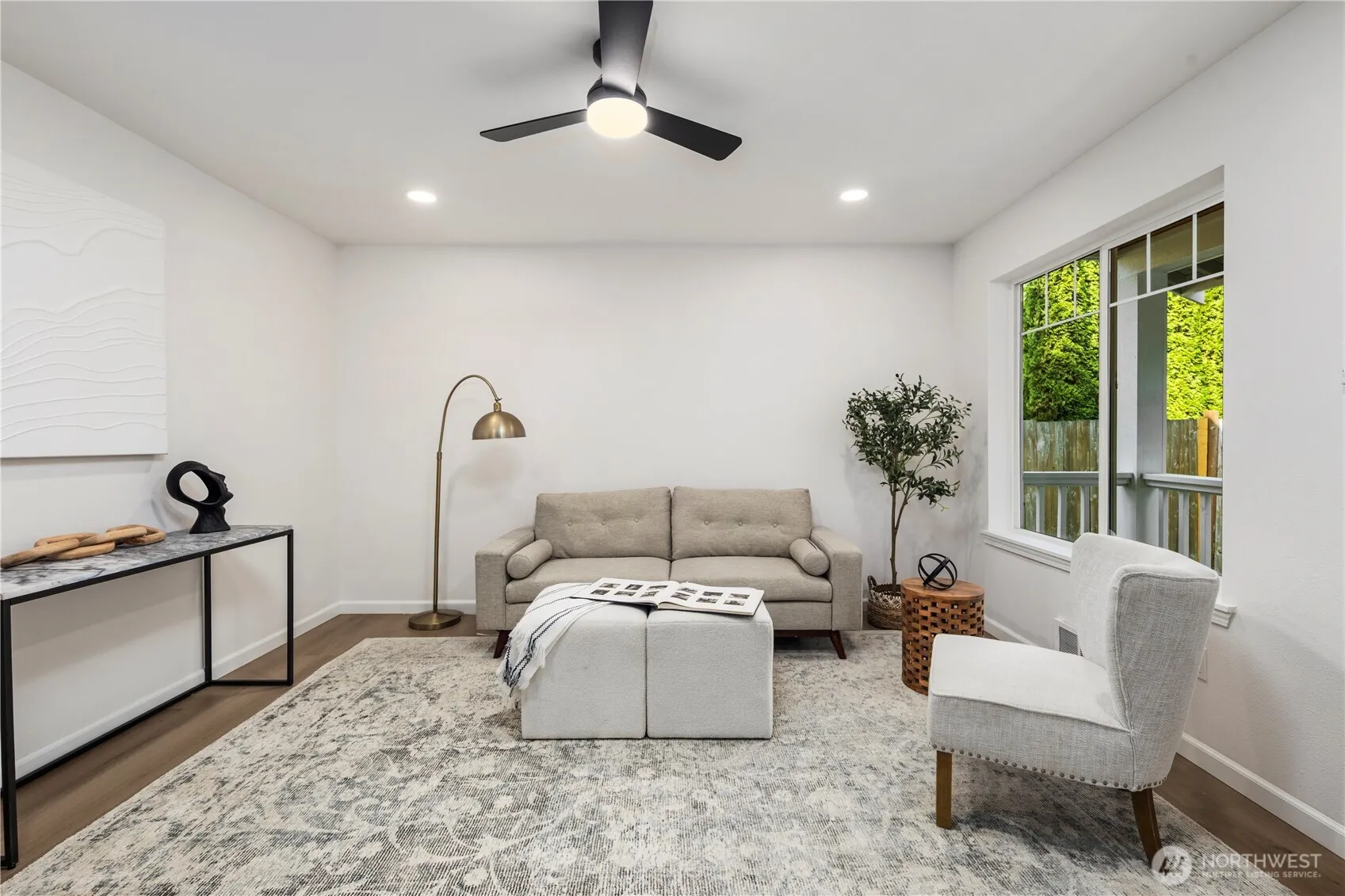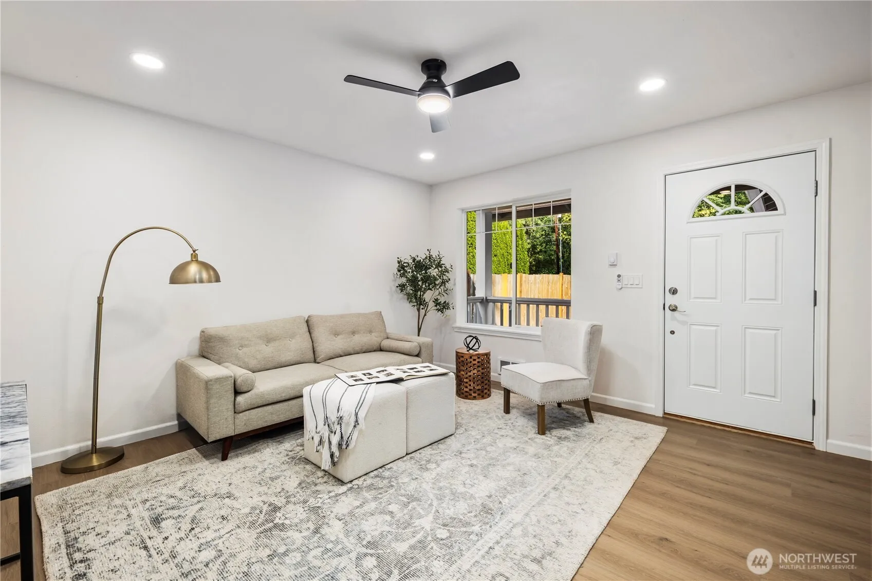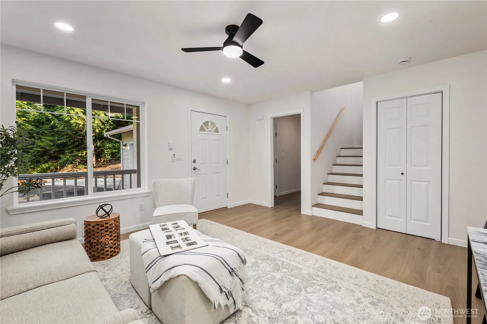 Secluded 2-story single family charmer, embraced by mountains & a river flowing thru the community. Arrive to plentiful parking and step into a bright living room that opens to an expansive Kitchen & Dining area. The kitchen shines w/ new quartz countertops, shaker cabinetry, SS appliances, & dining beside sliding doors to a tranquil backyard & forested greenbelt. Main level features guest bath & laundry. Upstairs find generous bedrooms, incl. a dreamy Primary Retreat w/ ample closets & an elegant En-Suite boasting tiled floors, tiled shower, new vanities & designer lighting. plus a stylish tiled Main Bath. Fresh paint in/out, LVP floors throughout, DP windows, new hardware, low maintenance backyard, & 2-car garage.