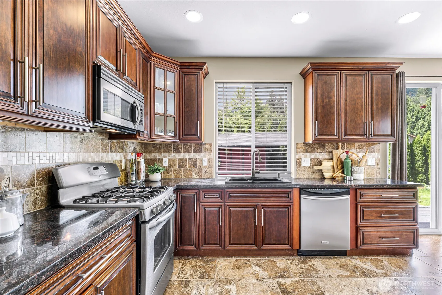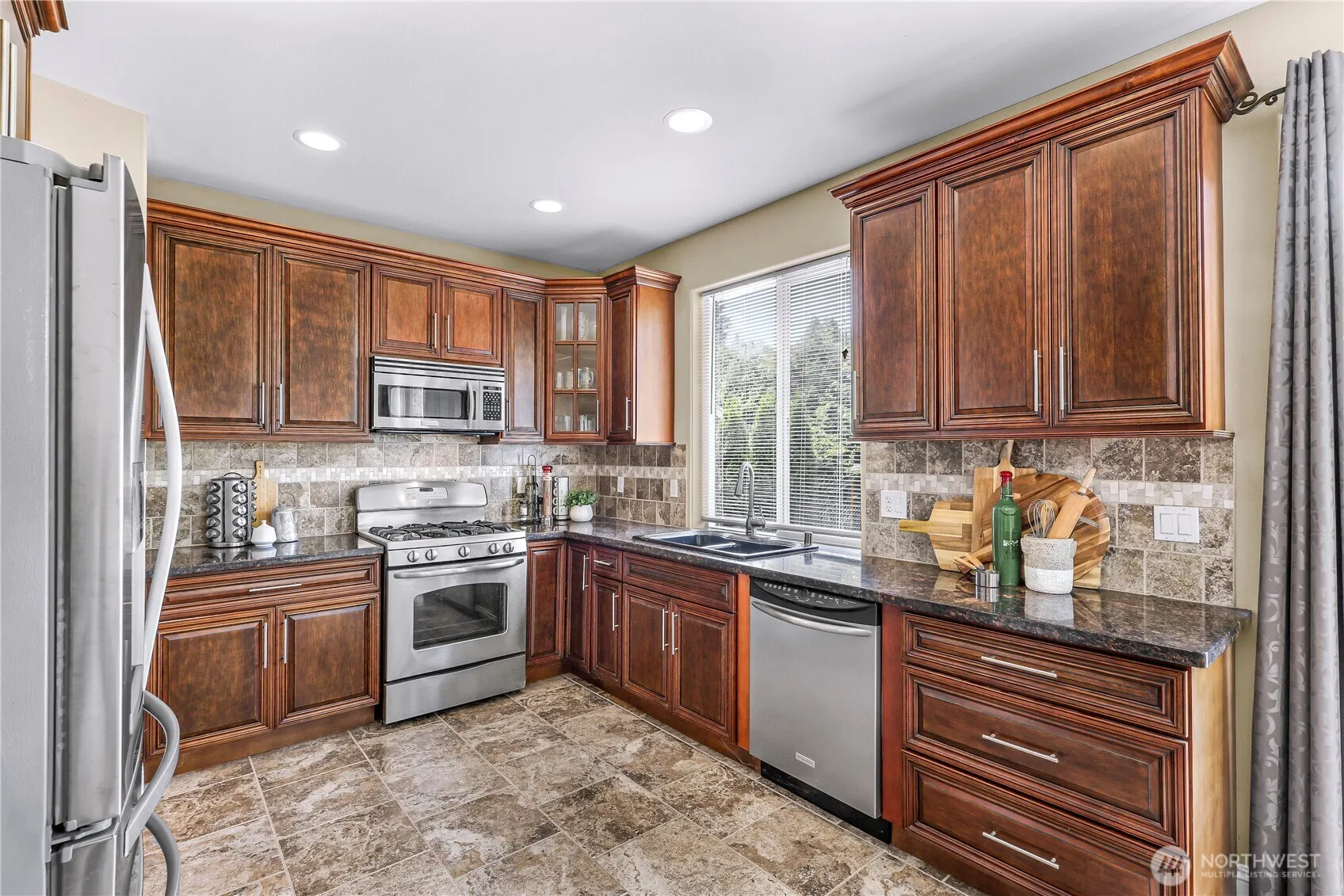 Beautifully built custom single-level home with mountain and territorial views in a quiet Maple Falls neighborhood. Enjoy a spacious layout with a large front entry, living room, and family room with a cozy stone gas fireplace. Lots of big windows for natural light. The kitchen offers solid granite counters, stainless appliances, pantry, and abundant cabinet space. Primary suite features a walk-in closet, soaking tub, and separate shower. Includes 9’ ceilings, crown molding, travertine-style tile floors throughout, laundry room off the garage, washer & dryer included, fully fenced yard, storage shed/shop, two-car garage with air and power hookups, long flat driveway, and newer exterior paint. Move-in ready!