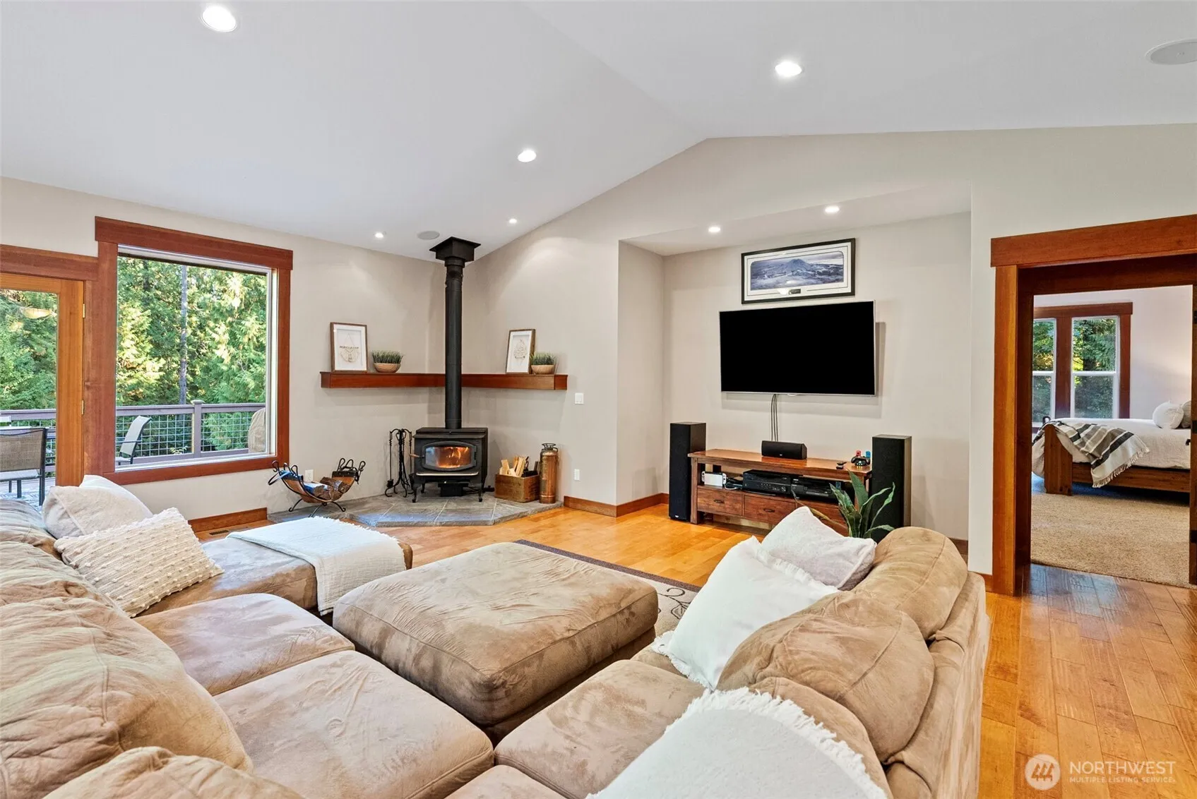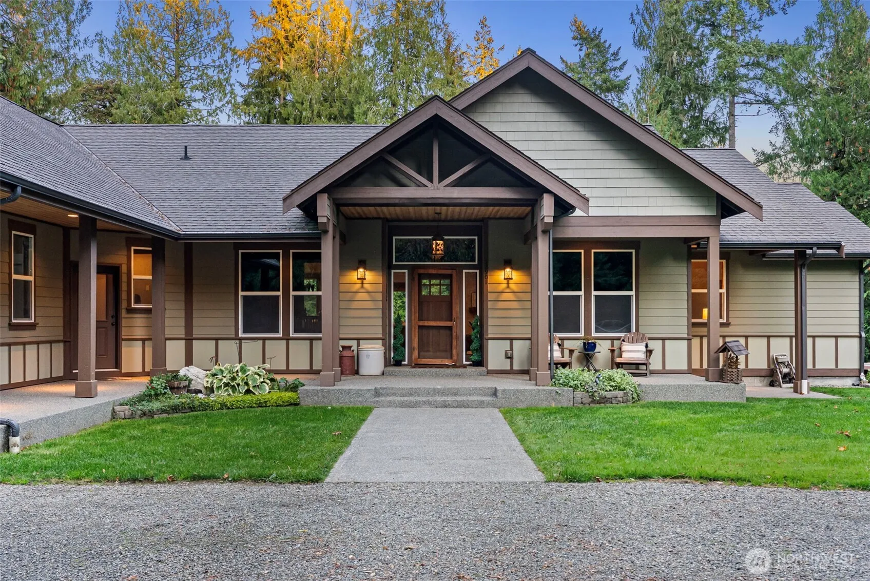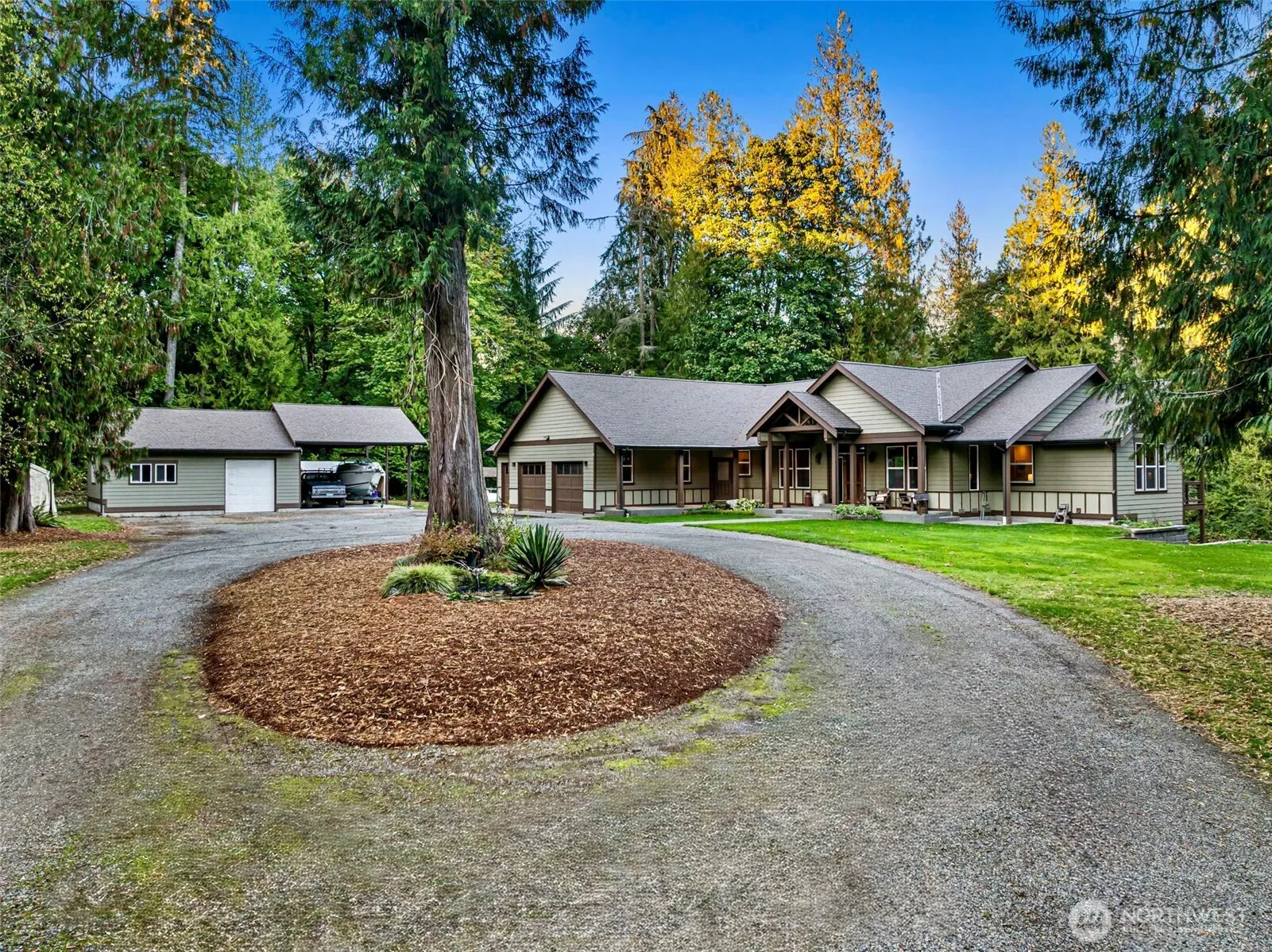 Peaceful living mins from town in this stunning custom-built craftsman on 5 private usable acres. Designed for comfort & function, this 4 bdrm + office home offers single-level living w/ finished daylight basement plumbed for kitchenette ideal for guests, rental, or multigenerational living. Gourmet kitchen w/ bar seating, quartz counters & seamless flow into open living spaces filled w/ natural light. Step outside to expansive deck surrounded by trees, wired for hot tub, w/ outdoor shower & under-eave outlets ready for holiday lights. 25×30 shop w/ 25×20 carport for RV or boat. 3-car garage, whole-home speakers, generator hookup, irrigation-ready yard, chicken coop, wood-burning stove, A/C. Perfect blend of space, serenity, & convenience!