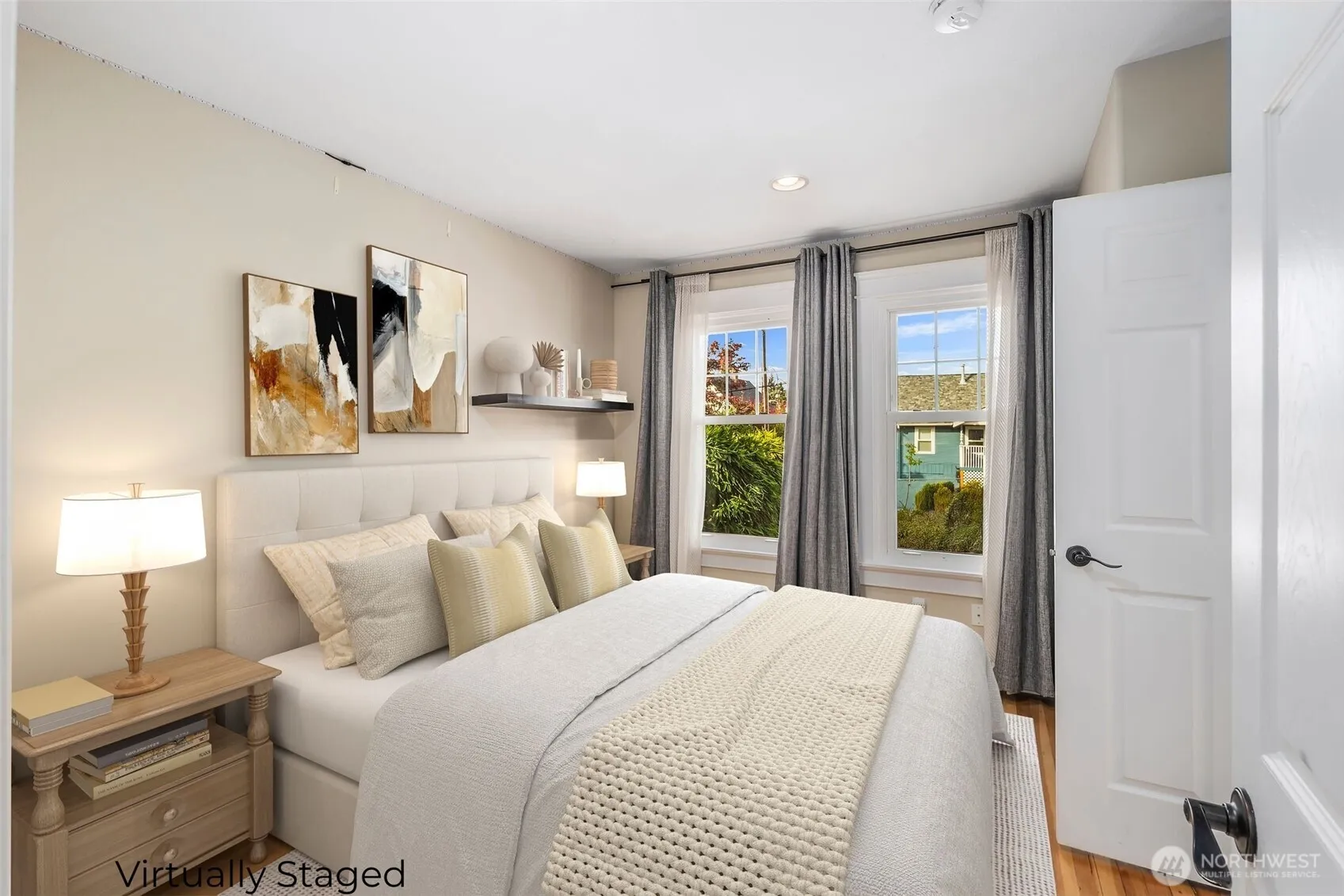 Live upstairs and rent downstairs, or spread out across all 4 bedrooms in this versatile 1,668 sq ft two-level home just steps from the Naval Shipyard. Each level features 2 bedrooms, a full bath, comfortable living space, and outside access; perfect for guests or rental income. Original fir floors and a wood-burning fireplace bring timeless warmth, complemented by a bright, open kitchen and dining area. The lower level offers a convenient storage room with double-door exterior access adjacent to the laundry. Step outside to your retreat: front patio, fully fenced backyard with a green house and shed, gated fence access, and both front and rear parking. All appliances, tools, and extras included.