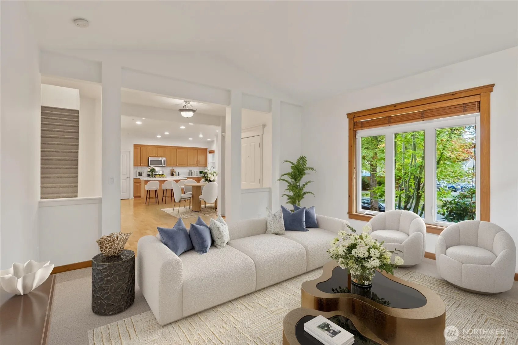 Lovely townhome nestled in the heart of Snoqualmie Ridge. End-unit with LOTS of windows & vaulted ceilings lives like a single-family home. Perfect floorplan, featuring a main floor primary suite, wide open living/entertaining spaces, and a large kitchen with abundant storage & prep space. The 2nd bedroom is tucked upstairs with its own bath, and the spacious loft is a great flex space- could be a media room, office, or easy conversion to a 3rd bedroom. Located on an idyllic street with beautiful mature trees, blocks to shopping, dining, parks & amenities. Sip coffee and watch the world go by on the charming front porch, or retreat to your private yard for a peaceful break. Absolutely turn-key, with brand new paint & carpet. Welcome Home.