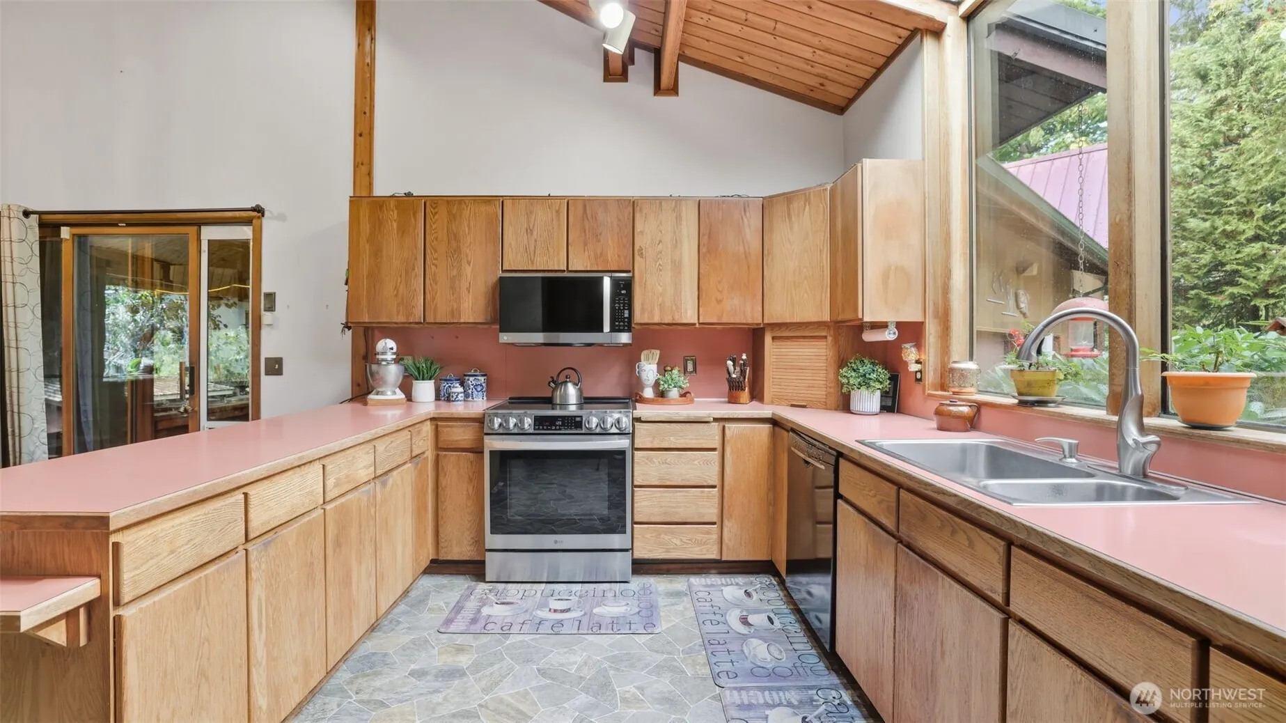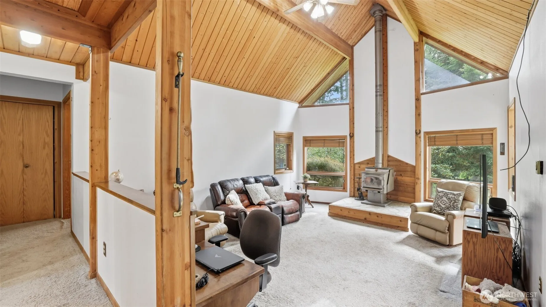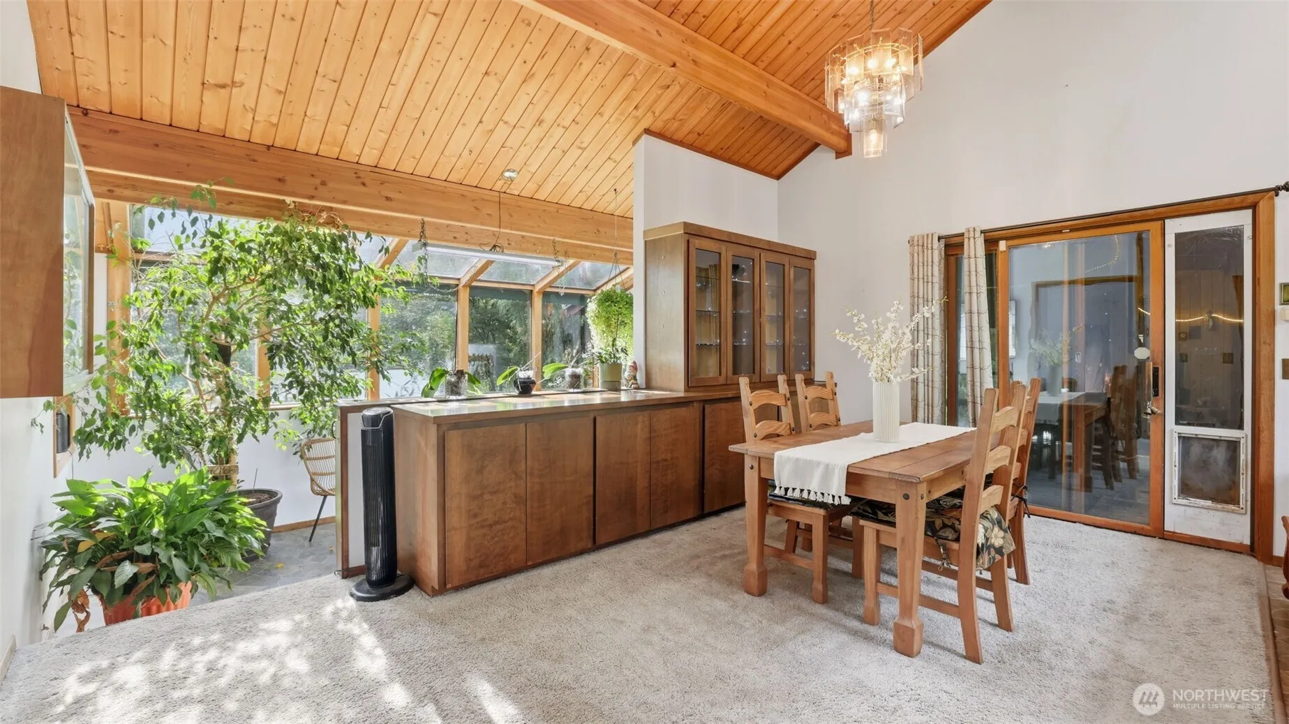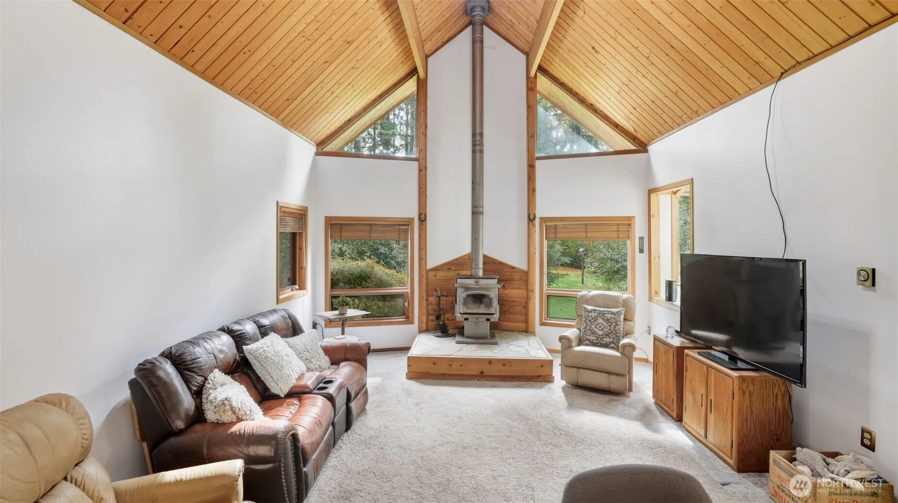 Welcome to Enumclaw! This cozy two-bedroom, one-bath (1/2 bath in garage) Lindal Cedar Home is situated on a spacious 37,796 sq ft level lot. Enjoy an enormous, covered party deck, perfect for entertaining, & a spacious 3 car garage with RV Bay & huge storage room above garage. Vaulted wood ceilings throughout with exposed beams, & a cozy wood-burning fireplace that heats the entire home. Solarium overlooking backyard, built-in desk and buffet. Outbuildings w/potting shed that has running water & bunkhouse/playhouse. Cold room w/heater for canned goods. Metal roof. New carpet prior to closing. Minutes to downtown Enumclaw & walk to Nolte State Park & Fish Lake. Adjacent property listing #2392300 for income potential.