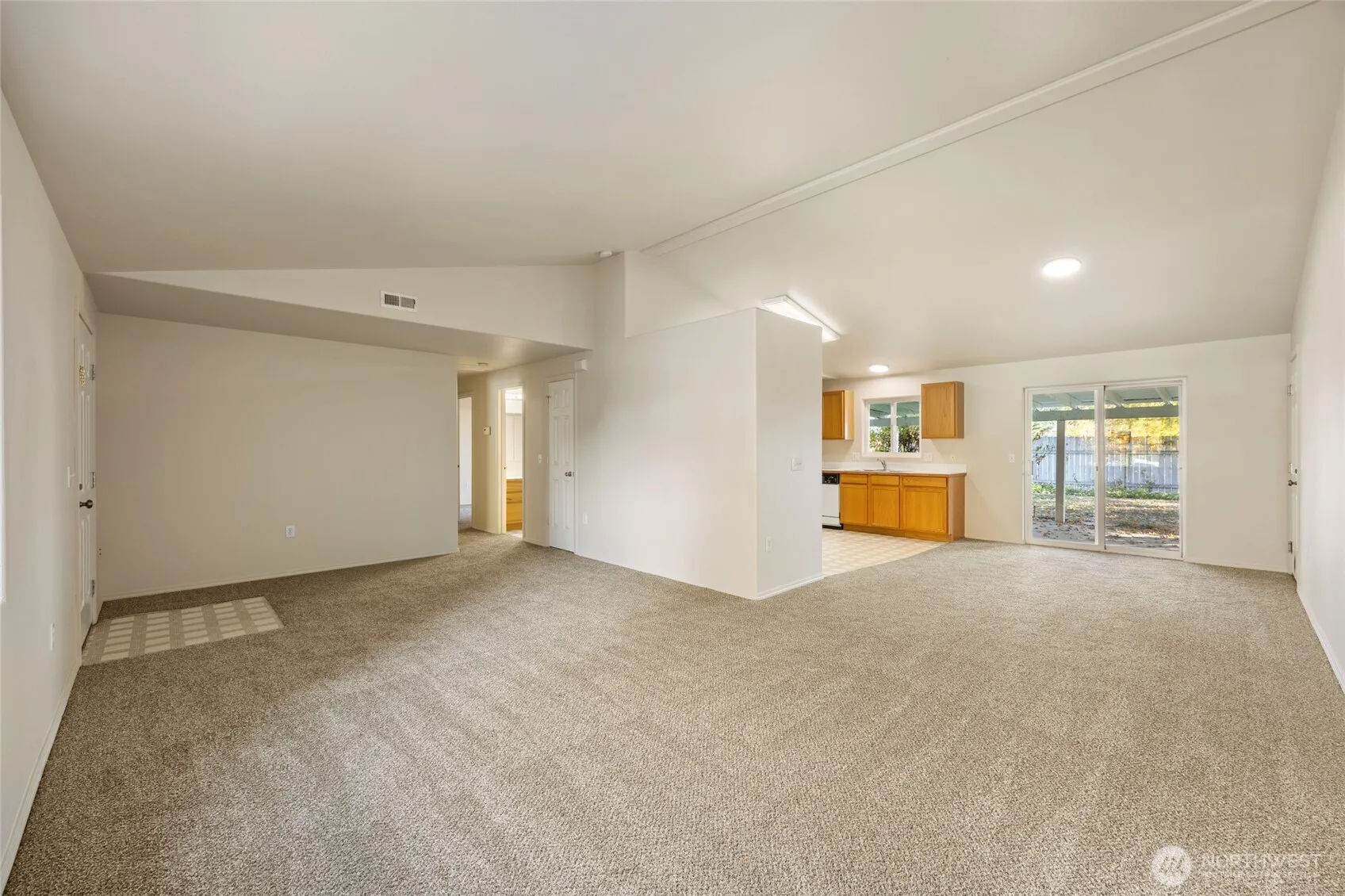 Great little 2-bedroom, 2-bath rambler tucked away in the back of a cul-de-sac. Home has a HUGE fully finished garage with office space for all of your shop projects; and large private backyard with full length covered patio. Brand new carpet and interior paint in this lovely home. Primary bedroom with 2 closets has an attached full bath. Additional bath off the hall, serves the other bedroom and guests. Spacious kitchen with dining area and laundry closet close-by.