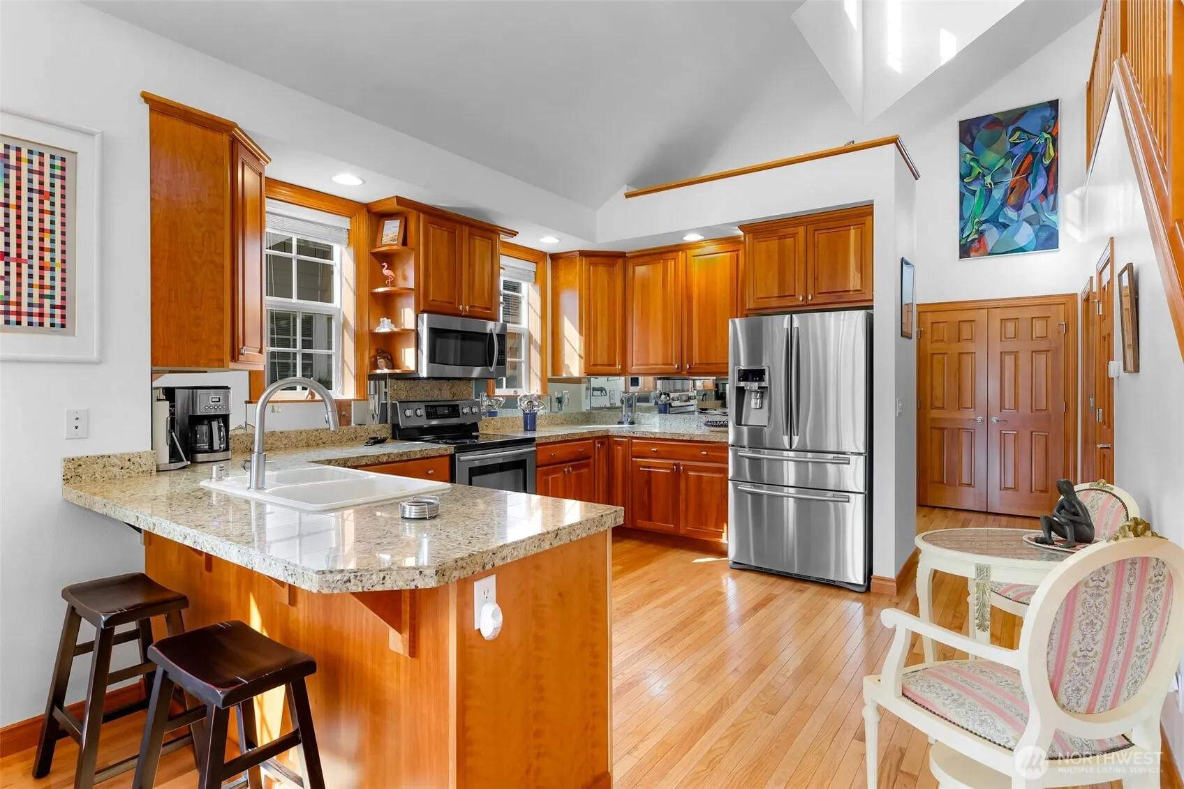 First time on the market for this stunning Homestead home on the 17th tee! With views of Mt. Baker & the Twin Sisters, this beautiful 3 bed + office space, 2.5 bath home boasts custom features including hardwood floors throughout, spacious kitchen with granite countertops & stylish tile finishes. Light floods the main living space with soaring vaulted ceilings & granite fireplace. Retreat to the main level primary suite with en suite bathroom, jetted tub, bidet toilet, walk-in closet & private deck. Bedroom closets have custom closet organizers & all windows are coated with UV protection. The spacious garage features an epoxied floor & wash basin with plenty of room for parking & storage. Schedule your private showing today!