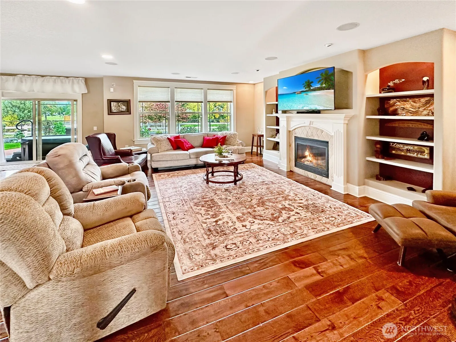 Beautiful, Craftsman Style Rambler, 55+ gated community in West Longview! Elegant entry w/Travertine tile floor & gorgeous front door w/transom & side lights. Open & airy great rm w/rich engineered hardwd flrs, surround sound, gas fireplace w/custom built-ins, spacious dining w/easy access to covered rear patio w/hot tub, gourmet style kitchen w/granite slab counters, stainless appliances, planning desk, island w/eating counter & oak cabinets. Spacious primary bdrm w/5 piece bath w/heated tile flr, full tile walk-in shower & lg walk-in closet. 2 additional bdrms w/easy access to 3/4 bath. Fenced rear & side yards w/views of the canal waterfront & bird activity. 2 car garage, bonus/hobby rm, AC, Sprinker system. Club house & walking trails.
