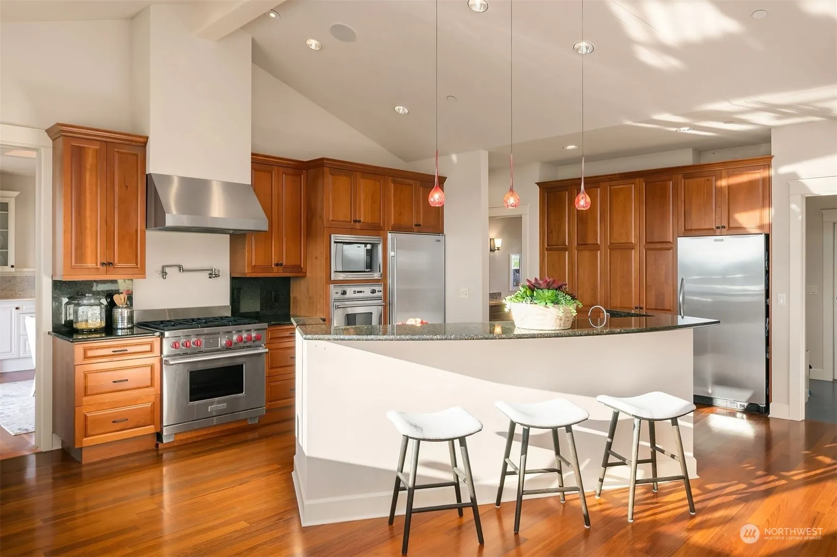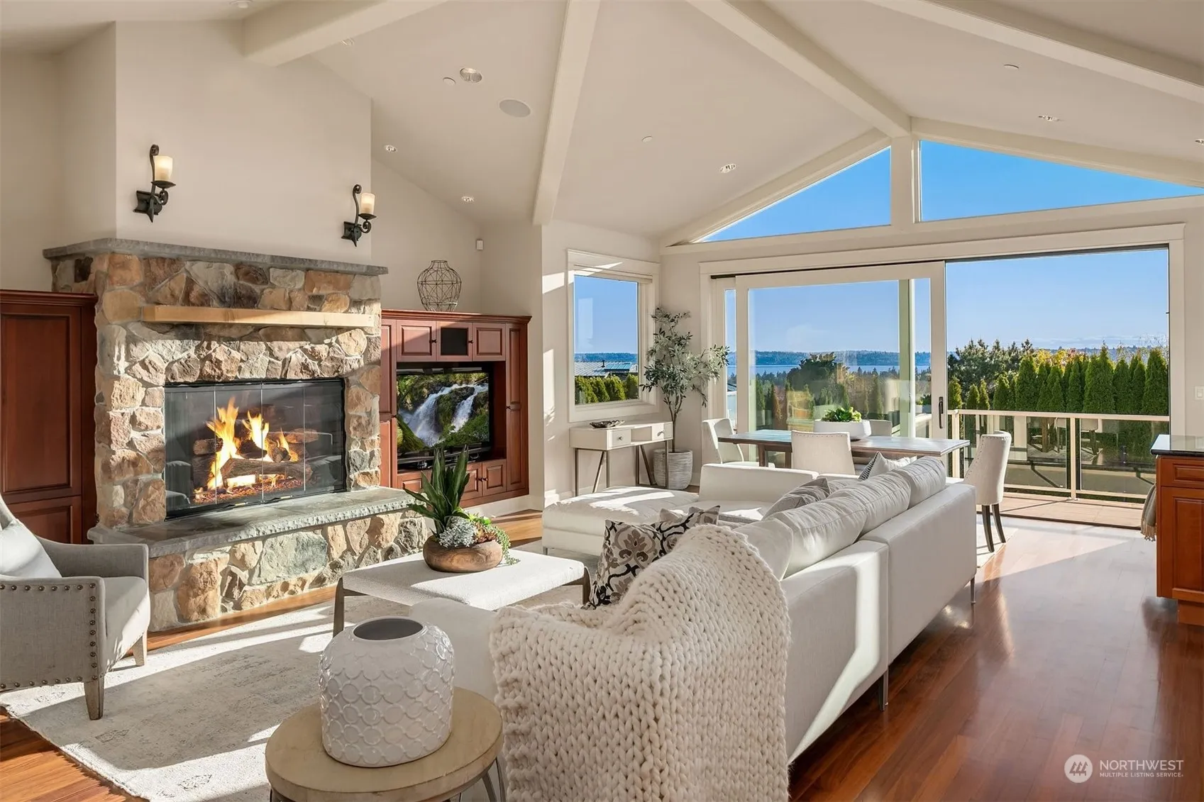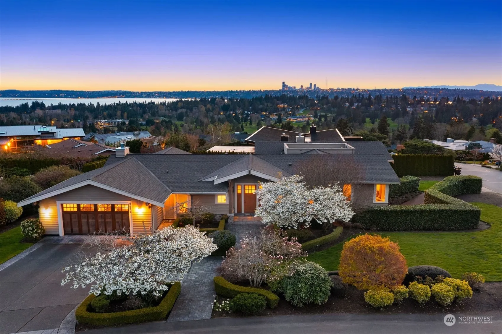 Stunning luxury estate in Clyde Hill’s coveted Mercia neighborhood with sweeping western lake, city & mountain views. Meticulous 2023 renovation showcases beautiful quality materials and thoughtful floor plan. Inviting 2-story home with 5 bedrooms, walls of windows, vaulted ceilings, two living suites, generous decks and patios, and tranquil gardens offers unparalleled living in this prized community. Expansive main level great room invites entertaining, with glass doors leading to spacious decks, all oriented to the views. Open chef’s kitchen hosts granite eating counter and high-end stainless appliances. Luxurious main-level primary suite with spa bath. Lower 2nd living suite with 2 bedrooms, game room, great room, wet bar & home theater.