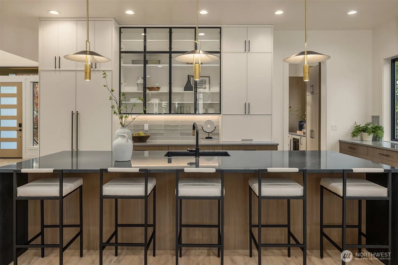 Perched above Issaquah’s lush tree line w westerly views, this newly built Veristone Homes balances modern elegance w natural tranquility. A grand entry opens to sunlit interiors illuminating wide-plank oak floors. The chefs kitchen impresses w an 11ft double waterfall island, Hestan range w pot filler, Monogram appliances, & full scullery, inviting gatherings & quiet moments alike. Downstairs, herringbone floors flow through the spacious lower level featuring media room & studio w 2nd kitchen & private, no-stairs entry—ideal for guests or extended living. Upstairs, 4 ensuites include a serene primary suite w heated floors, soaking tub, & windows framing peaceful green vistas. Turf yard, covered patio, & refined finishes complete this home.