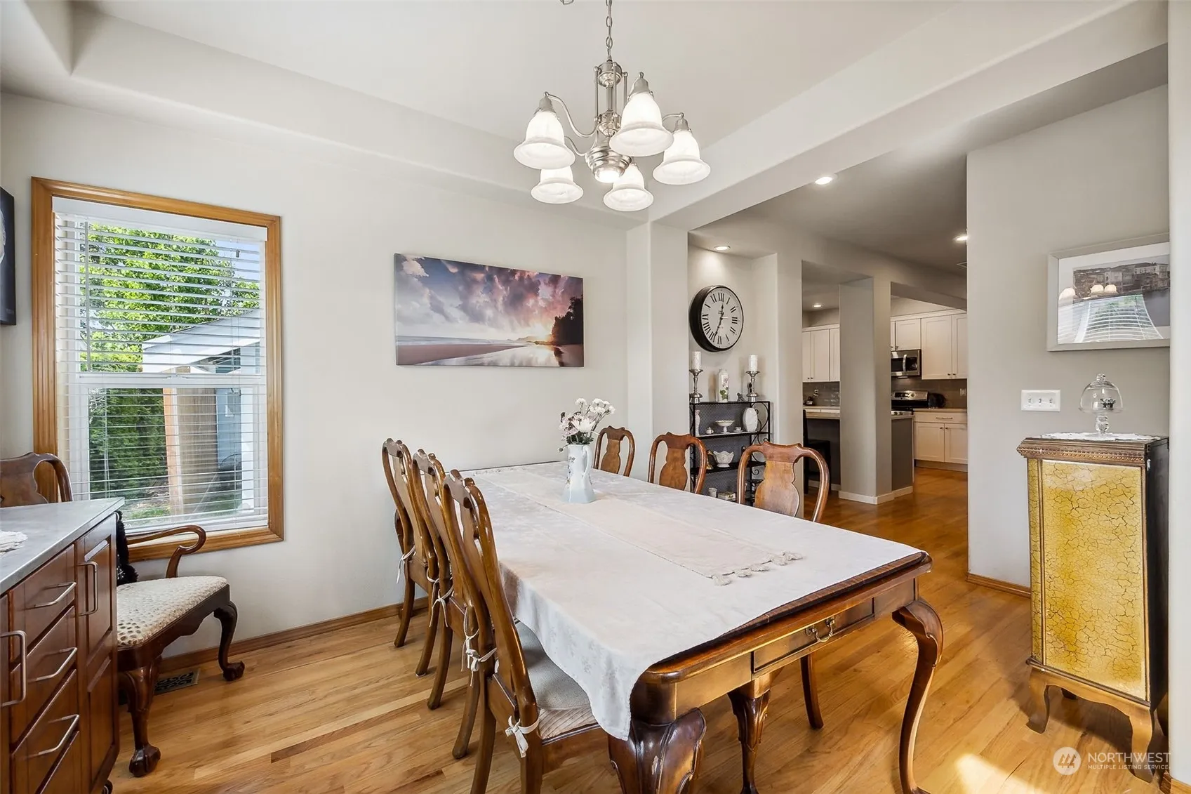 Enjoy Mt. Rainier & the Cascade Mountain views from this stylish contemporary home. Living room w/vaulted ceilings, soaring windows for abundant sunlight and views. A few features include oak hardwood floors, beautiful family room w/gas fireplace, elegant spindle staircase. Remodeled kitchen w/quartz counters, large eating bar, tons of counter space w/ farm style sink & stainless-steel appliances. Two pantries, main floor utility room w/extra shower& access to the backyard & garage area for easy cleanup after a day of gardening. 4 bedrooms plus den/office w/glass French doors. Double French doors into the primary suite. Recently painted interior, A/C, fenced backyard w/alley access, newer deck, all located on a quiet dead-end street.