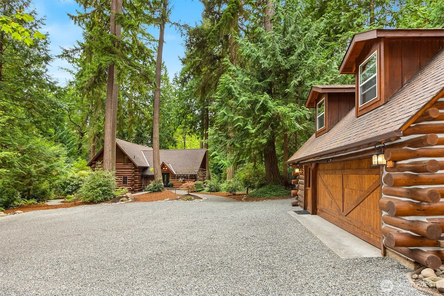 Charming log home on over 2 private acres feels like a sanctuary! This wooded oasis has it all and features inviting decks, cozy fire pit, beautiful landscaping, winding walking paths, 2 newly built standalone studio spaces, and an additional detached private guest space. Sunlight streams through abundant windows, skylights and French doors, enhancing the rich wood details throughout the home. Recent upgrades include a newer roof, updated kitchen, expansive primary bath, and more. Guests will enjoy their own multi level private retreat above the detached 2-car garage, complete with balcony, skylights, and a bathroom. Immerse yourself in this peaceful sanctuary, where nature and wildlife abound. Experience this special slice of island magic!