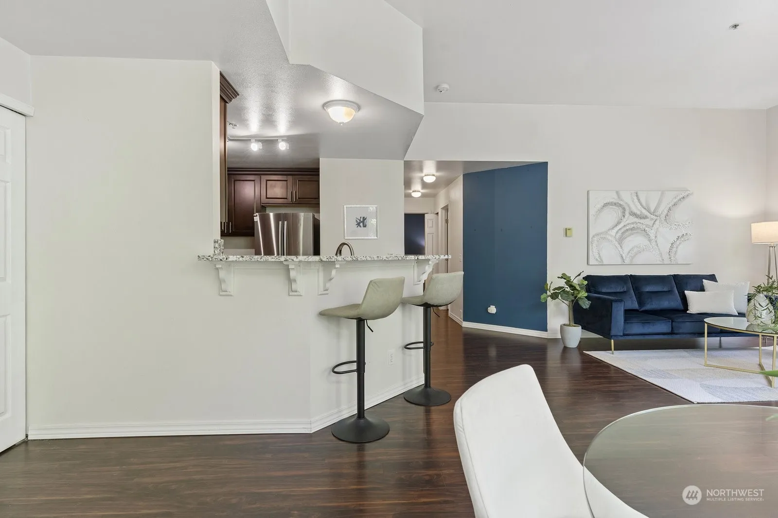 Welcome home! Rare, secluded top-floor end unit, this 2-bed, 2-bath is the perfect blend of tranquility & modern comfort. Step inside to discover vaulted ceilings, an open floorplan & a balcony overlooking green space.Updates include sleek flooring throughout & upgraded countertops that add a touch of luxury. Cozy evenings by the fireplace in the living room, gather in the dining room, complete w/extra seating at the kitchen breakfast bar. The primary bedroom boasts an ensuite bath w/double sinks & a spacious walk-in closet. The attached one-car garage has additional storage space, guest parking nearby. NO rental cap & pet friendly. All appliances included, this condo is truly move-in ready. Don’t miss out on this opportunity.