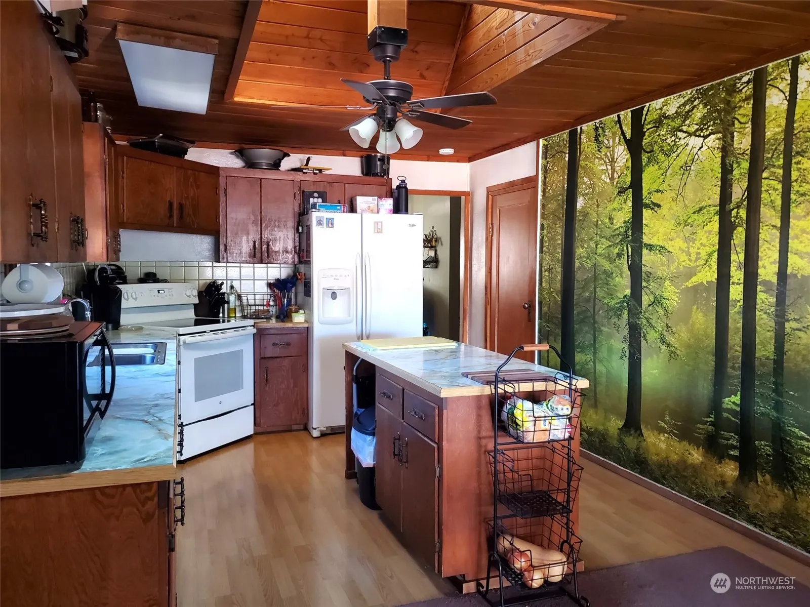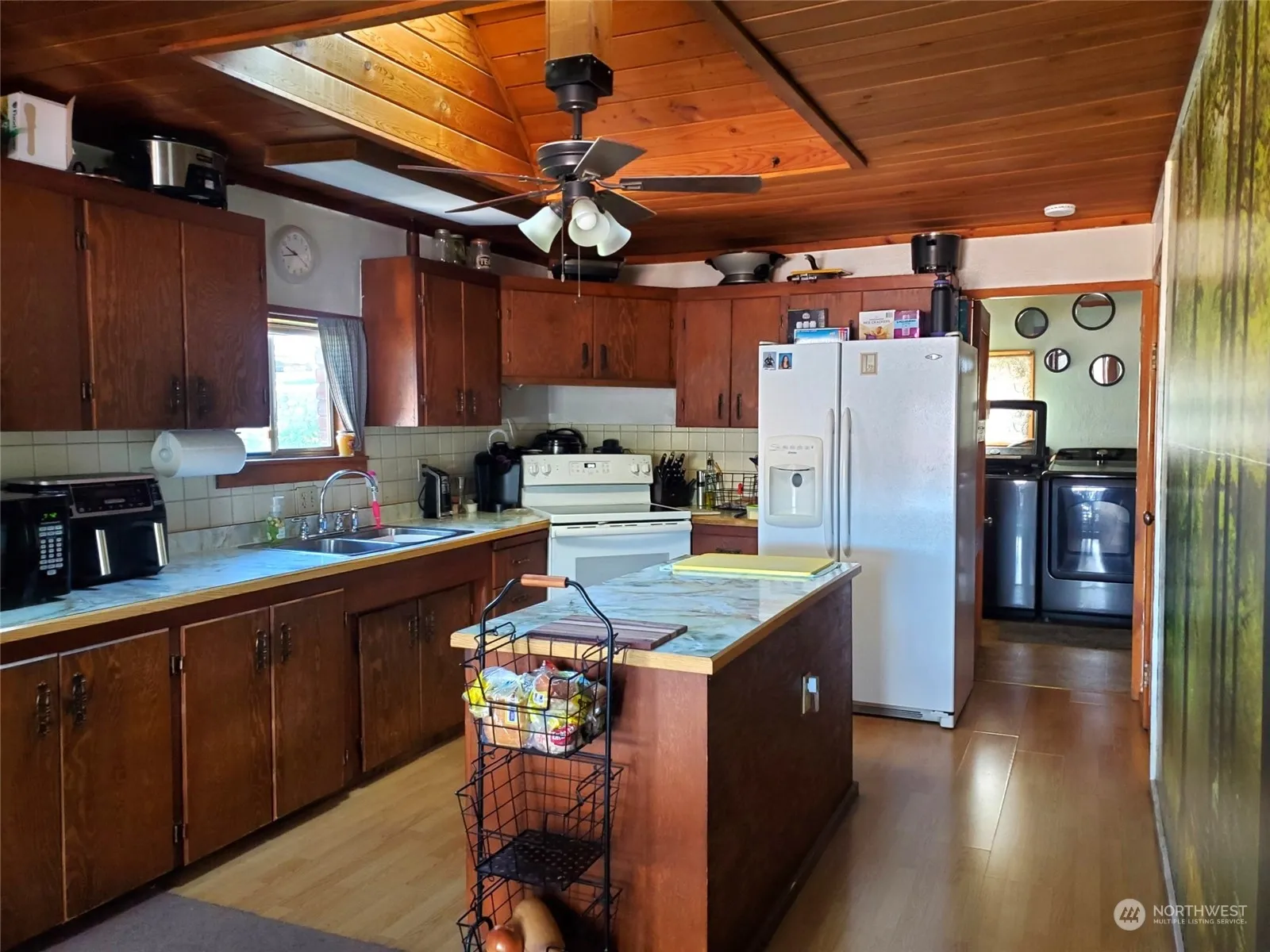 Beautifully maintained older home nestled on a corner lot with a fully matured and manicured yard. This charming home has a nice bright kitchen with a skylight and plenty of cabinet and counter space. Nice dining space with access to the covered deck, perfect for BBQ’s and entertaining. Beautifully landscaped fenced yard with stone retaining wall, established perennials and good sized garden space. Attached carport leads to attached garage offering covered parking for 3 vehicles. This cute home is right in town, making shopping, restaurants and other amenities close by.