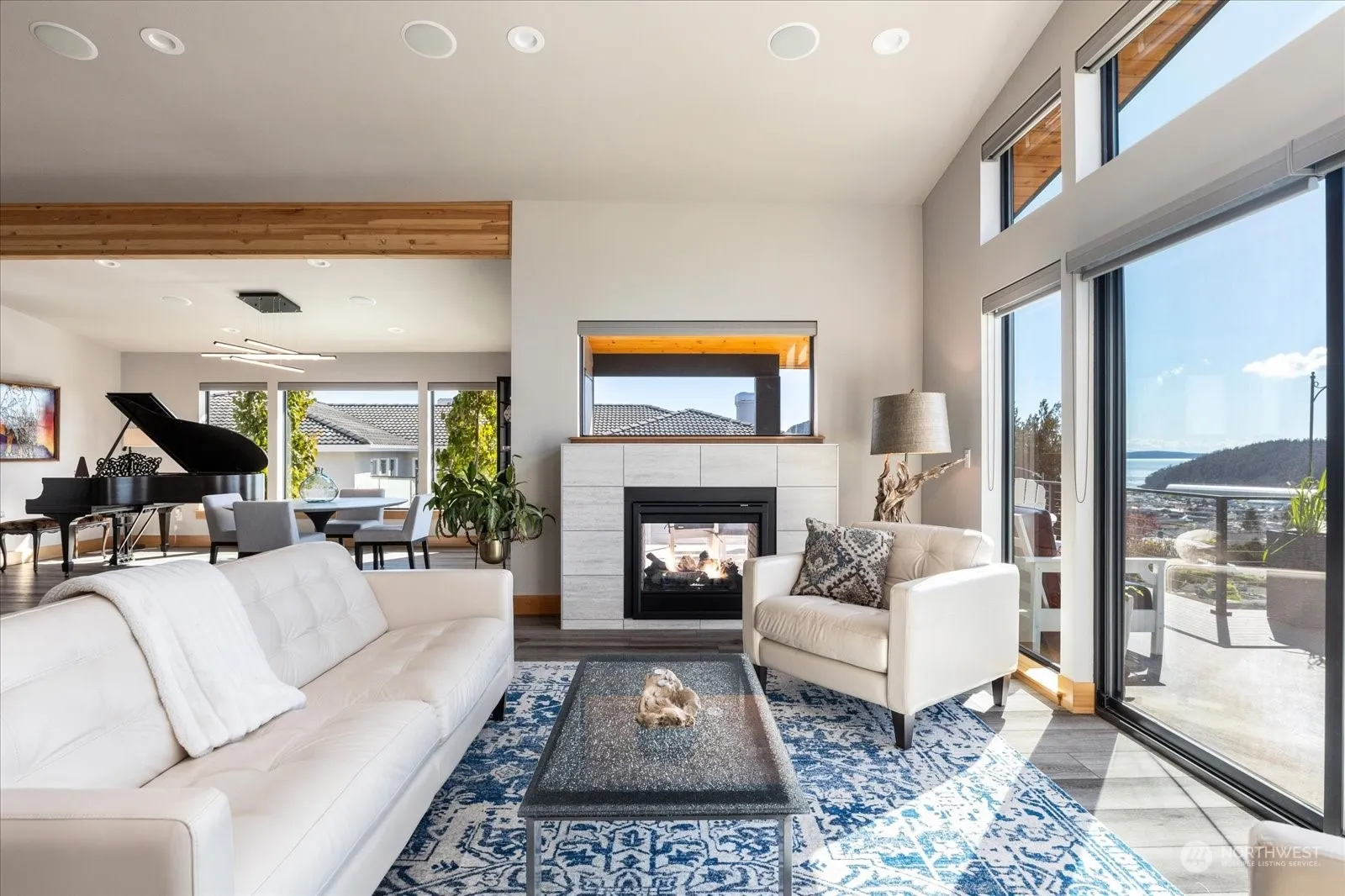 Year-round sunsets will delight you with this NW modern Anacortes home. This Skyline property has front-row NW saltwater views of Burrows Bay & the San Juan Islands and your main living spaces + bedrooms on 1 level. Living room has dramatic vaulted ceiling reaching 13′, 2-way fireplace, in-ceiling surround-sound. Kitchen features leathered granite countertops, double oven, 5.75′ x 8′ kitchen island, extensive pantry w/pull out drawers. Primary suite has vaulted ceilings, surround sound, stunning ensuite bath w/large soaking tub, closet w/ample storage. 3 more beds & laundry on main level. Luxury vinyl plank flooring throughout. 3-car garage, bonus/movie room w/surround sound. HUGE 1,002 sqft storage room/gym/flex space. RV/boat parking.