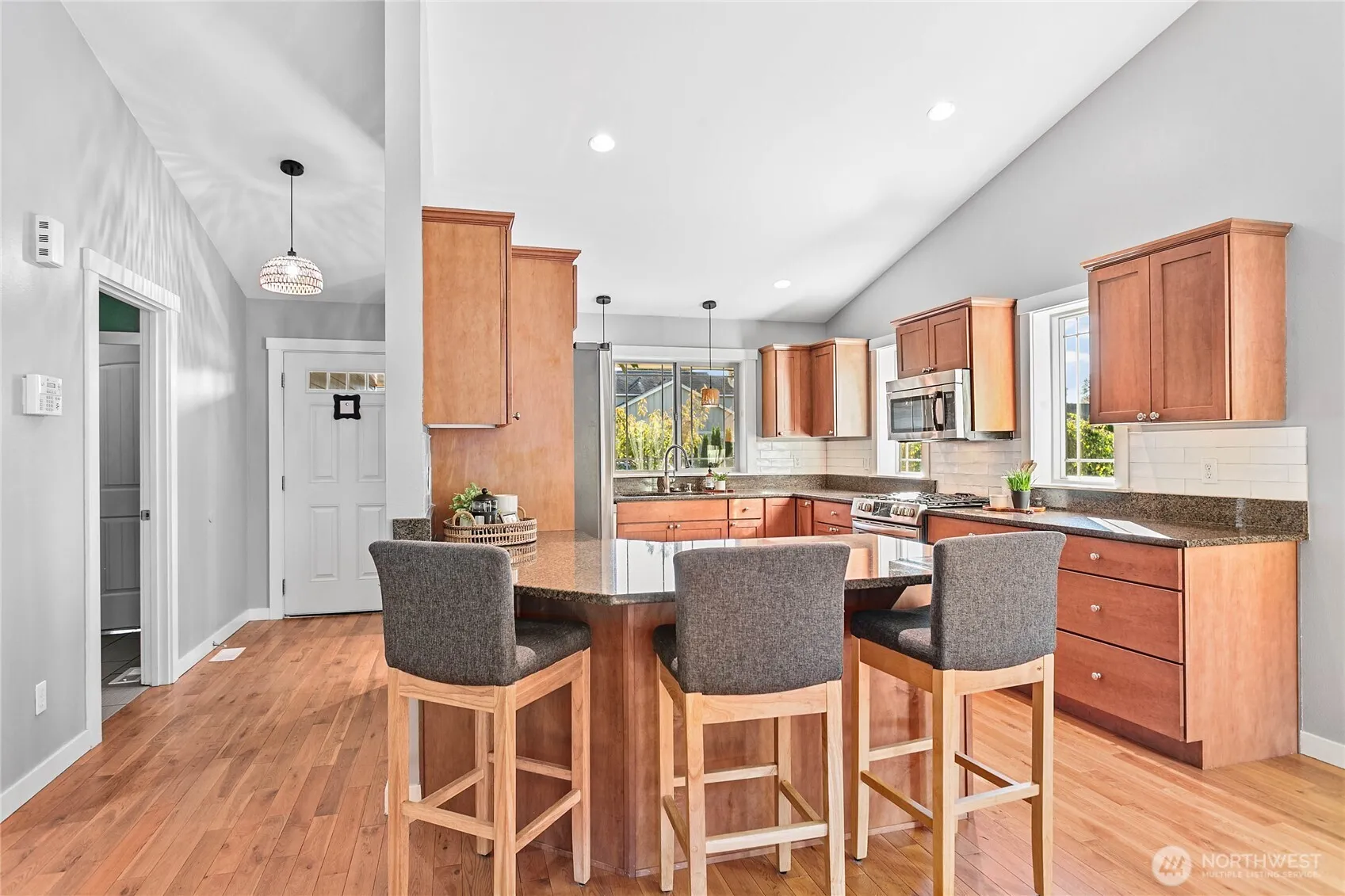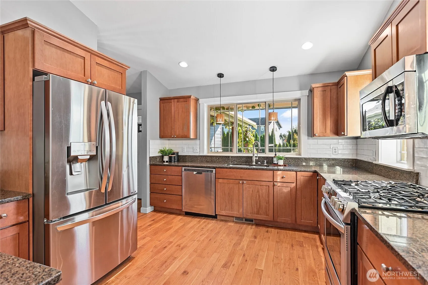 Newly sealed and painted Craftsman single level home. No HOA! Perfect entry level home, investment property or low maintenance living in desirable area. 1445 sf with spacious kitchen, granite countertops, stainless appliances, open concept space. Hardwood floors, new carpets & padding, 3 bedrooms, 2 full baths, lots of natural light, high ceilings and fully fenced yard with composite decking and outdoor shed. Natural gas forced air heating plus A/C! Large storage above garage w/ ladder access, storage shed out back. Sunny lot w/ garden beds, dwarf bing cherry and grapes. Close to city parks, trail systems, golf and local farms. Lynden’s known for being the largest Dutch settlement in WA with a charming downtown, featuring a working windmill