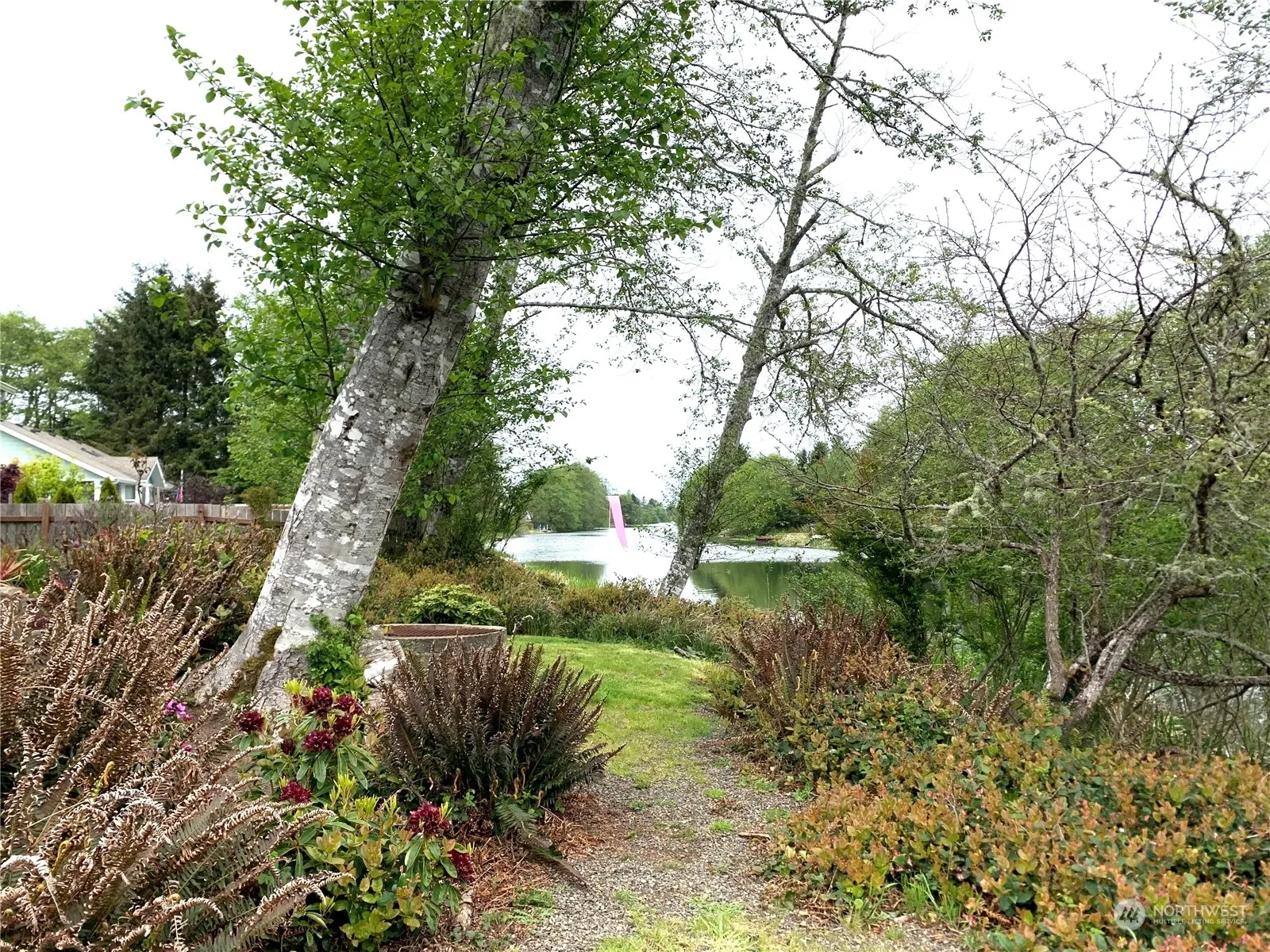 REDUCED!! — EXTRA WIDE CANAL FRONT — RV Parking — Beautiful waterfront two bedroom, two bath home nestled among landscaped trees and ferns on the Grand Canal near Damon Point Park. Enormous RV garage (24’x36′) with two stalls, plus a full size 2 car attached garage with access to the utility/mud room. Full RV hookup and parking space outside. Forced air heat pump for thrifty heat and cooling. All appliances included. Fully fenced and graveled lot with large outdoor shed; raised and fenced garden beds. Eight-two feet wide on the street and 75 feet on the water on a 150 foot deep parcel. Lot is zoned for more than one dwelling, too.