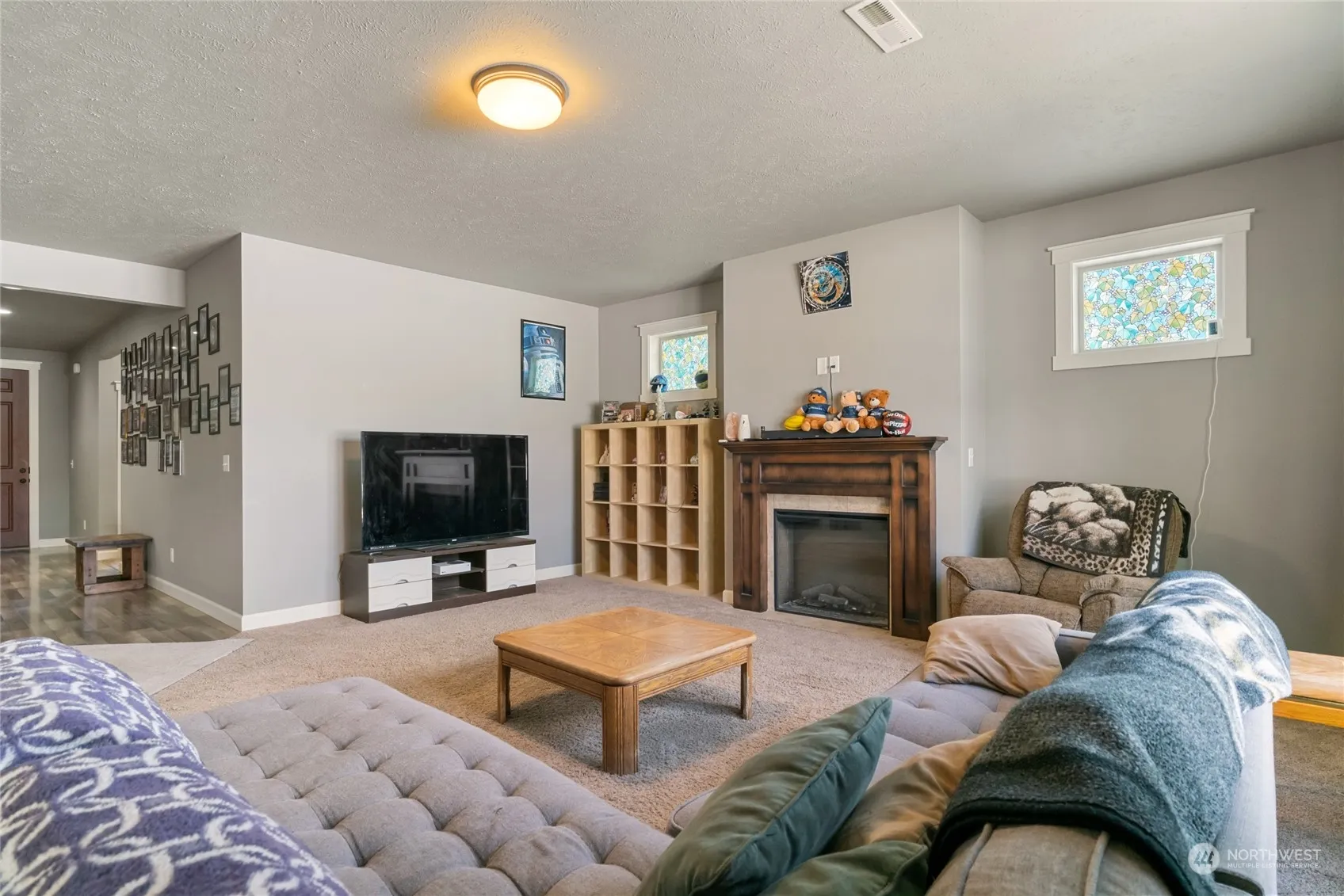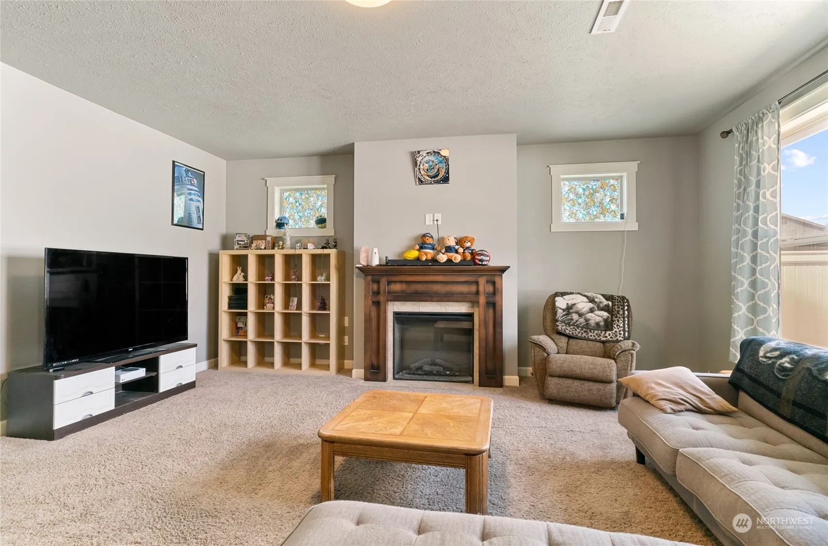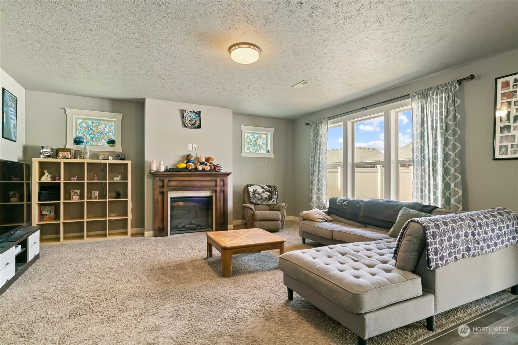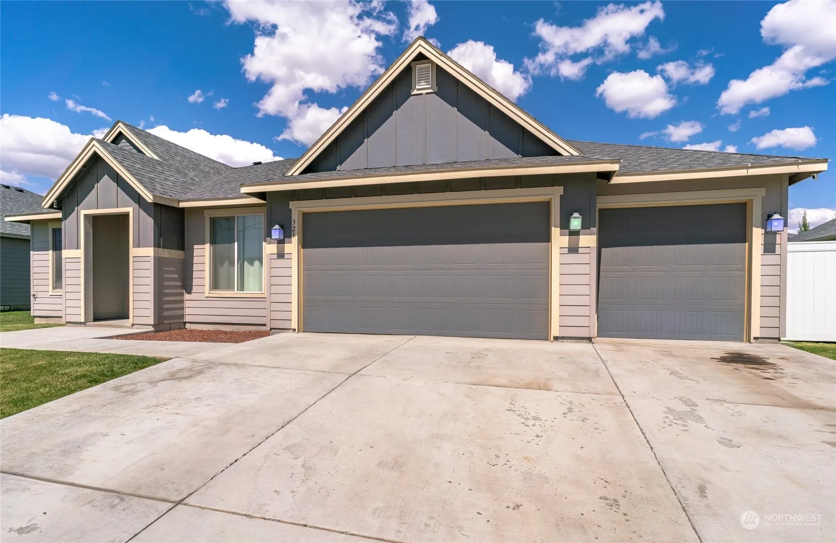 Desirable one-level floor plan with wonderful separation of space. Warm and neutral color palette throughout. Great room living open to dining and kitchen. The kitchen boasts beautiful multi-tone cabinetry, stone tile backsplash, granite countertops, a large center island, and stainless appliances. Low-maintenance vinyl plank flooring in high-traffic areas and carpet in living room and bedrooms. Walk out from glass slider to large covered back patio and large level fully fenced backyard with shed for added storage. Primary suite has large windows allowing for natural light, en-suite bathroom with large soaking tub, dual vanity, and walk-in closet. Attached garage offers room for 3 vehicles along with shop space.