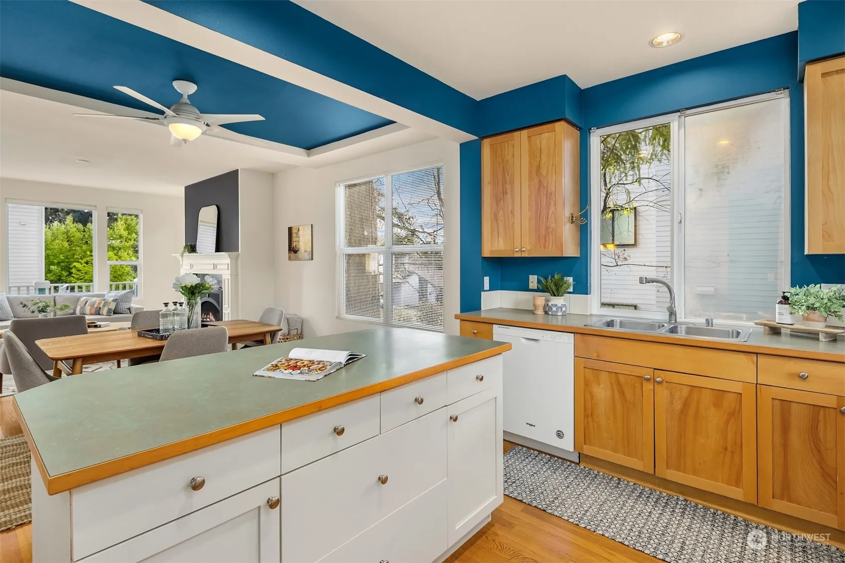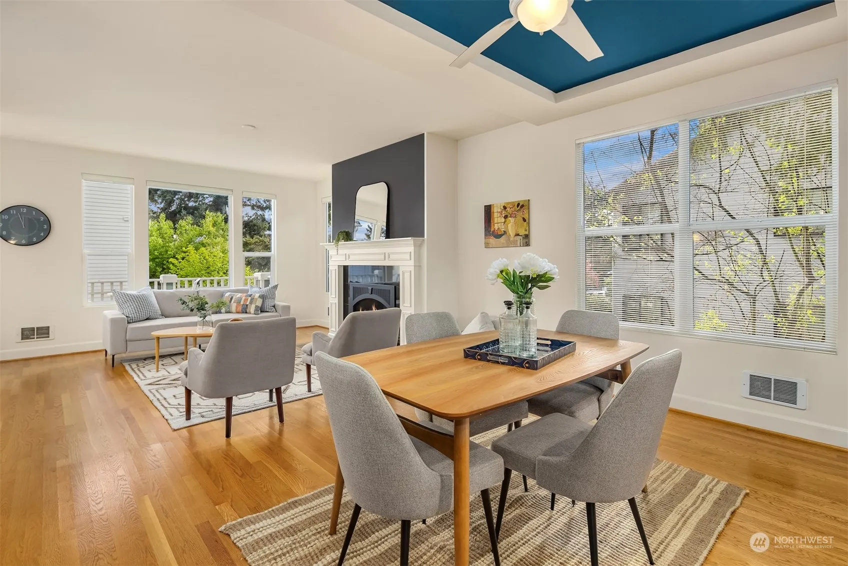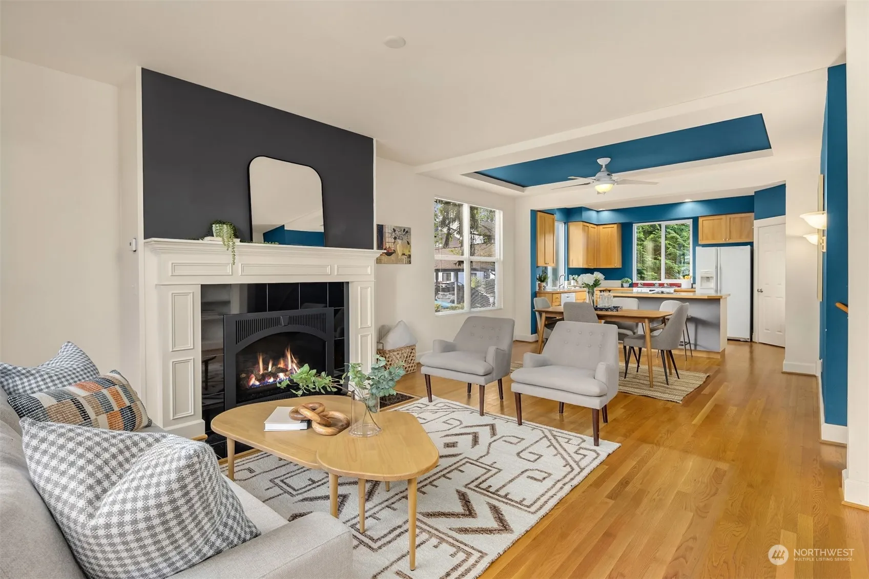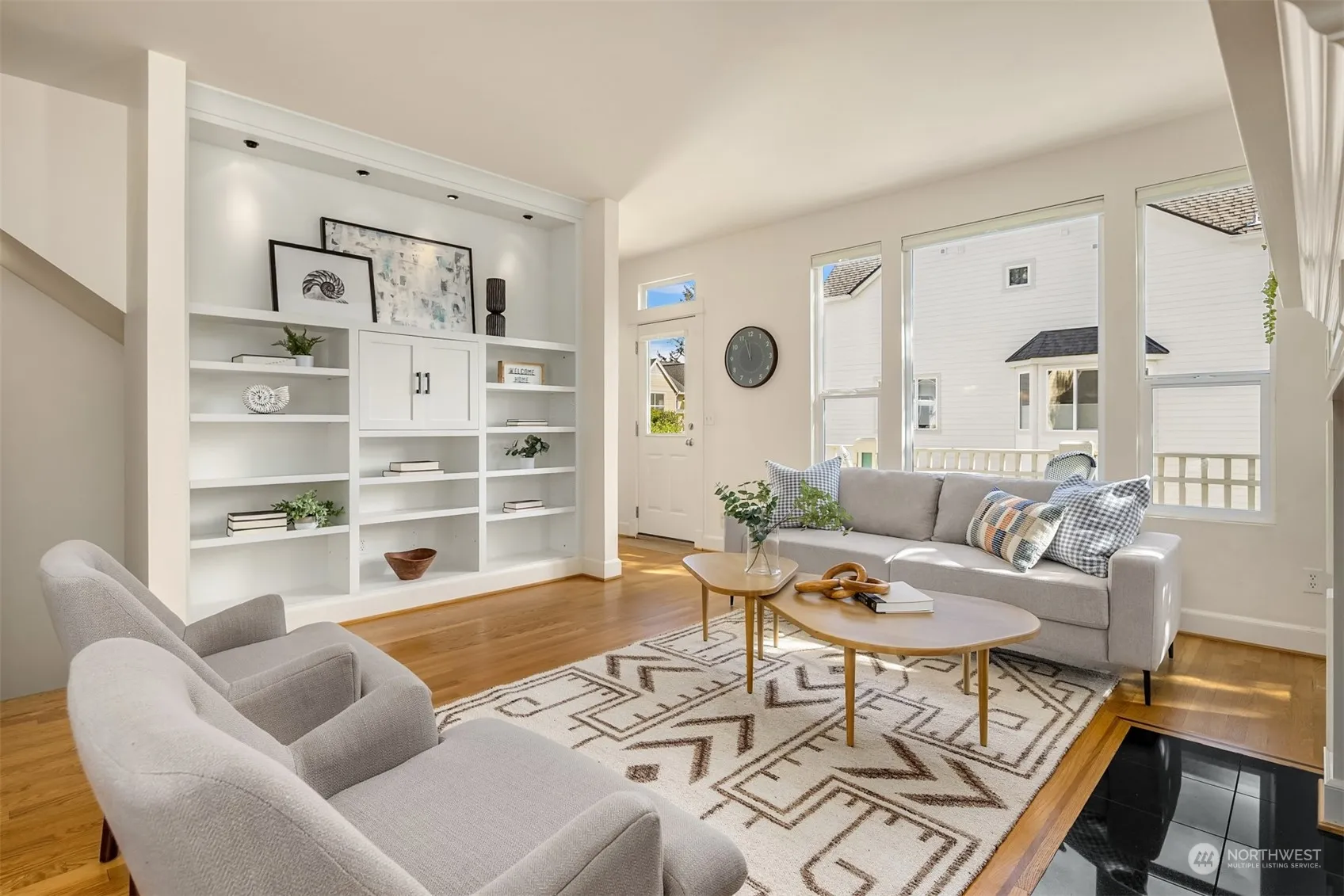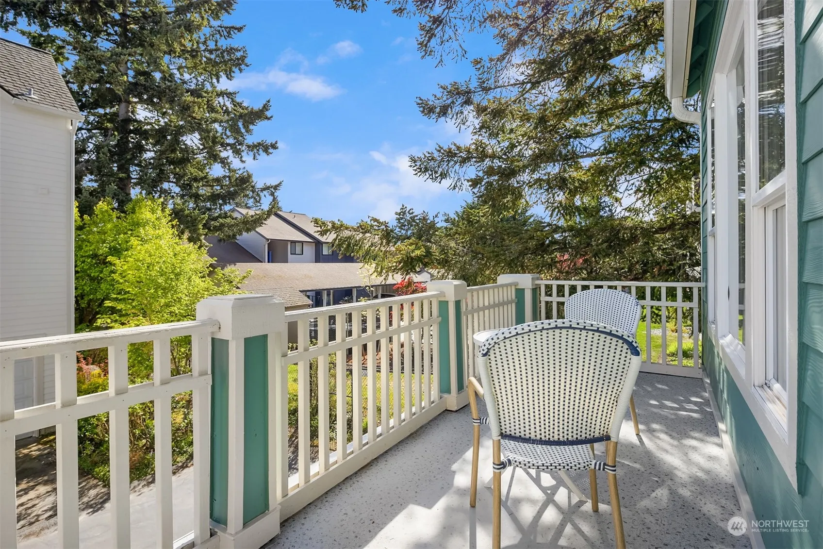 This townhome is located in the heart of town with easy access to all in-town amenities and the Seattle ferry. A perfect location tucked away in the back of this charming community with no attached neighbors. South sunlight floods the balcony and home with natural light and the private back yard is an oasis with a calming stream. Open floor plan with wood floors, gas fireplace, and built-in bookcases. Two upper level bedrooms with vaulted ceilings and a large bonus room with 1/2 bath on the entry floor. Attached private garage for additional storage. Living in town, yet in a quiet and calm setting – perfect!