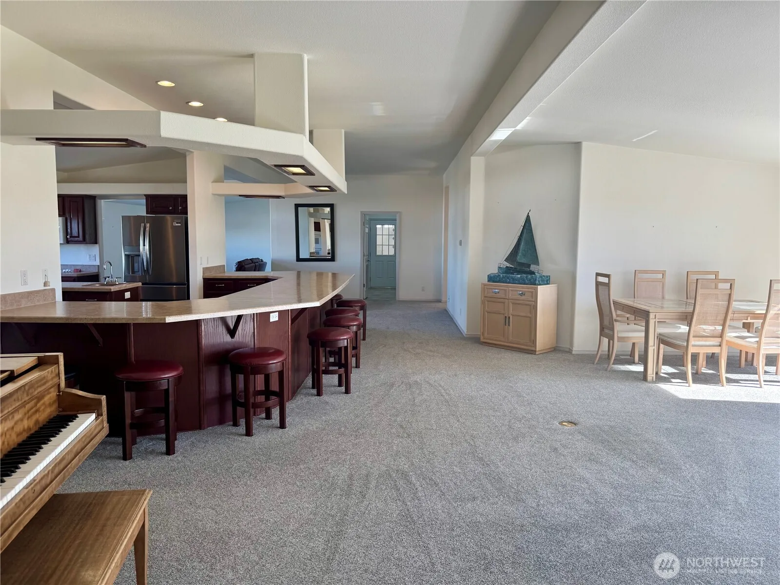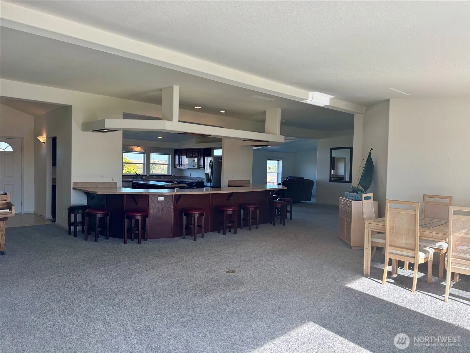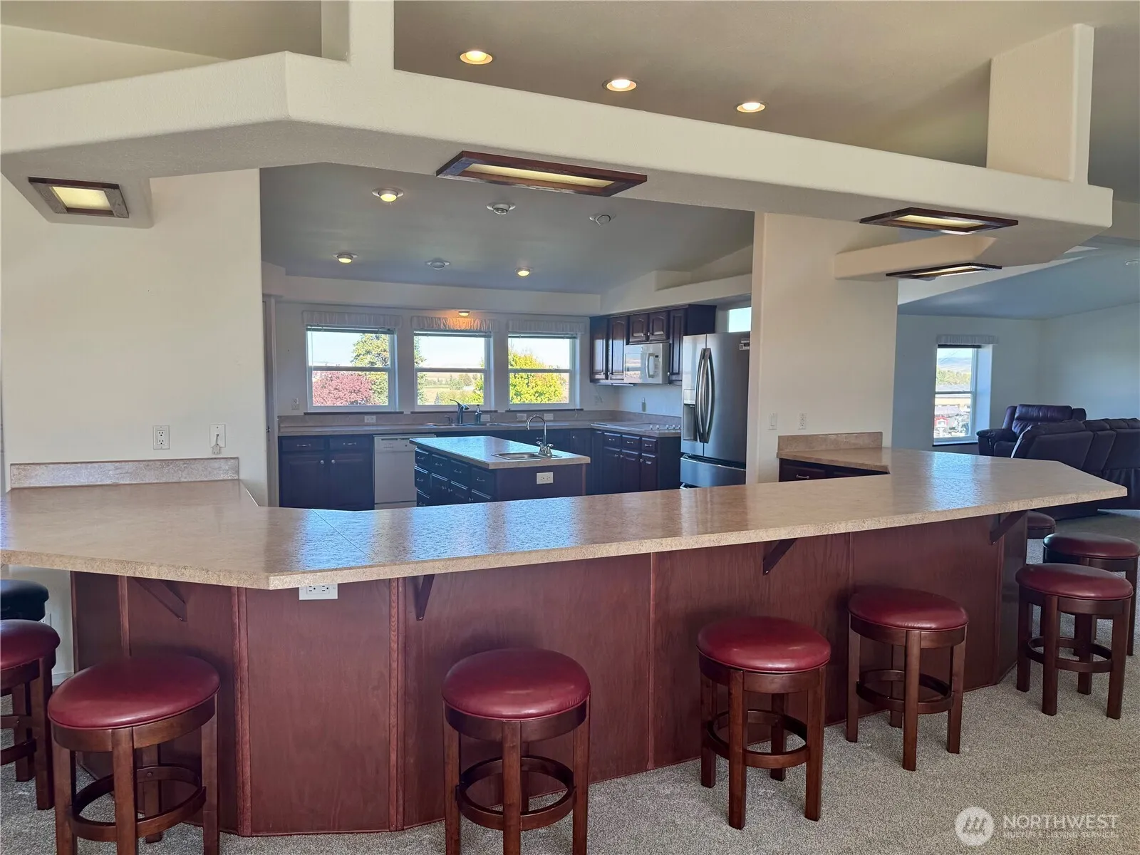 Spacious triple-wide manufactured home with 3 bedrooms, 3 baths, oversized garage, and additional shop space. The bright great room features soaring ceilings and walls of large windows, flooding the space with natural light and creating an open, inviting atmosphere. Kitchen offers a huge bar for seating, perfect for entertaining, and a propane fireplace adds warmth and charm. Expansive primary suite includes ensuite bath. Set on a park-like lot with beautiful landscaping, terraces, and mature plantings, this home combines comfort, style, and functionality with a serene outdoor setting ideal for relaxation and gatherings.