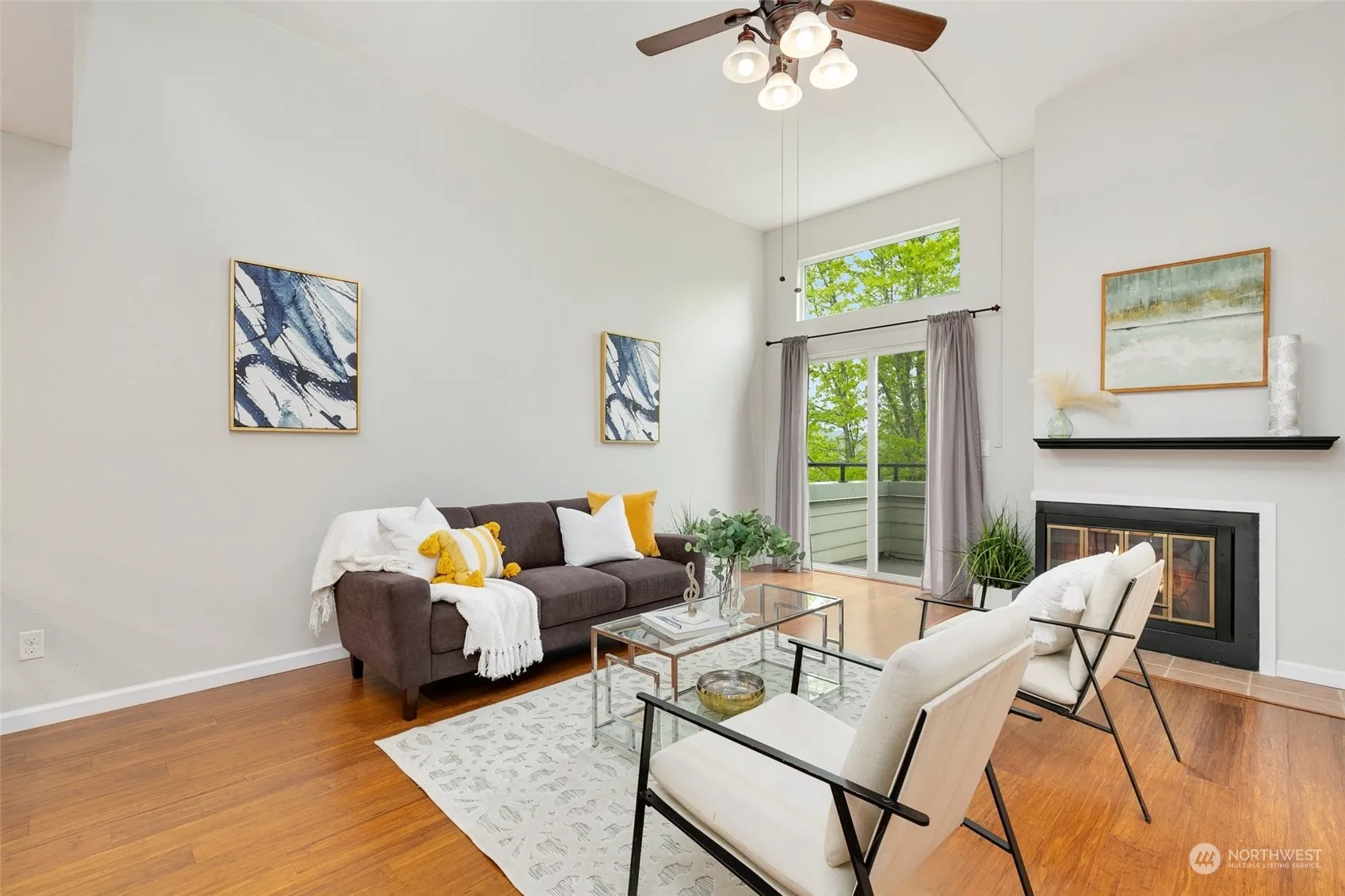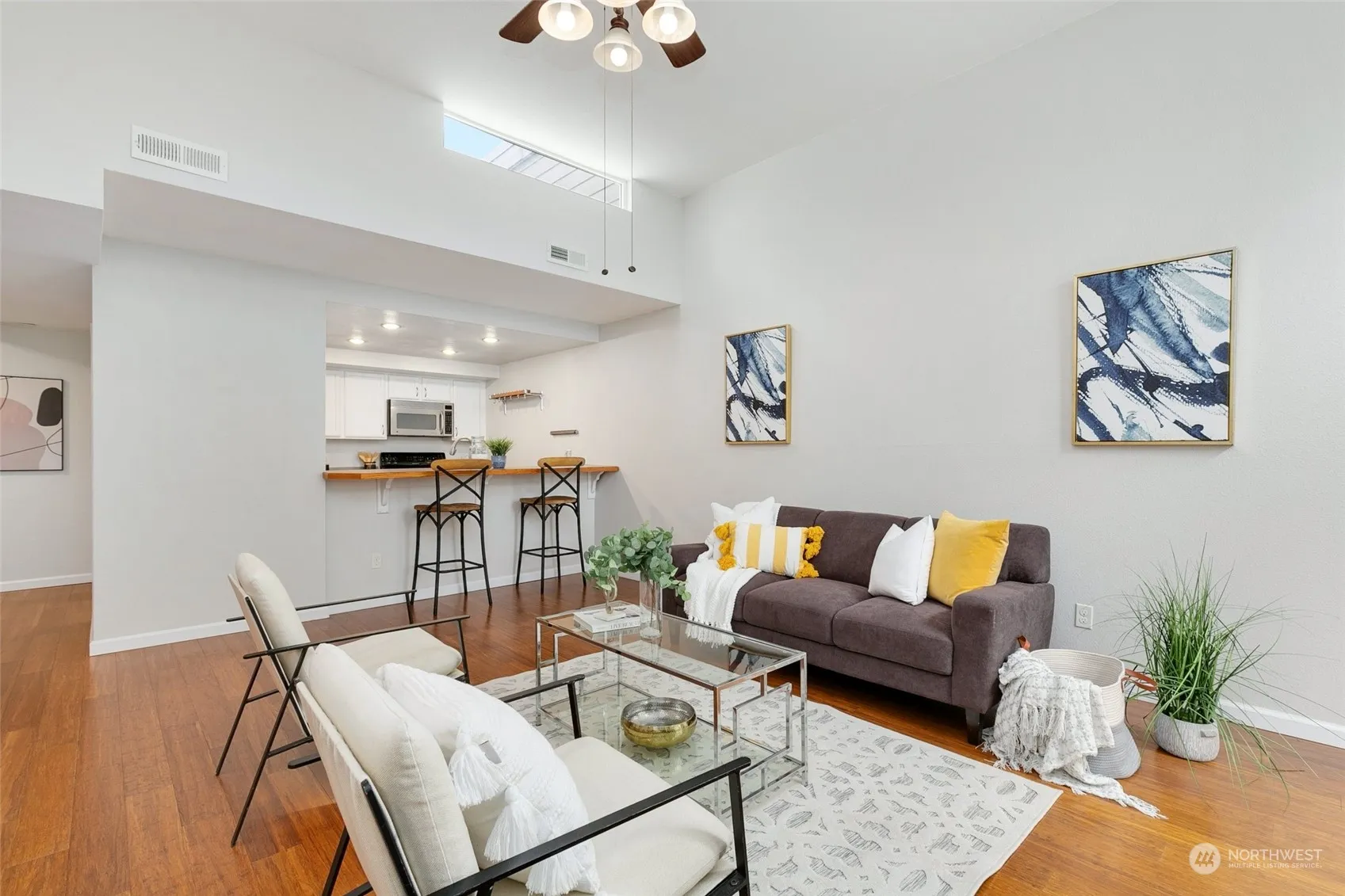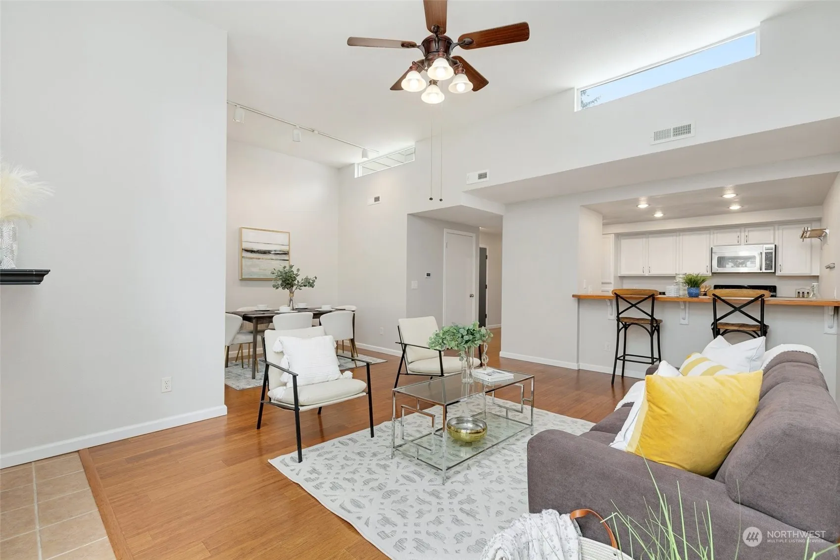 Bright and spacious street level entry home with views over downtown Redmond, Marymoor Park, and the Cascades. The expansive main living and dining area features 12-foot ceilings, clerestory windows, a fireplace, and a view deck. The open kitchen overlooks the main living space, providing a perfect setting for gatherings. This home includes two large bedrooms and two updated bathrooms, along with a spacious den/nook area off the living room. Recent updates include a Coleman furnace, Honeywell Smart thermostat, Rheem water heater, and soft-close hinges for all kitchen and bathroom cabinetry. The ideal location is further enhanced by the operational Redmond Technology Center light rail, with the Downtown Redmond station coming soon!