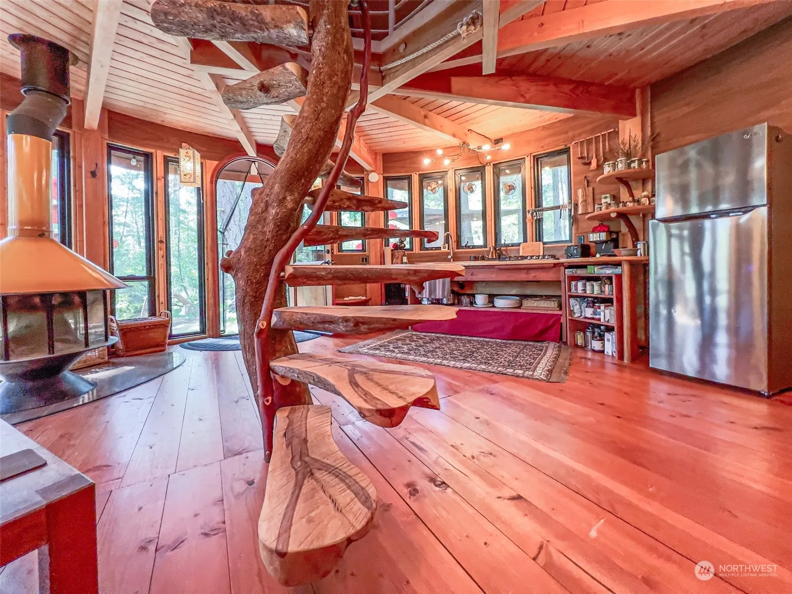 Welcome to your island oasis nestled on 5 lush acres of Orcas Island land. This stunning retreat is fully off-grid but minutes aways from Island amenities. Powered by solar energy and water catchment this property offers a fully self-sustainable lifestyle. Step inside the main cabin to discover a vintage Malm Carousel wood fireplace, gas stovetop, copper sink, & a custom Madrona spiral staircase leading to a lofted bunkhouse. Sputnik light features cast a glowing light throughout. The newly finished bathhouse saves you from roughing it off-grid! There is a 2-car barn garage w/loft, & additional charming studio cabin. Mature Madrona & Fir trees remain untouched and the natural landscape seems otherworldly. Find your place on Orcas Island.