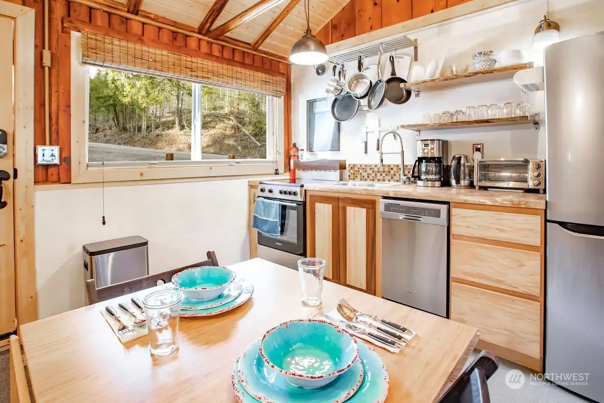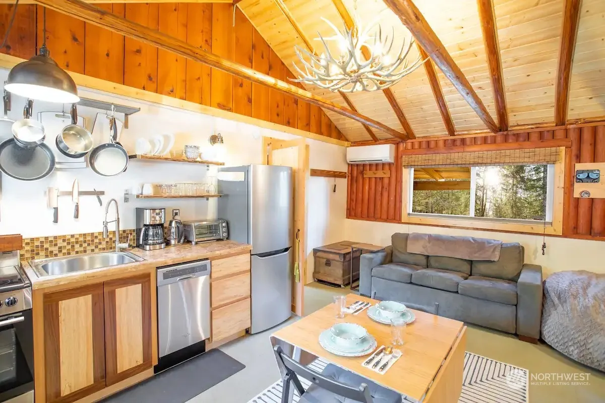 Utterly adorable and cozy turn-key vacation cottage, just moments from Mount Rainier National Park and White Pass Ski Area. Ideal for all of your weekend getaways, this updated, rustic retreat boasts a soaking tub, crackling wood fireplace, and a ductless heat pump for ultimate comfort. This fully furnished property features dbl pane storm windows, high-end appliances, and elegant black vine maple cabinets, every detail enhances its mountain charm. Recent updates include a newer metal roof, an upgraded electric panel, and fresh paint, ensuring a hassle-free stay. Plus, there’s ample storage for firewood or outdoor furniture. Grab your ski’s or your hiking boots and get ready to make some amazing memories at your very own woodland paradise!