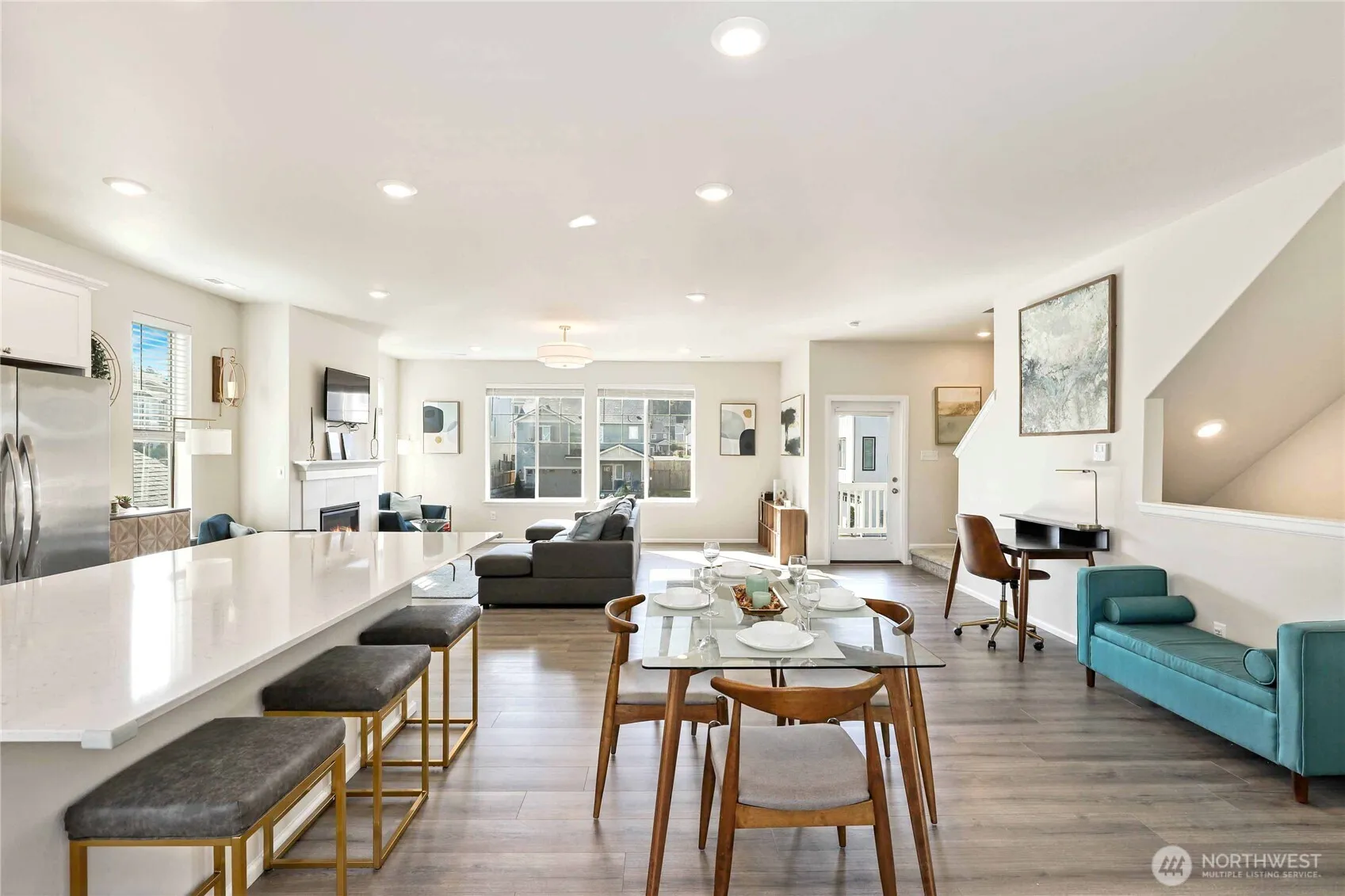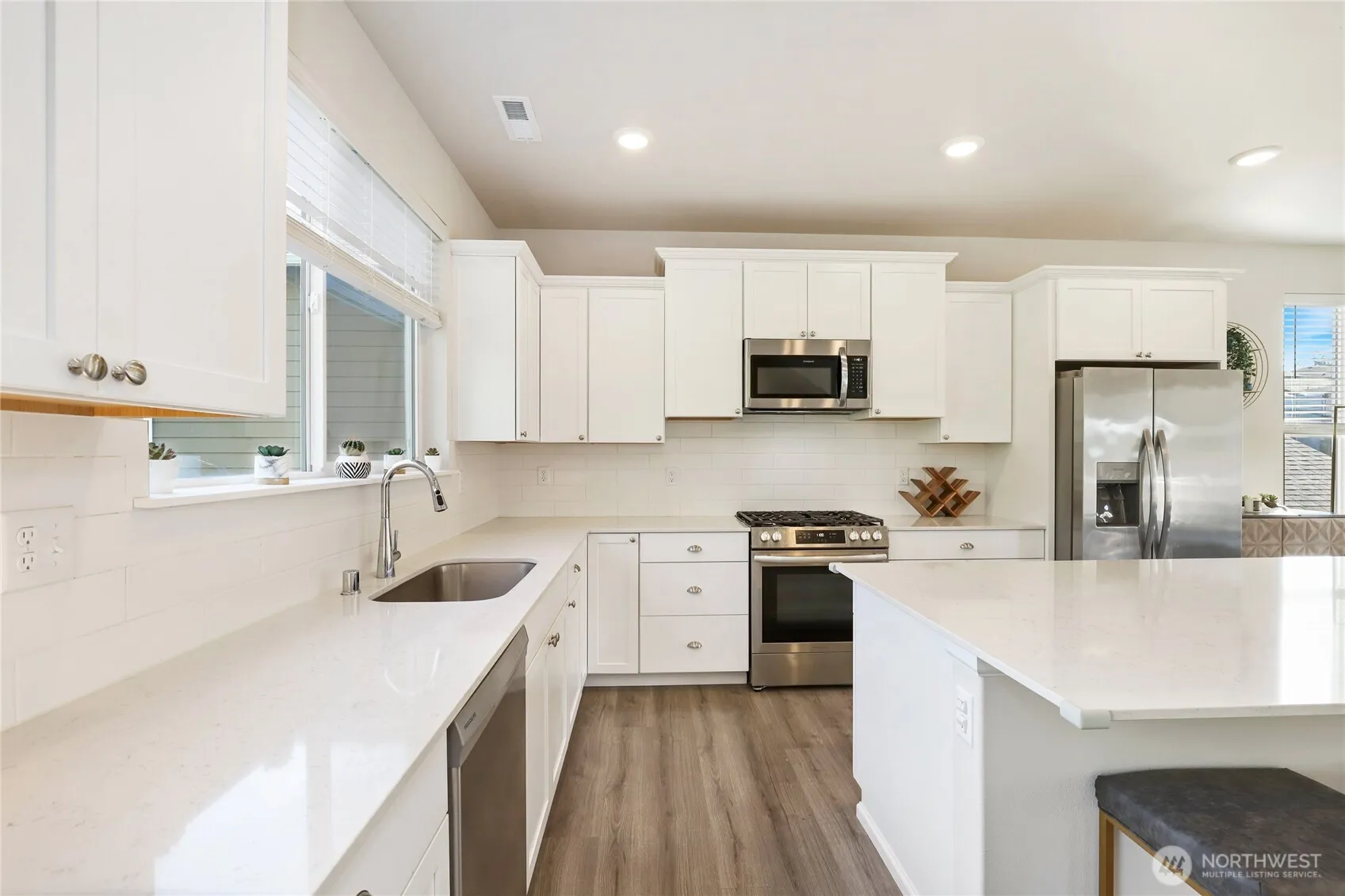 Beautiful & stylish 3-level home in East Port Orchard! The main entry level features a spacious bedroom with backyard access & a bathroom, perfect for guests, a home office, gym or multi gen living situation. The bright main level boasts a large, bright kitchen with stainless appliances, a subway tile backsplash, and a big island that opens to a cozy living room with a fireplace & deck access. Upstairs offers 2 bedrooms, a full bath, utility room, & a great primary suite with dual vanities, a tiled shower, separate water closet, & walk-in closet. Enjoy a fully fenced backyard with patio, all in a great neighborhood with a park. Close proximity to shopping, amenities, & the Southworth Ferry terminal.