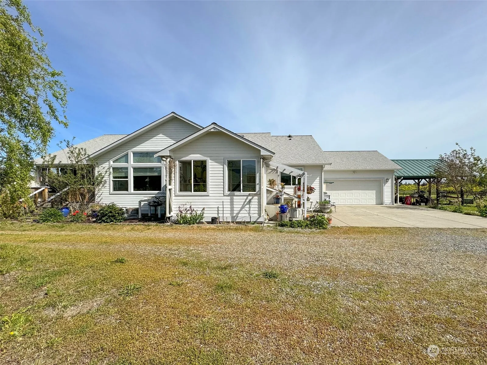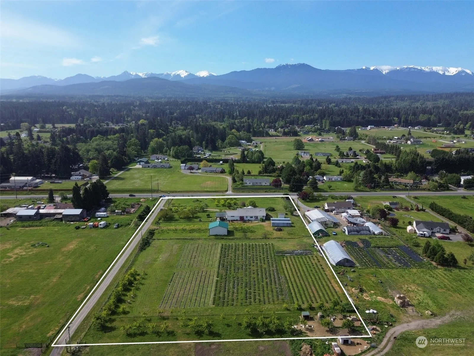 Enjoy the Olympic Mountain views from nearly 5 acres of fertile farmland. The gated circular drive leads you past orchards of fruit trees (apple, pear, peach, cherry & more). A vaulted ceiling and huge picture windows take in the view from the living room, warmed by a propane fireplace. Sliding doors lead to the covered porch, also accessible from the primary suite, with dual sink vanity, jetted tub, walk-in shower & walk-in closet. A skylight brightens the kitchen with walk-in pantry. Dine in the formal dining room w/bay window or the breakfast nook w/adjoining sun-room. Also a guest room & bath, office, laundry room. Attached 2 car garage, detached carport and 1020 Sq. Ft. oversized RV garage for all your vehicles.