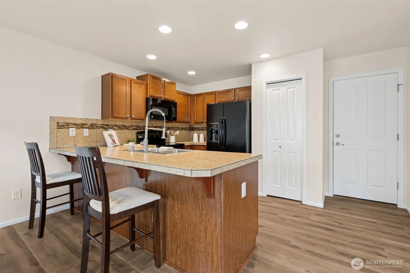 Situated on a desirable corner lot, this updated 4 br + den, 2.5 bth home features a 2-car garage & a fully fenced yard, offering great privacy. The open concept creates a spacious & inviting atmosphere, w/ all kitchen & laundry apps included for added convenience. A versatile main floor den serves perfectly as a guest bdrm, home office, or fitness space. The primary suite includes a walk-in closet & newly updated vanity w/ quartz countertop. 3 addl bdrms, a full bth, & conveniently located laundry rm complete the upper level. Stay cool during the summer months w/ CENTRAL AIR CONDITIONING. Enjoy the nearby neighborhood park, convenience to shopping, dining, schools, and easy access to I-5. All new flooring throughout & interior paint.