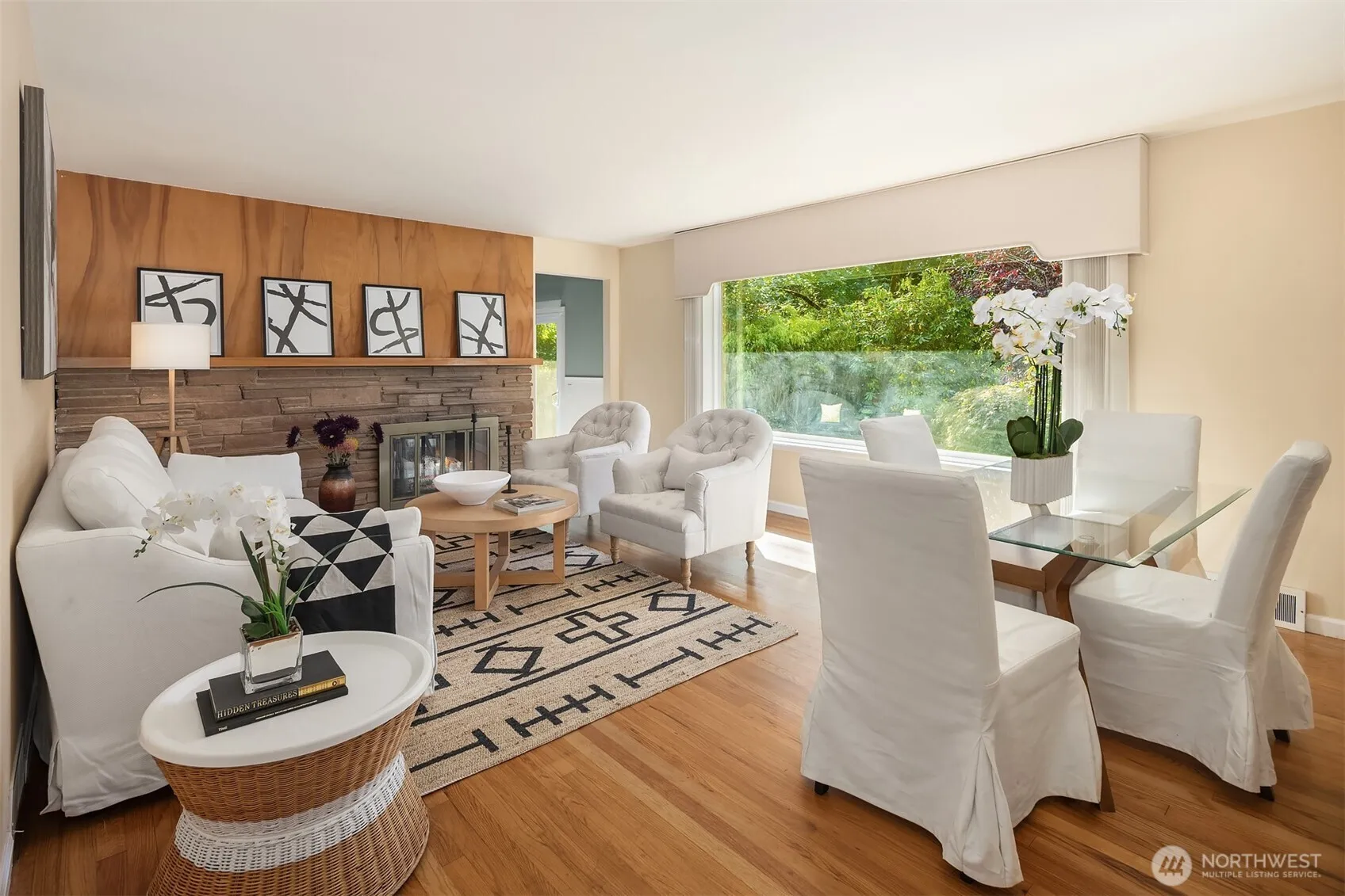 Bright 3-bedrooms/1.75-bathrooms rambler conveniently located in Richmond Highlands. Spacious living room with large picture window overlooking a secluded backyard. Primary suite includes private 3/4-bath. Full bath with skylight off hallway. Gleaming hardwood floors in living room and bedrooms. Private study with high ceiling and a slider opening to backyard patio. Walking distance to Richmond Highlands Park, Shorewood High School, Town and Country market, and many other amenities. Easy access to light rail and Downtown Seattle.