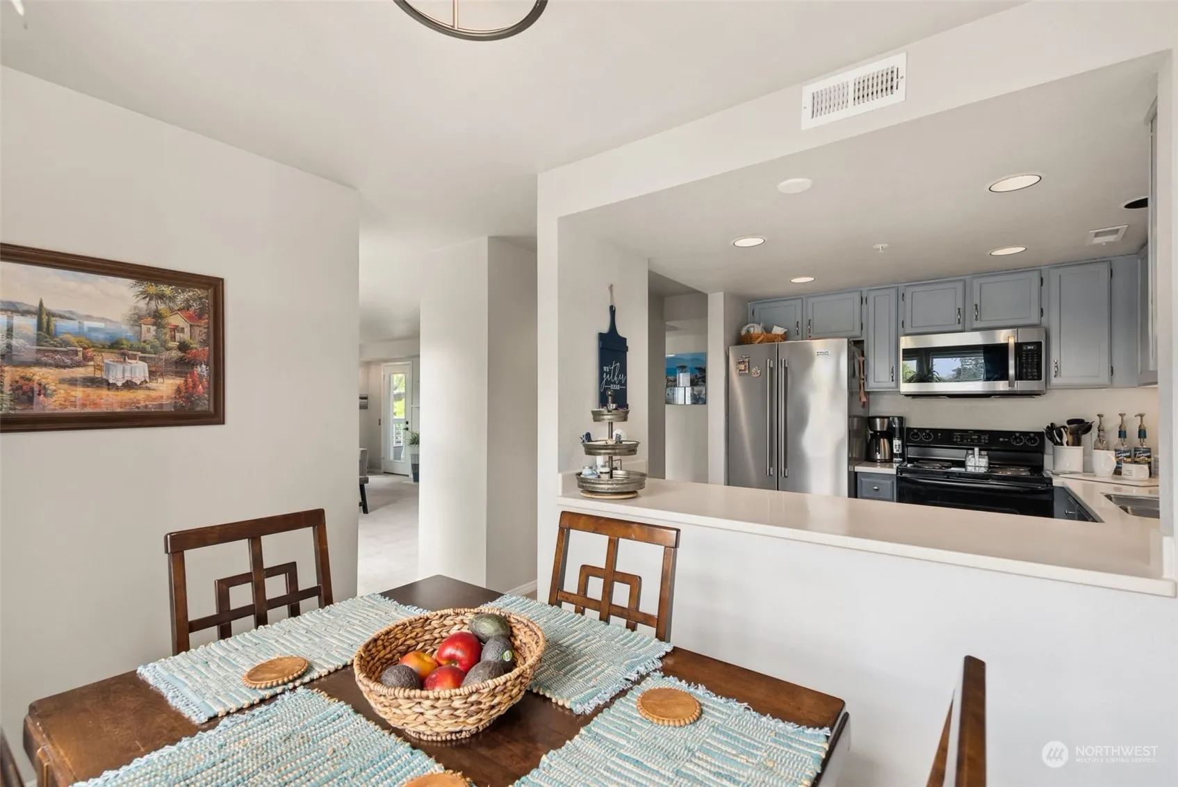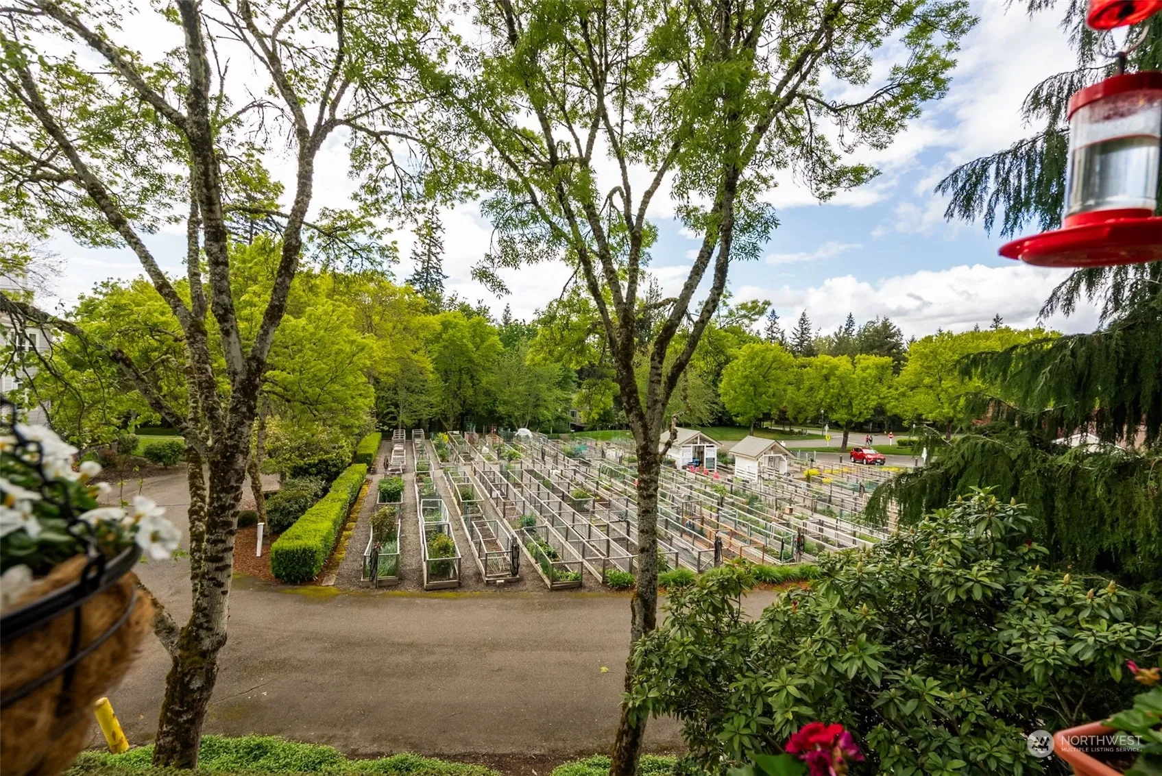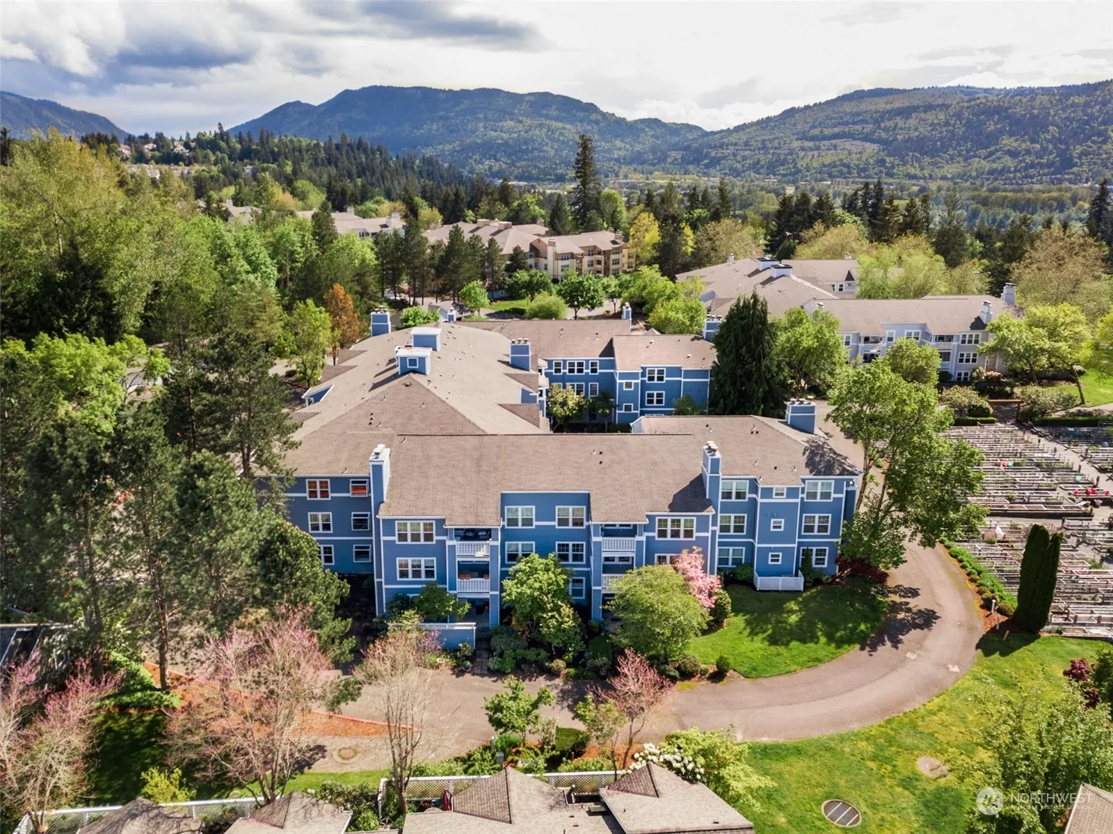 Desirable Light and Bright two Bedroom Condo in Washington Village, the Olympia building with New Siding and Windows. Kitchen with Tastefully Painted Cabinets, Corian Countertops, Lovely Kitchen Eating Space with Views. Living Room Formal Dining Room Combo with Wood Burning Fireplace, Views from every Window. Covered Deck with Amazing Views of the Pea Patch, Beautiful Primary Bedroom with Fabulous Views, Ensuite with Newer Easy Step Tiled Shower, Nice Cabinetry, and Fixtures. Tastefully Decorated. Light and Bright Second Bedroom with Courtyard and Garden Views. Main Bathroom Features a Luxury Soaking Tub. Covered Deck with Views of Community Garden Space, Designated Private Garage Space with Door Opener. Newer Heat Pump, AC and Furnace.