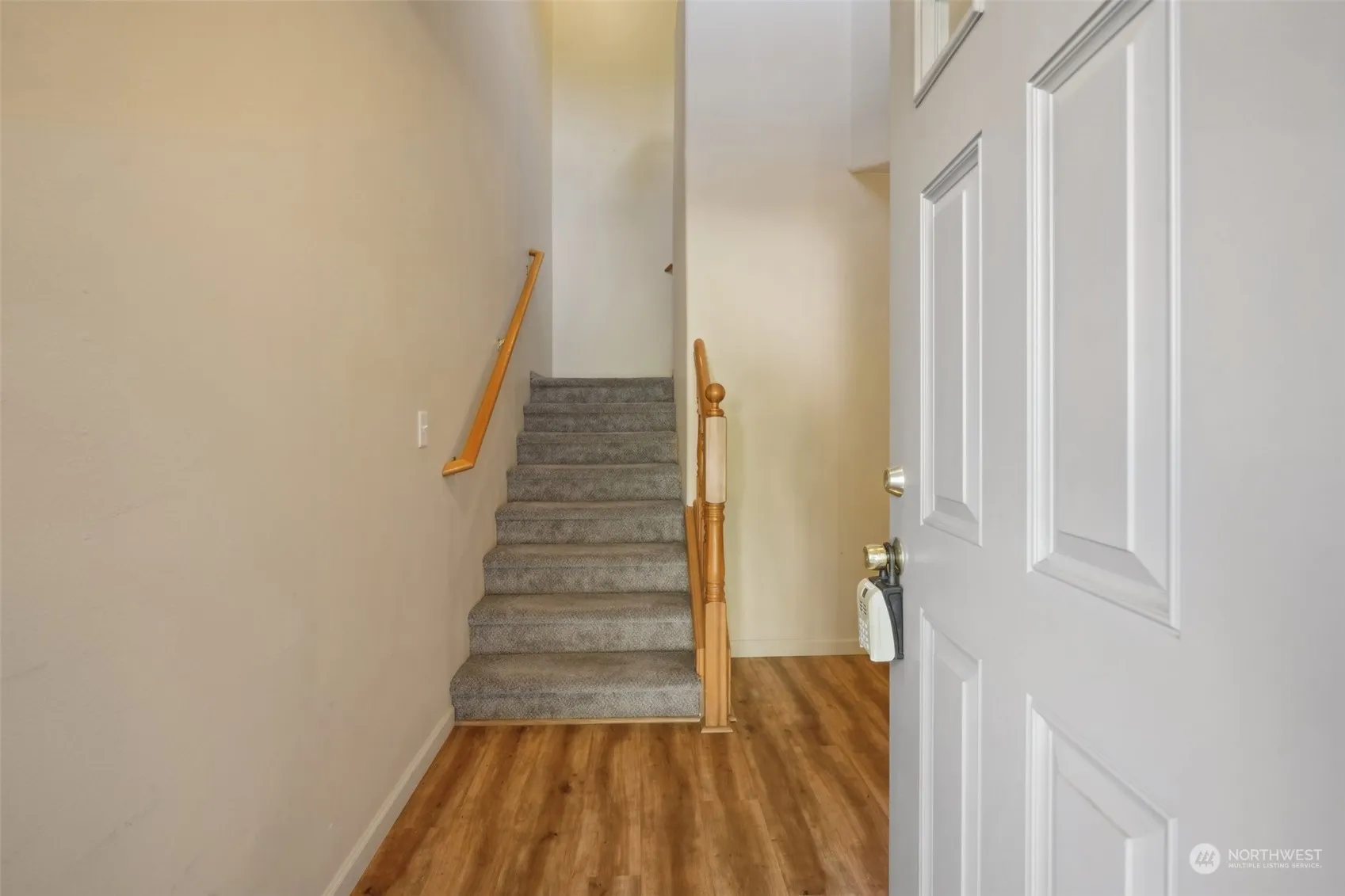 This charming property welcomes you with a covered porch and a 2-lite entry door leading into a spacious great room. The family room offers carpeting, while the kitchen boasts modern appliances, oak cabinetry, and a convenient breakfast bar. Recessed lighting enhances the laminate flooring. The dining area provides slider access to yard. Upstairs, the primary en-suite features a walk-in closet and dual sink vanity. Two more bedrooms, a cozy loft, and a laundry closet offer ample space. Enjoy the great room, kitchen dining area, and laminate flooring. Clerestory windows brighten the space. Outside, a covered front porch and fenced yard await, along with a 2-car garage. Comfort, convenience, and style define this property.