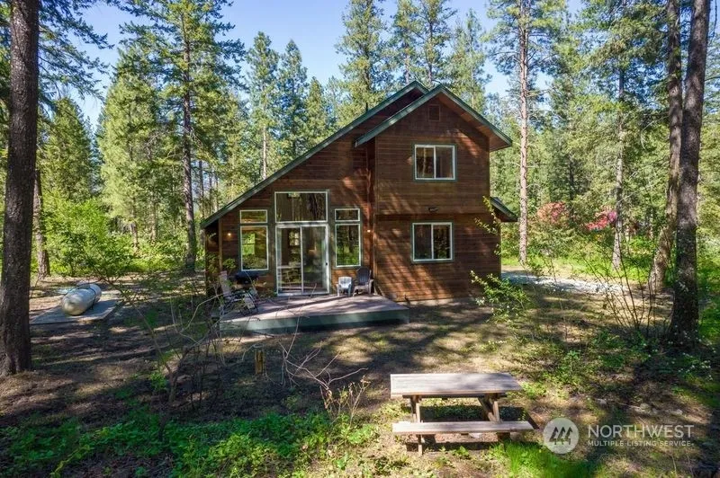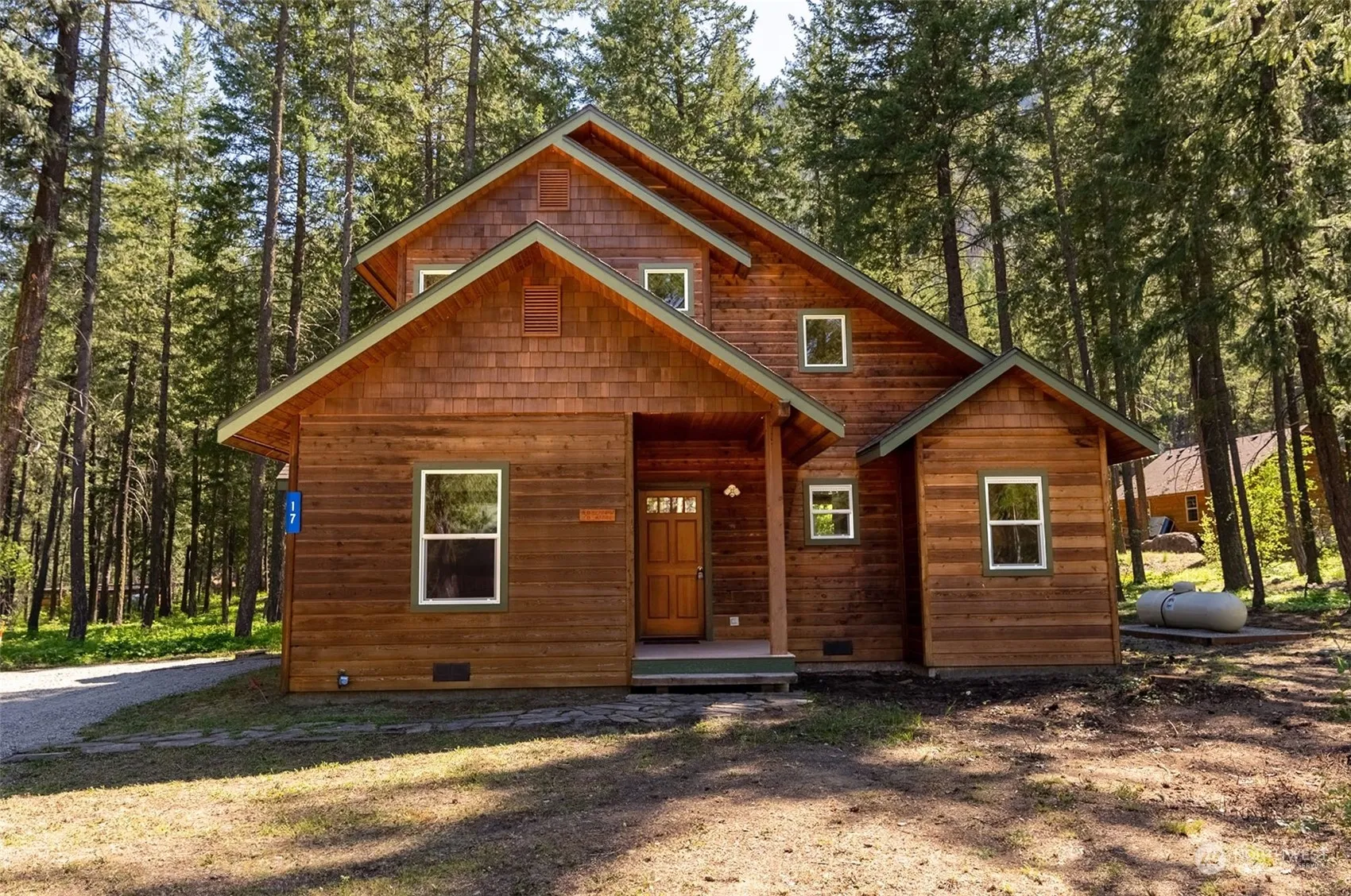 Sweet Winthrop location for this popular ‘Nightly Rental’ Cabin in the Woodlands, is the essence of ‘Mountain Getaway’. Cabin is 1440 sf offering 2 bed/2.5 bath w/sleep Loft. Primary bedroom has ensuite bath. Views of Lucky Jim Bluff through treed forest setting, is the salve of green beauty and relaxing moments. Absorb warm glow of classic fireplace, surrounded w/natural rock & massive timber throughout great room. Large South facing windows, your lens to rugged mountain views. Hardwood floors honey Maple. Porcelain tiled countertop beautifully compliment cherry-wood accents & cabinetry. Appliances included. Backyard deck. Make this your fulltime home or continue the ‘Bear Paw Cabin’ rental. Wi-Fi.
