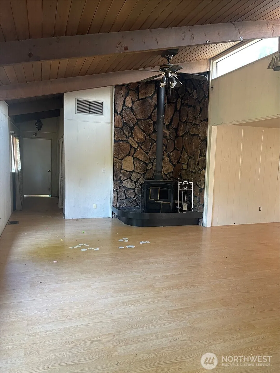 3 bed 3 bth great room area that has large kitchen area, dining area,wood fireplace with rock face behind it, masterbed has large walkin closet. Home is being sold as-is. It needs a few windows, has soft spot next to toilet in guest bath, 3rd bathroom needs inset medicine cabinet and small sheetrock repair. Yard is being cleaned up.