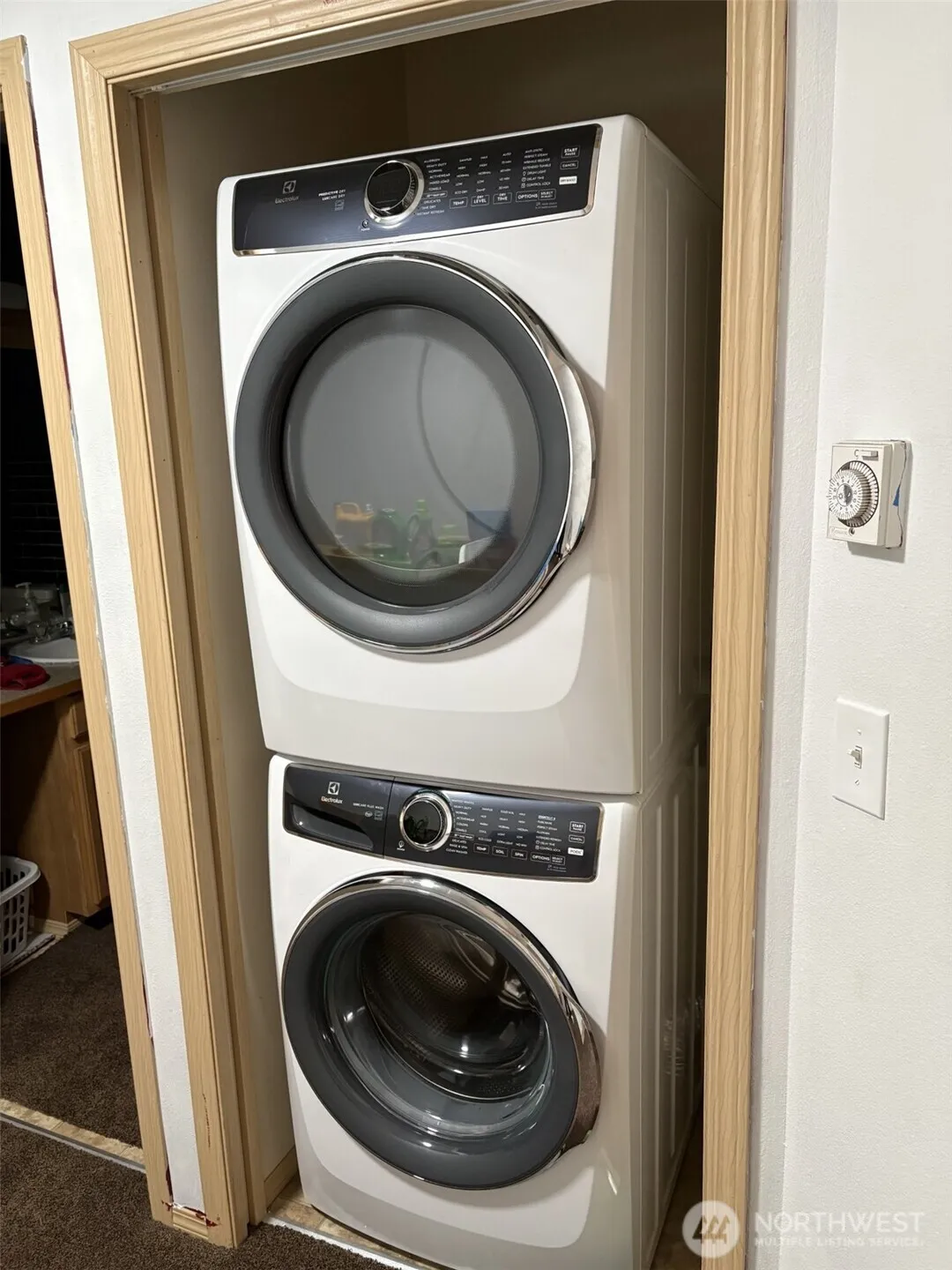 Check out this fully updated Townhouse with new carpet, fresh paint, new stove, refrigerator, dishwasher and hot water tank. Open concept kitchen, dining and living area on main level with access to private porch area with storage. Upper level is 2 bedrooms, full bathroom, and utility closet with stack washer and dryer. Includes one dedicated covered parking and access to community BBQ area. Low HOA fee ($75.00 Monthly) includes garbage, yard and common area maintenance. Minutes to I-5, JBLM, and Lakewood Towne Center.