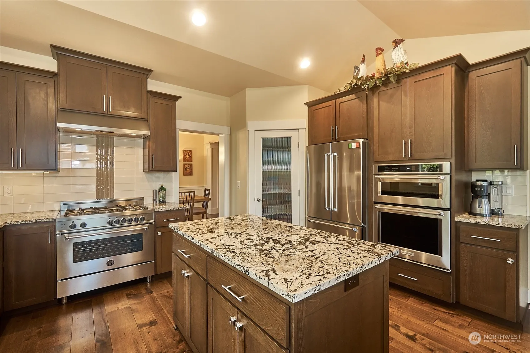Beautiful rambler on a large corner lot with no neighbors behind you. Soaring 9″ ceilings throughout with huge dining room, family room open to gourmet kitchen with slab granite countertops, Bertazzoni multi fuel gas range and large island. Large master bedroom with 5 piece master bath and patio access. Second floor loft/rec. room. Back yard with expanded patio and fenced dog run. Deep 3 car garage with high end cabinets.