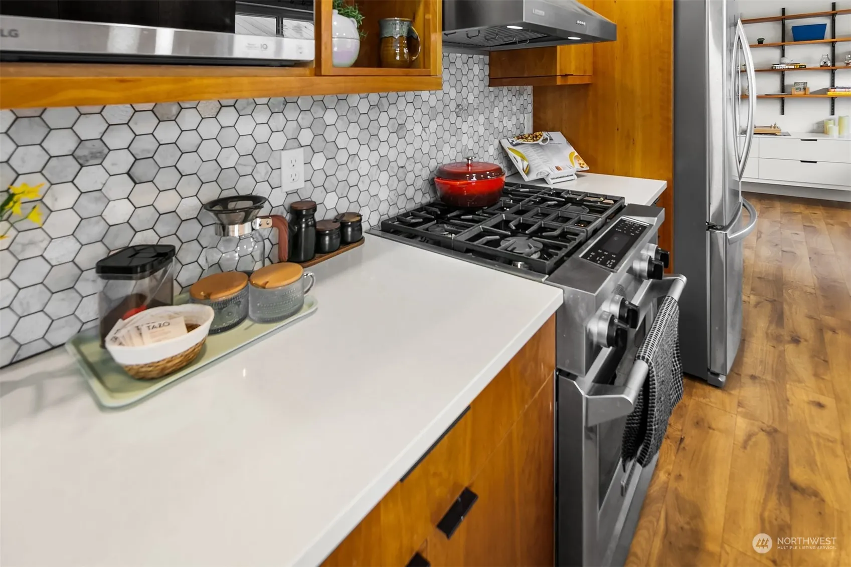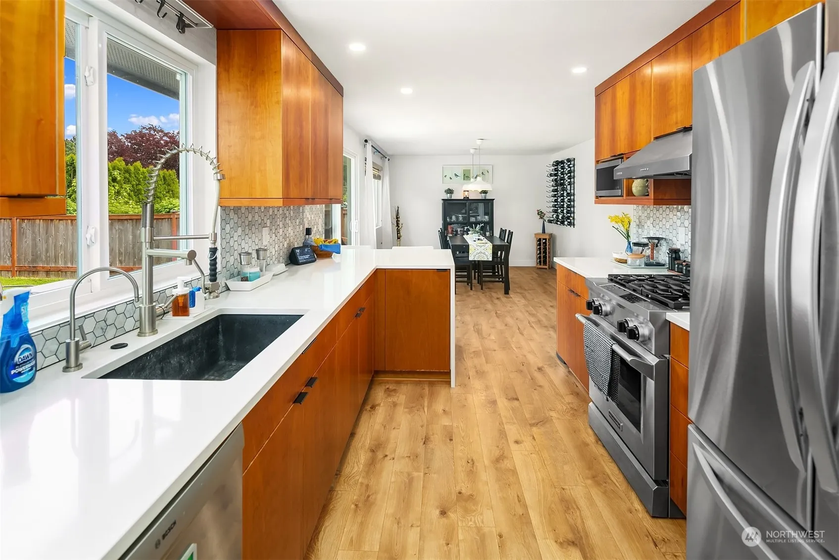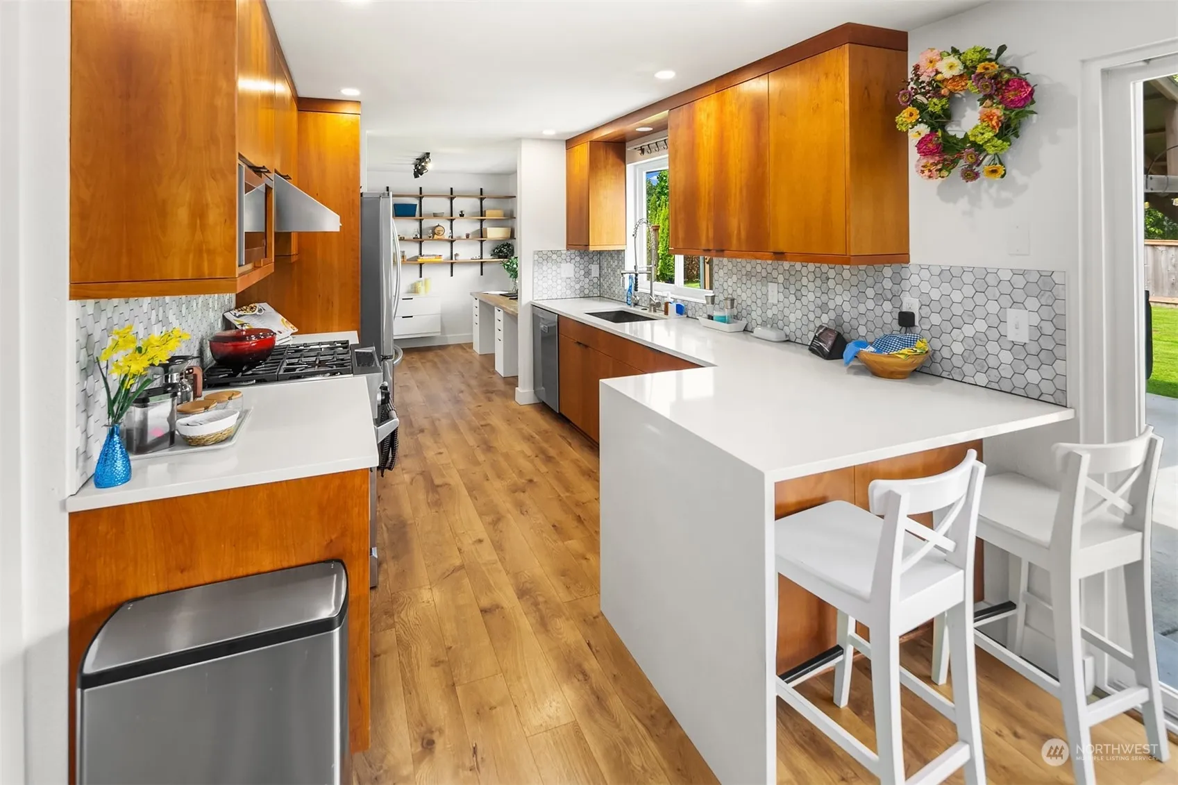 Exuding retro charm with modern updates, you’ll love this mid-century place to call home! The wide-planked LVP floors & long grain shaker style fir doors add a touch of vintage flair, while the updated kitchen and baths bring a contemporary feel. Kitchen features quartz counters, lavish backsplash, & Kitchen-Aid gas cooking. Floating shelves & clean lines throughout. Stay comfy with AC/heat pump & a fireplace. The large fully fenced backyard, complete with a gazebo and hot tub, is perfect for outdoor entertaining. The level 2 electric car charger is a tech-savvy bonus. Cali closets throughout. Brand new roof w/ transferable warranty! Shy 10,000 sf lot, perfect for play & BBQs. Close to Lake Meridian & Kent amenities. Pre-inspected.