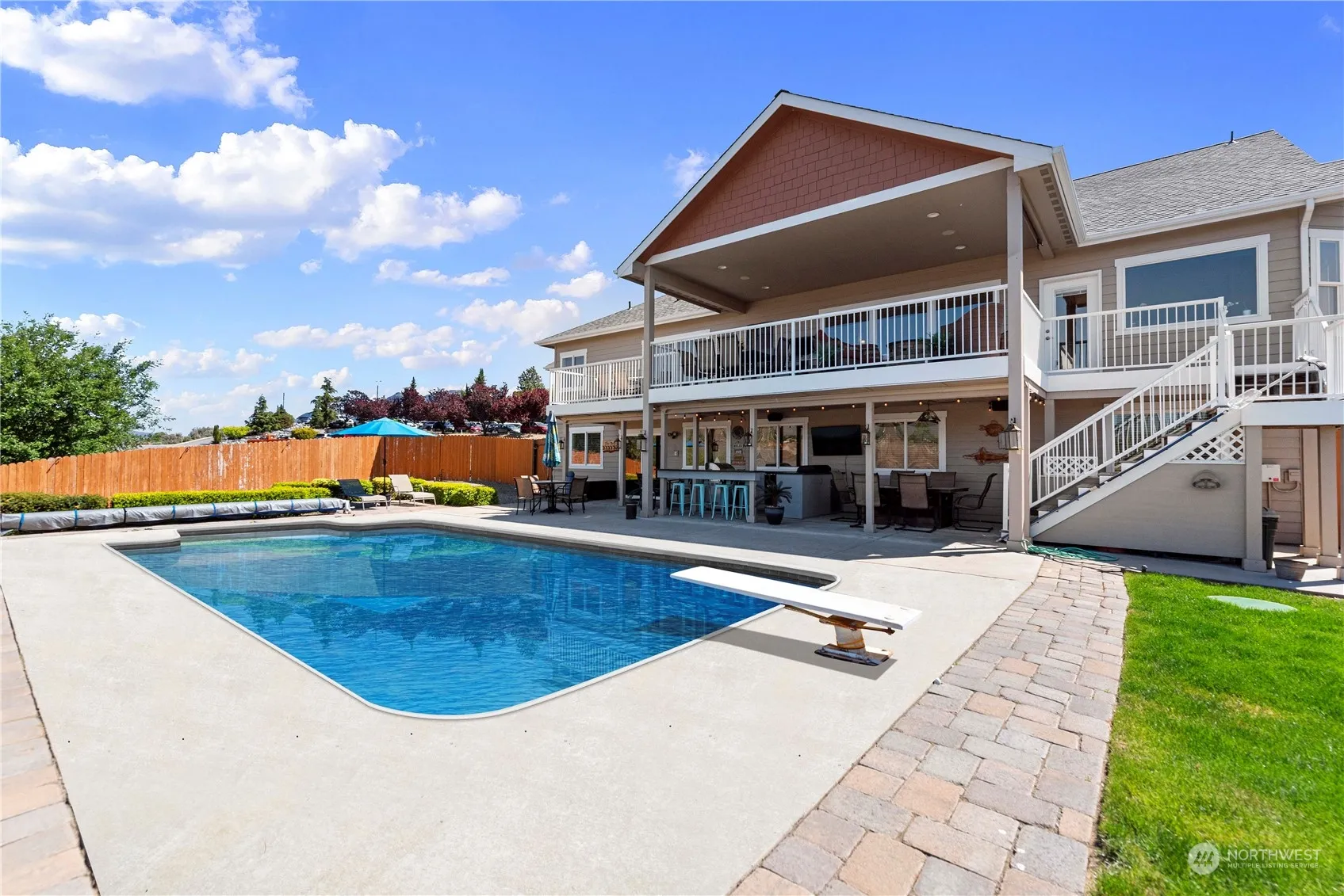 Nestled opposite the 3 Lakes Golf Course, this expansive 4-bedroom Custom home offers serene Mountain, Three Lakes Golf Course & Columbia River vistas. The main floor boasts a spacious primary suite, featuring a pass-through gas fireplace for cozy evenings. Off the Great Room is an expansive deck to enjoy the views. Downstairs, a daylight basement hosts a versatile rec room with a wet bar—an entertainer’s dream with a wine room perfect for hosting. Large multipurpose room perfect for guest overflow or crafting. Step outside to your own oasis: an in-ground pool and a built-in covered outdoor barbeque/kitchen area. Relax in this wonderful neighborhood, Tuscany on the Green, with 300 days of sunshine, every moment here feels like paradise.