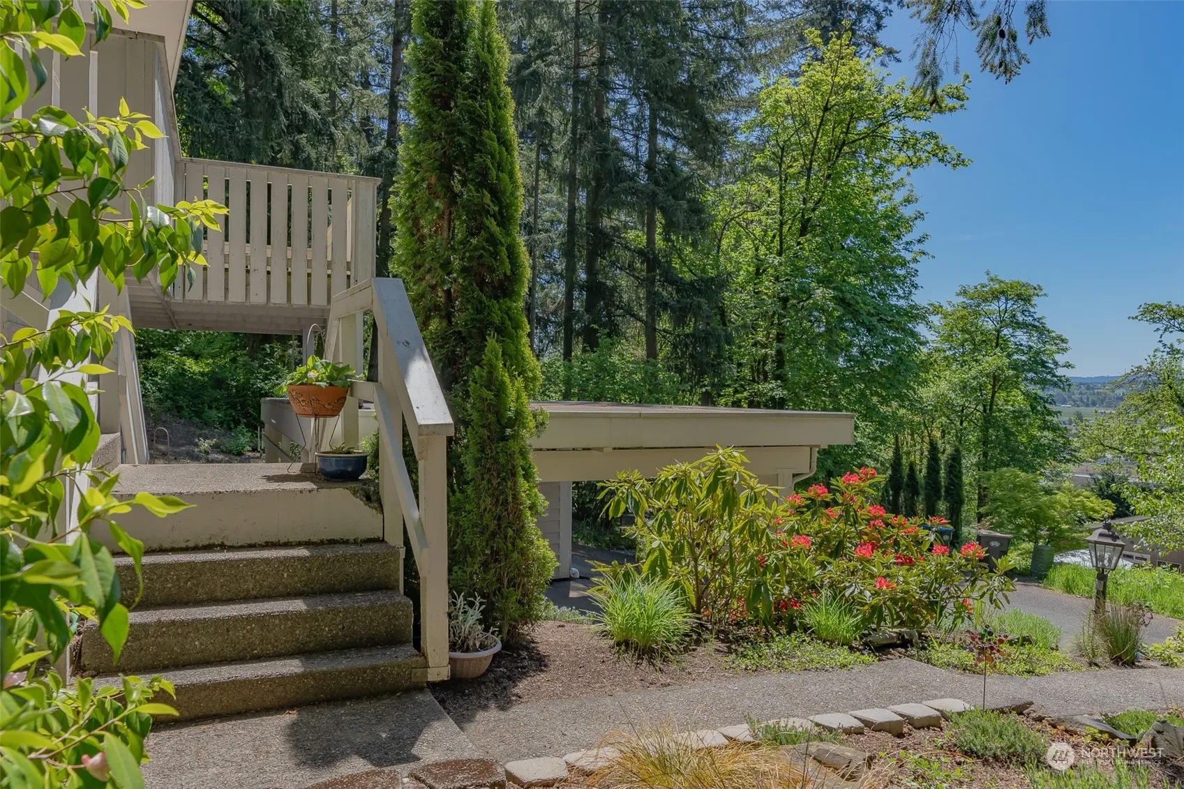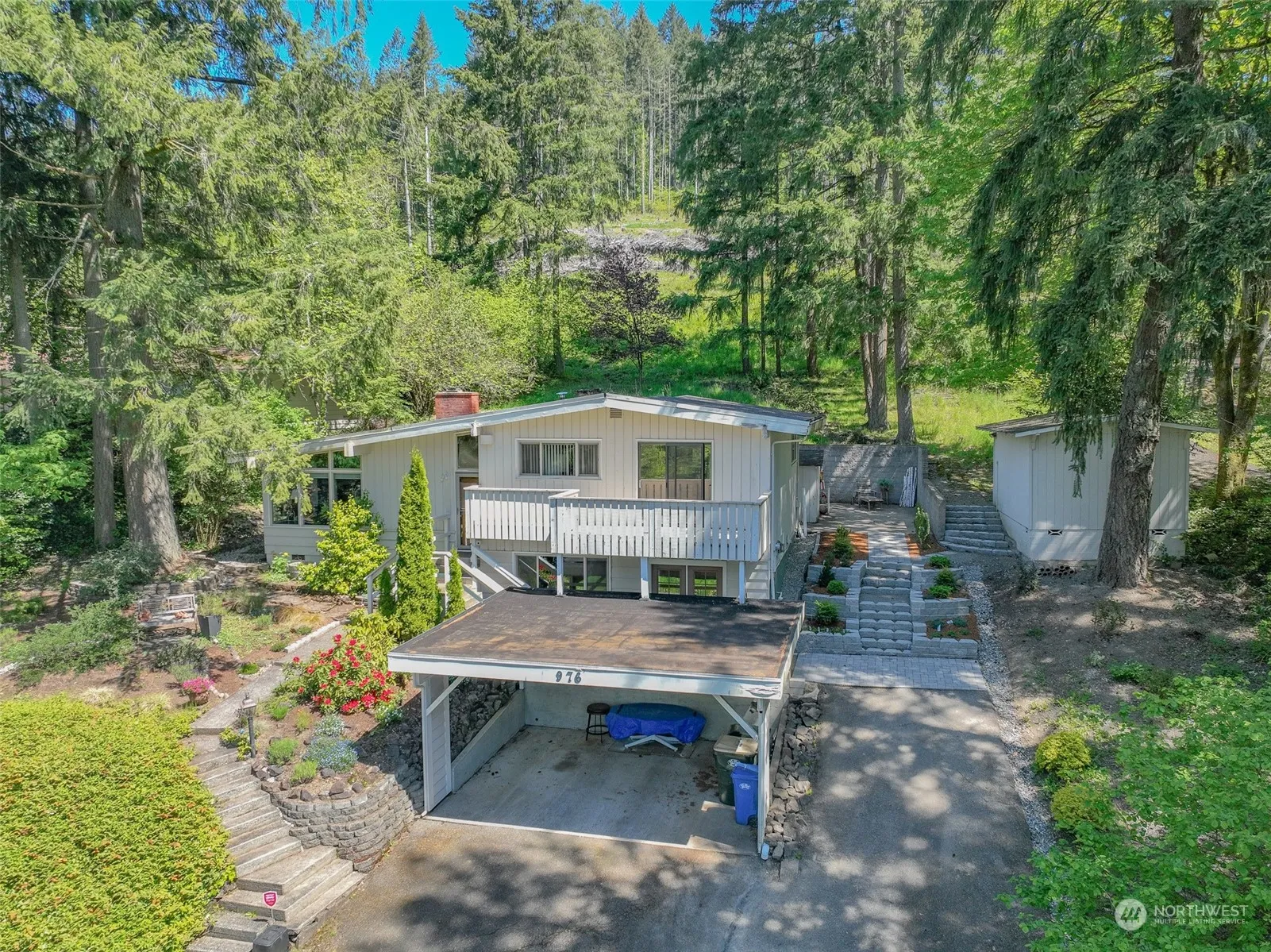 Let your green thumb rejoice! Surrounded by lush green mature landscaping: blooming flowers, deciduous and evergreen trees. Spread out in three levels of living space with large window banks bringing nature and natural lighting indoors. Vaulted ceilings with exposed beam grace the main level Living room (with gas fireplace), flowing through to Dining. Ample cabinetry in Kitchen with island counter and featured solarium-style window. Newer carpet; ceiling fans. Two parcels adding to a quarter of an acre, terracing with secure landscape blocks, pathways leading through the multiple gardens. Enjoy your morning coffee on covered back patio, and watch the sun set on front deck with peek-a-boo views of the city below. Ahh.. this is the life!