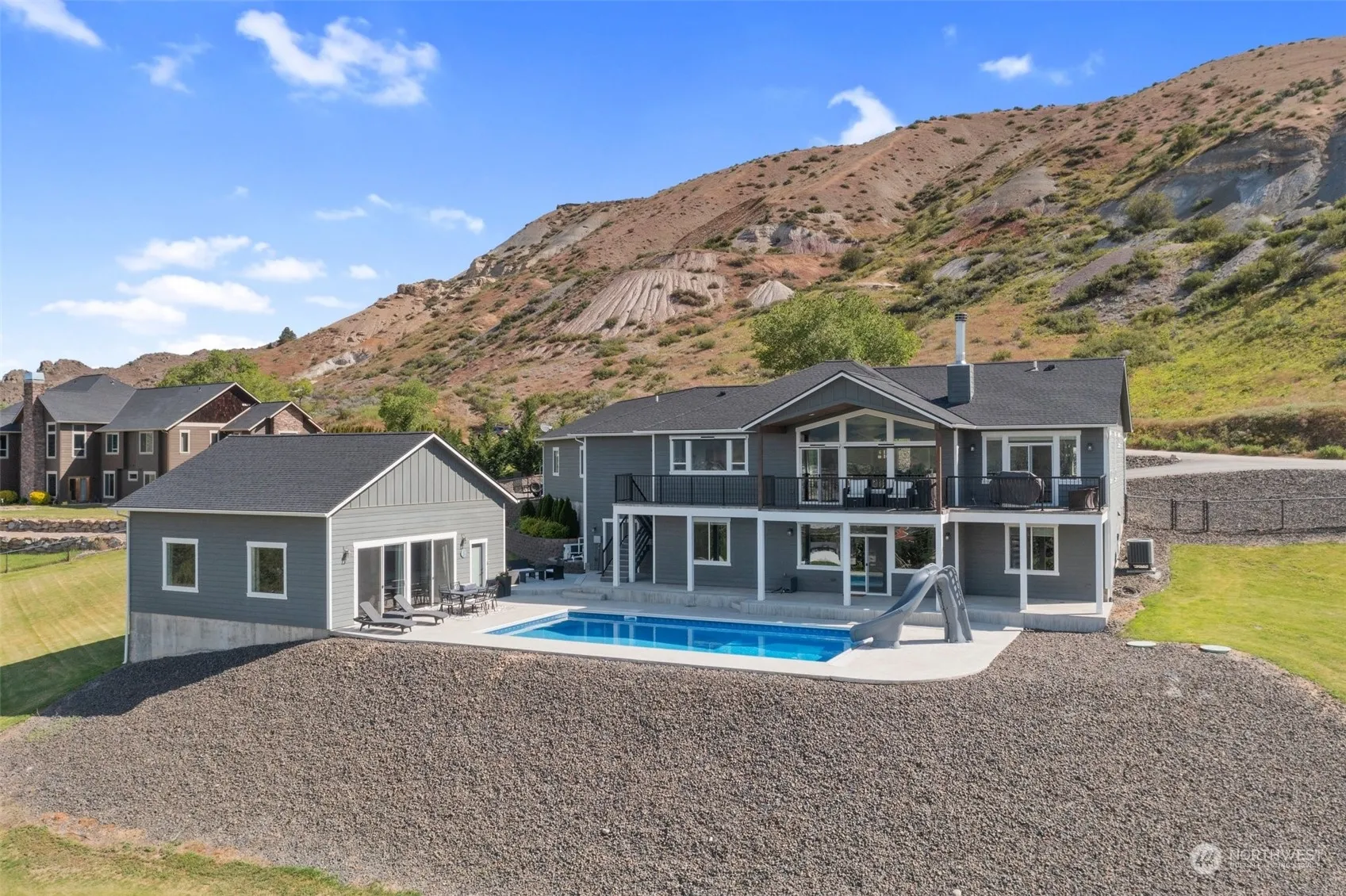 Welcome to this beautiful daylight rambler on 2 acres with AMAZING VIEWS & pool! This home offers 3 bedrooms plus an office. Entering through the great room you’ll find vaulted ceilings, wood burning fire place & sliding door to the deck overlooking the pool and grounds. A seamless transition takes you through the dining area and large eat-in kitchen with leathered granite counter tops & upgraded refrigerator and dishwasher. Primary bedroom w/ walk-in closet & heated flooring in the ensuite. Lower level has a large family room, 2 bedrooms-one being an ensuite, along with a second full bath & plenty of storage. Outside you’ll find a meticulously kept fenced yard, 900 sq. ft. pool house w/ bathroom perfect for entertaining. Plus RV hook-ups!