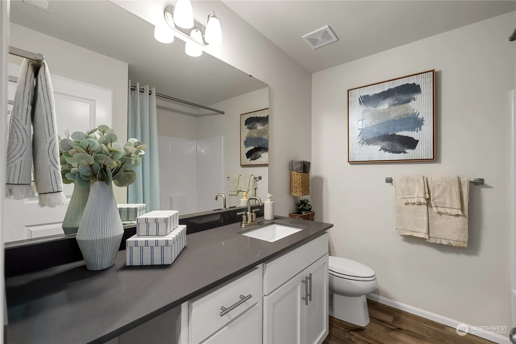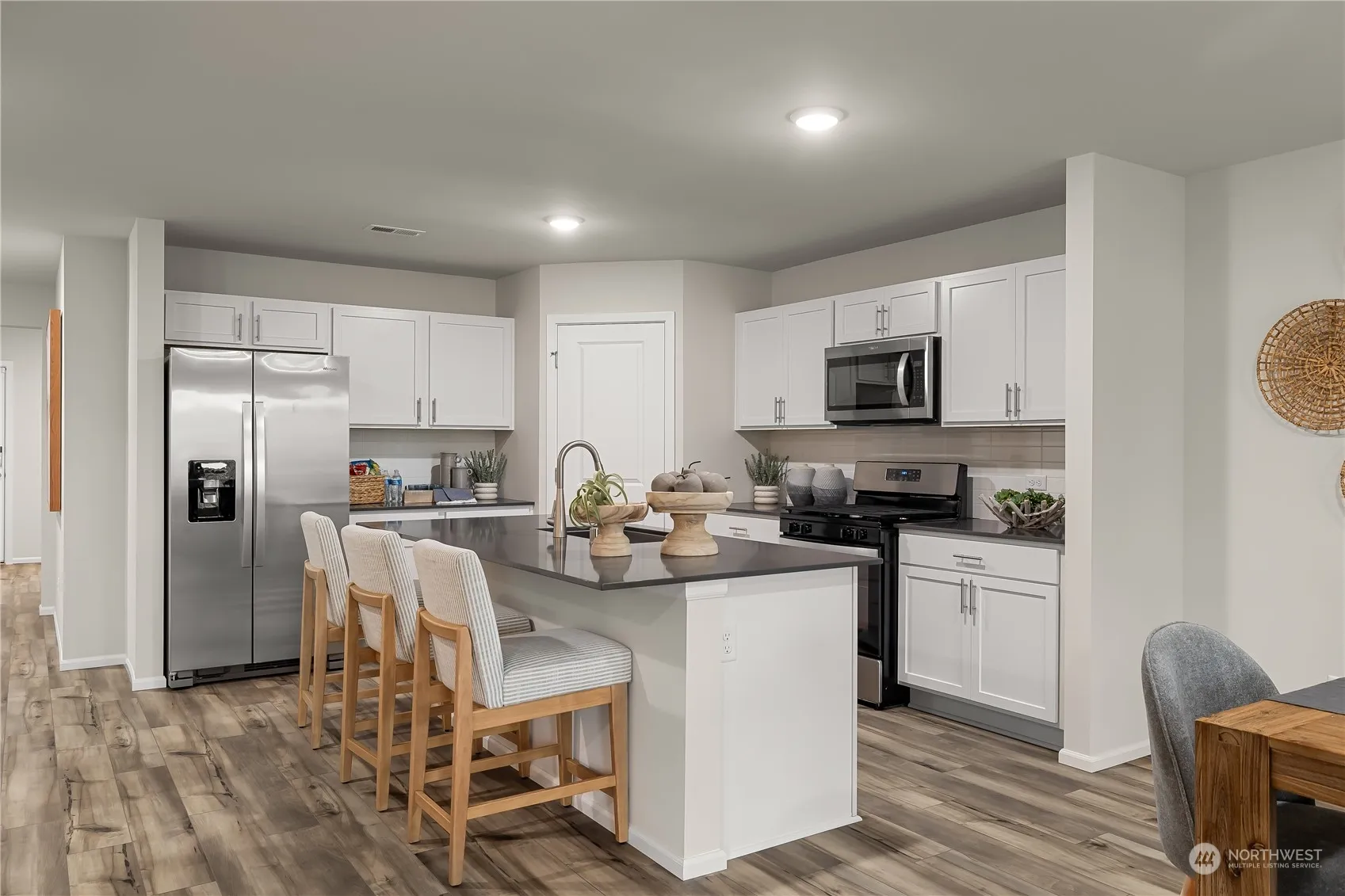 MOVE-IN READY-This Georgia Floor plan, Rambler 1,725 sq/ft, 3bd/1.75ba home comes with covered back patio! Open concept, Kitchen features slab quartz counter tops, deep stainless steel sink, White painted Maple Cabinets with nickel pulls, and full tile backsplash. All appliances included; washer, dryer, fridge, microwave/hood, gas range, oven, garbage disposal. The home comes front and back landscaped, fully fenced, and includes sprinkler system front and back of home. Additional features include Heat pump and Furnace for central heat/central air, 2-car garage w/opener w/2 remotes. Customer reg. policy: #4787. Buyer Broker must accompany and personally register buyer at 1st visit; Buyers bring your brokers. Model home sold AS-IS.