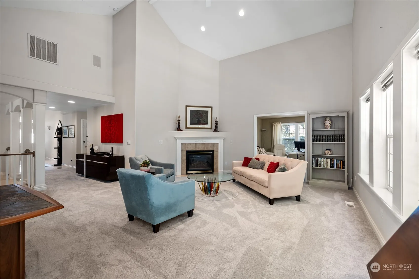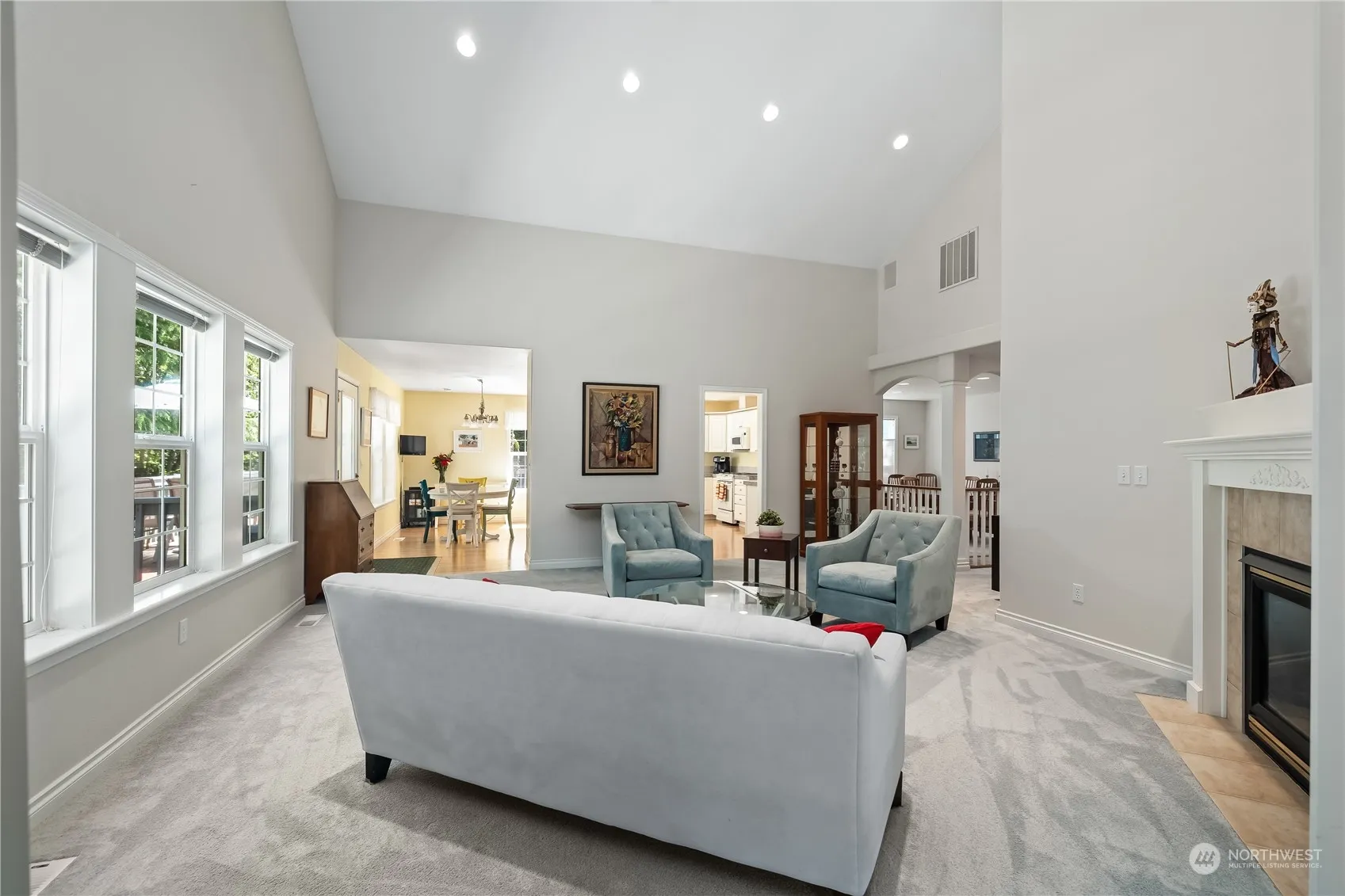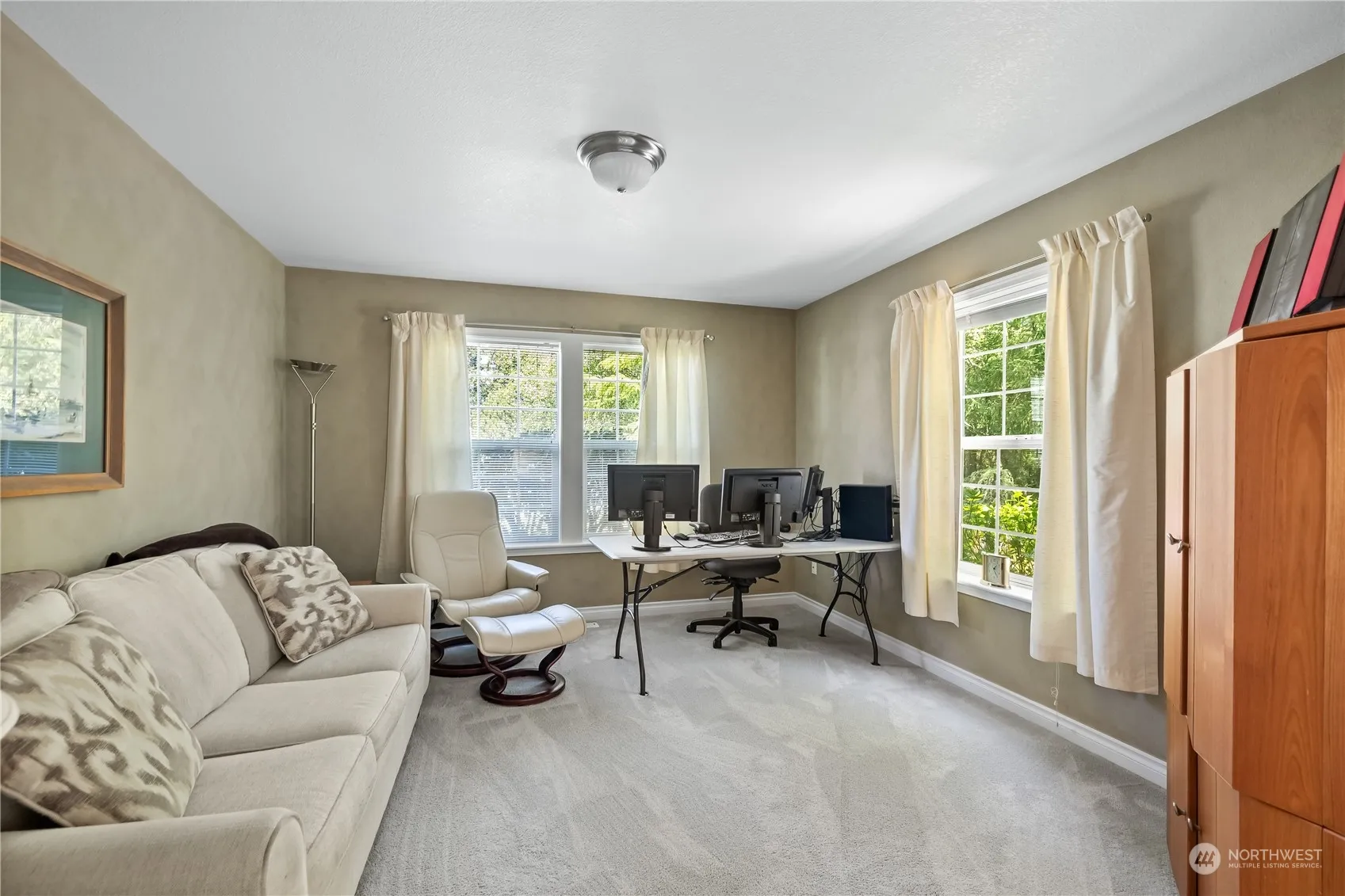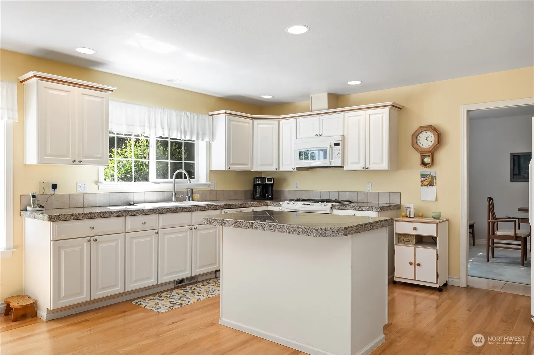Beautiful single story home in Campus Green situated on a cul-de-sac & backing to green space & Hawks Prairie Golf Course. Peaceful, private back yard with spacious deck, dog run, mature landscaping & secondary deck situated to enjoy sunsets. Inside, the home offers 3 bedrooms plus den/office in a very popular split bedroom floor plan. Primary suite includes 5 piece bath & large walk-in closet. Main living area centers around a welcoming living room with vaulted ceiling & gas fireplace. French doors lead into the den/office. The kitchen boasts granite tile countertops, white cabinetry, wood floors, informal dining area overlooking the private backyard, and formal dining room with tile flooring. Heat pump with A/C for year round comfort!