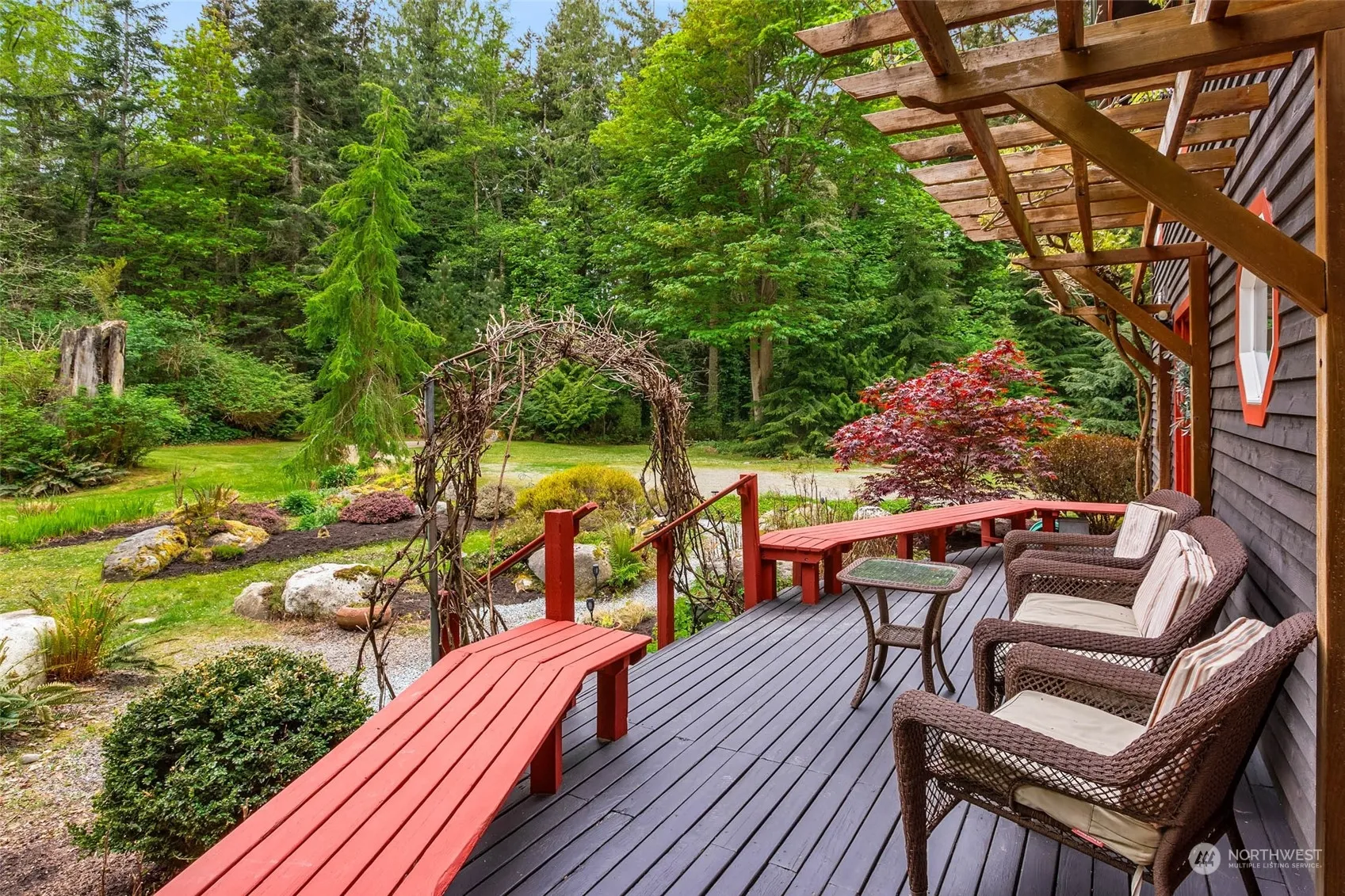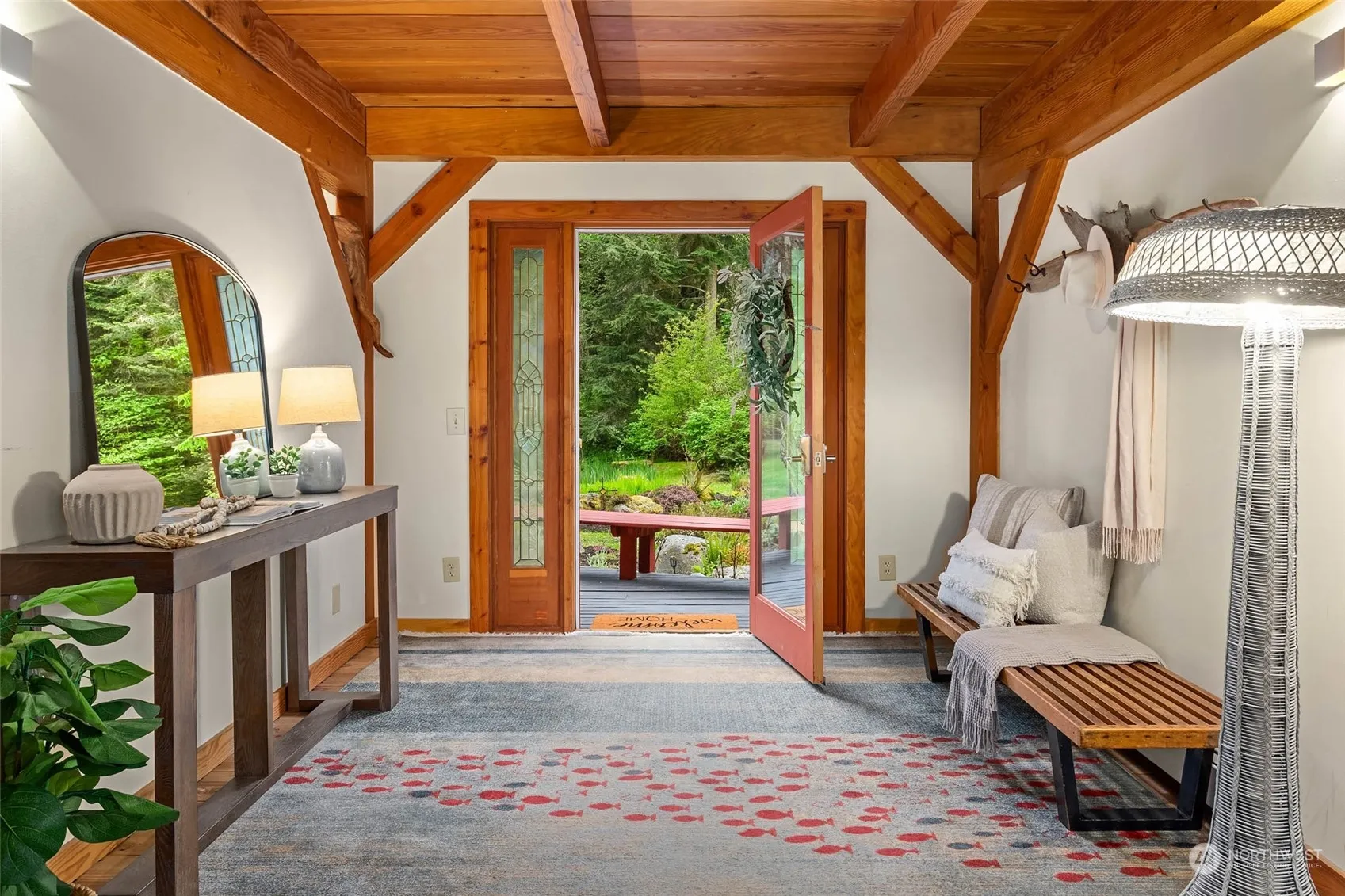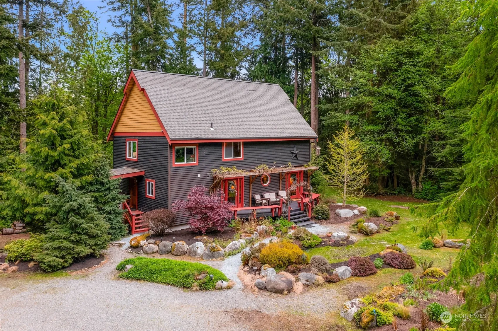 Welcome to The Island House, North Camano’s premier lifestyle sanctuary. Nestled on a serene 2.5 acres, this custom timber frame eco-retreat, built from trees on the land, showcases Mortise & Tenon craftsmanship and hydronic/radiant heating, creating a blend of artisanal luxury and sustainability. Majestic 30-foot ceilings and artisan details in the hand-carved banister & custom-stained glass define its charm. A lucrative STR used for gatherings/workshops/retreats. Home features dual updated kitchens (versatile MIL space) and a stand-alone eco-dome w/bath and kitchenette – perfect for privacy or rental. Two private ponds, a natural sanctuary for wildlife, enhance the sense of tranquility and seclusion. Plenty of room for expansion.