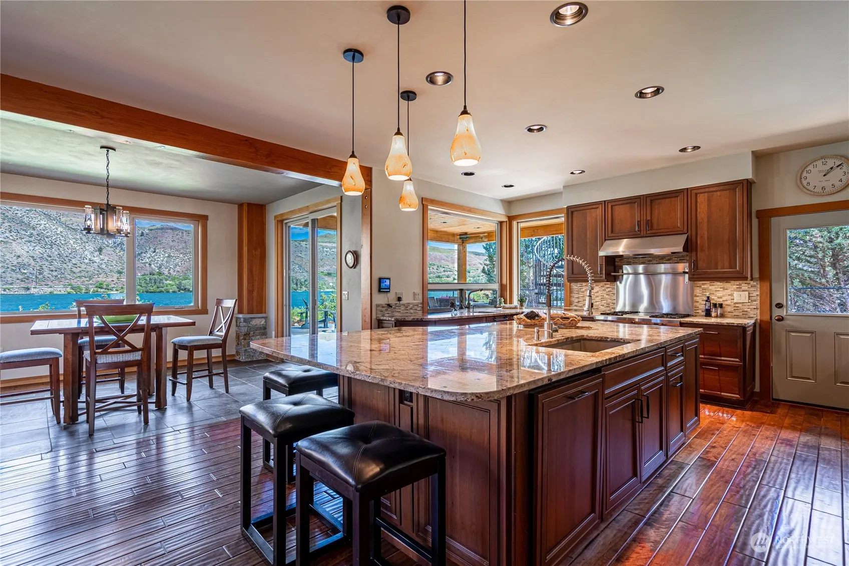 Rare Twin W waterfront estate on 1.12 acres with 140’ of beautiful no bank waterfront. Shared dock and private boat lift on the magnificent Columbia River/Lake Entiat are perfect for water sports. Mature landscaping, extensive patios, spacious lawns, and a welcoming hot tub for relaxing anytime. Impressive floor to ceiling stone fireplace anchors the living room with soaring 24’ ceilings French doors opening to the patio with river views. The chef’s kitchen with Wolf range, custom cabinets, and slab granite counters are ideal for entertaining. The gorgeous primary suite overlooks the river, with a sitting area, private deck, and 5-piece bathroom with soaking tub and heated floors. A media room, office with lake view, and guest bedrooms.