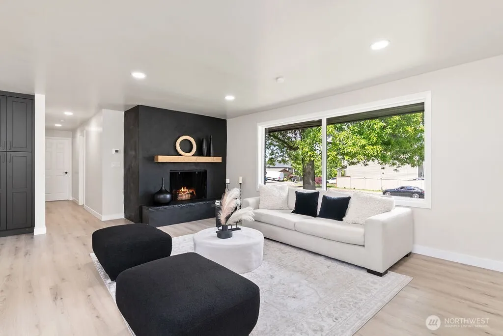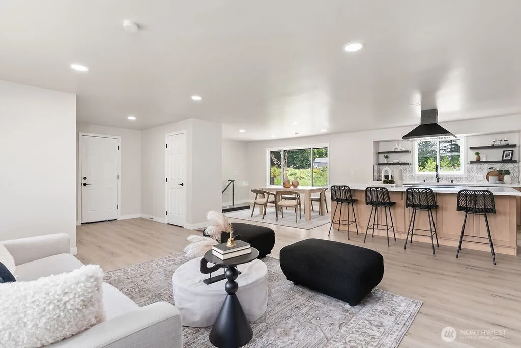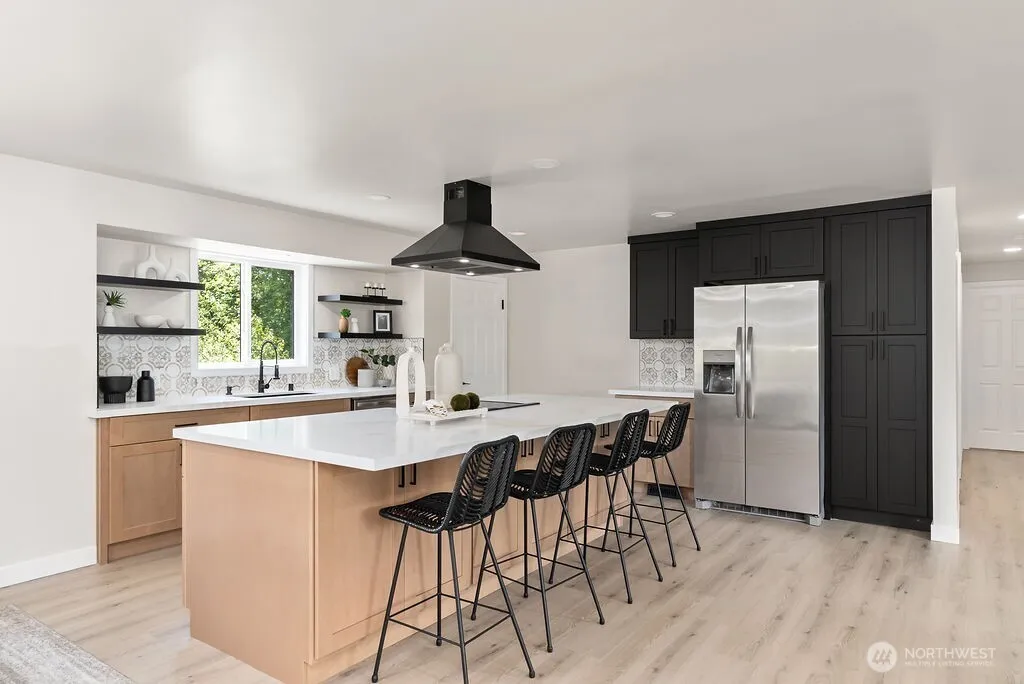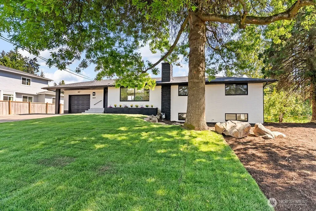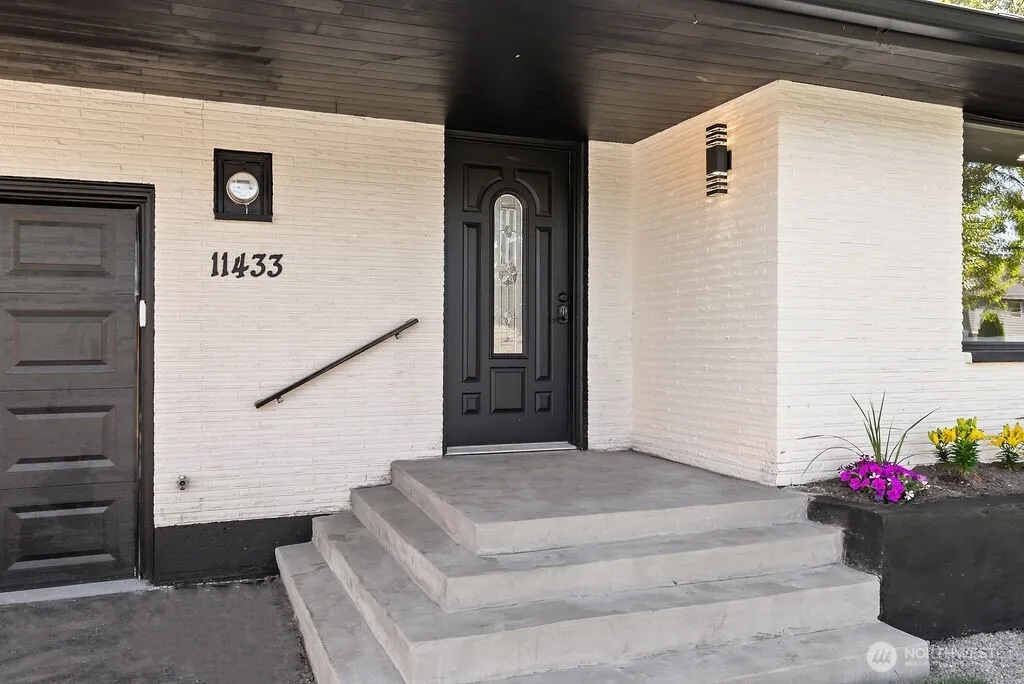 Thoughtfully remodeled 5BD/2.5BA home with daylight basement on a quiet street,backing to a greenbelt.Featuring a brand-new kitchen with soft-close cabinetry,floating shelves,XL island with additional storage&eating area.Custom glass railings add a modern touch to the open living space.Bathrooms throughout the home showcase floating vanities,LED mirrors,custom tilework with niches, and h floors. The primary suite offers a spa-like retreat with an oversized LED-lit shower,double vanities, and tile underfoot. The daylight basement is fully finished with a spacious family room,2 additional bedrooms, full bath, laundry with new washer & dryer, large storage & patio access. New roof & furnace, new sewer connection.Large backyard & ample parking!