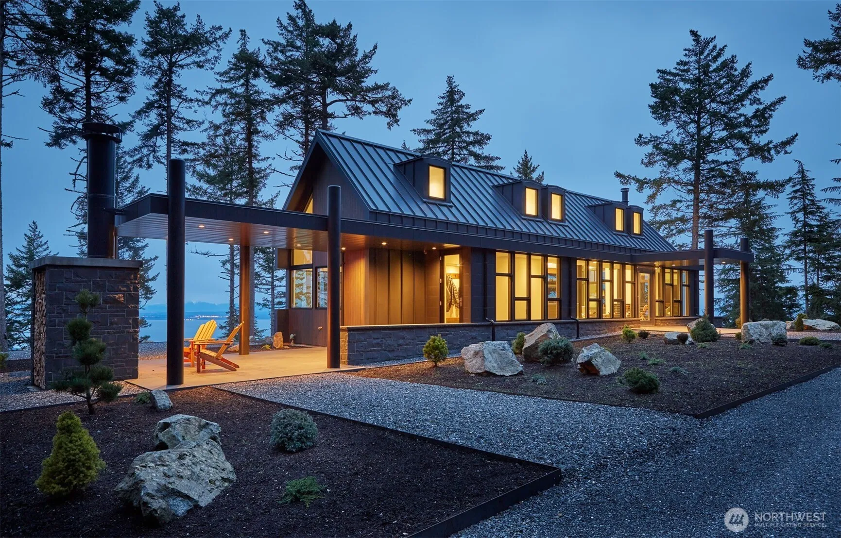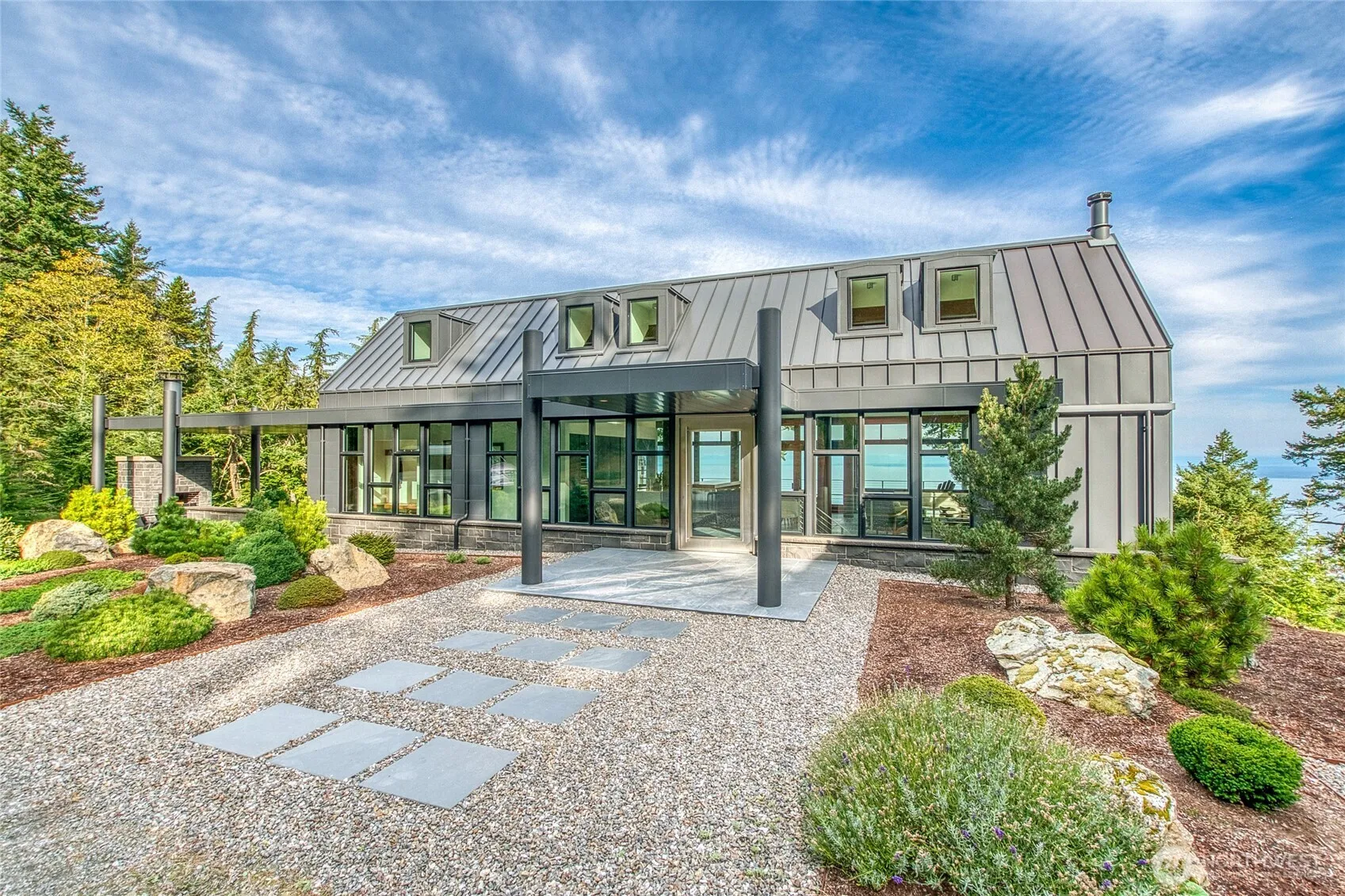 Stunning views of Mt. Baker, Canadian Cascades, Salish Sea, & nearby islands blend with 10.84 acres of forest, creating a magical setting for this exquisite home designed by Vandervort Architects. Luminous great room warmed by a Wittus fireplace, exceptional Bulthaup kitchen, & primary suite with adjoining loft harmonize with floor-to-ceiling + clerestory windows bathing the residence in light. Secondary bedrooms, family, & bonus rooms on lower level. Brazilian slate flooring unites exterior steel, cedar, & stone with interior space. Outdoor stone fireplace & seating area provide yearlong enjoyment. Moran St. Park w/trails connect at east boundary line. Timeless furniture included. Escape the ordinary and discover your island treasure.