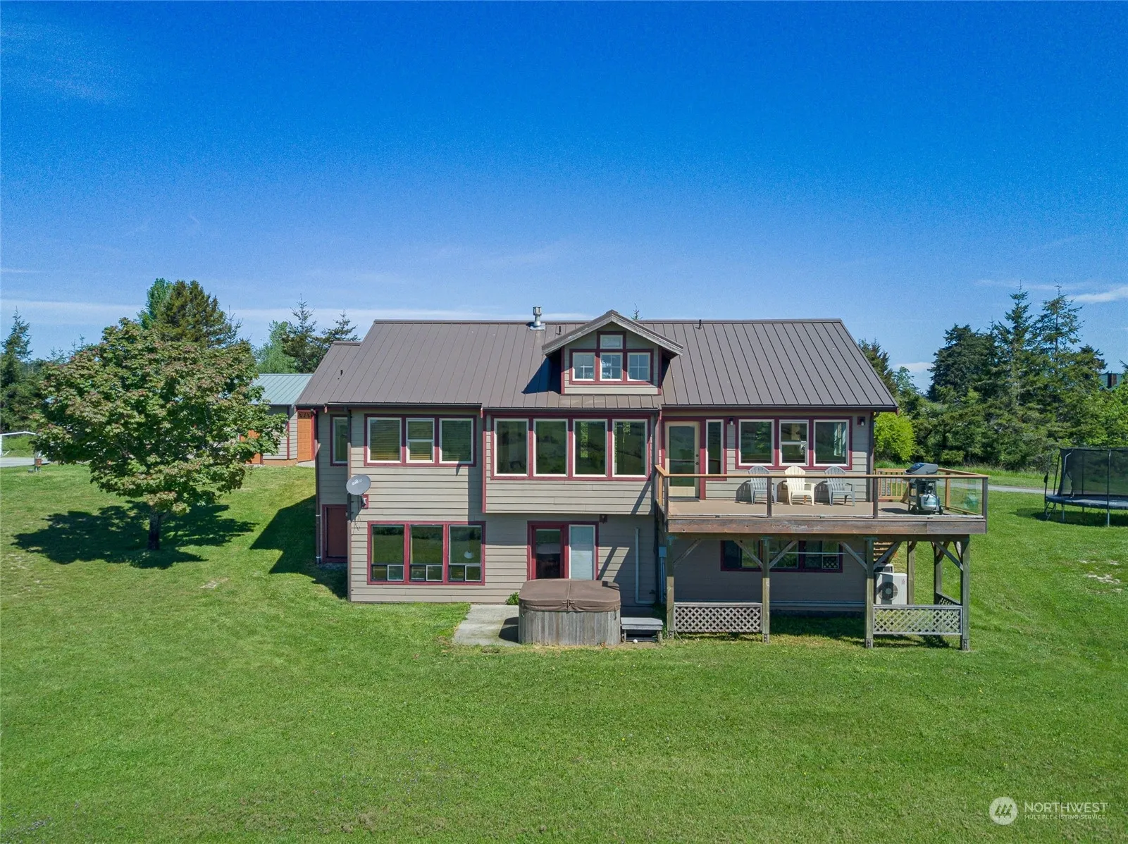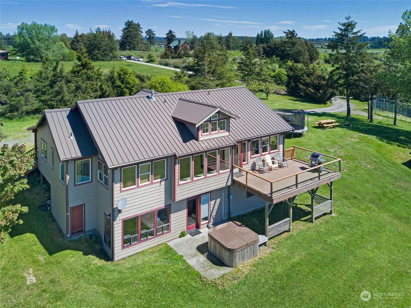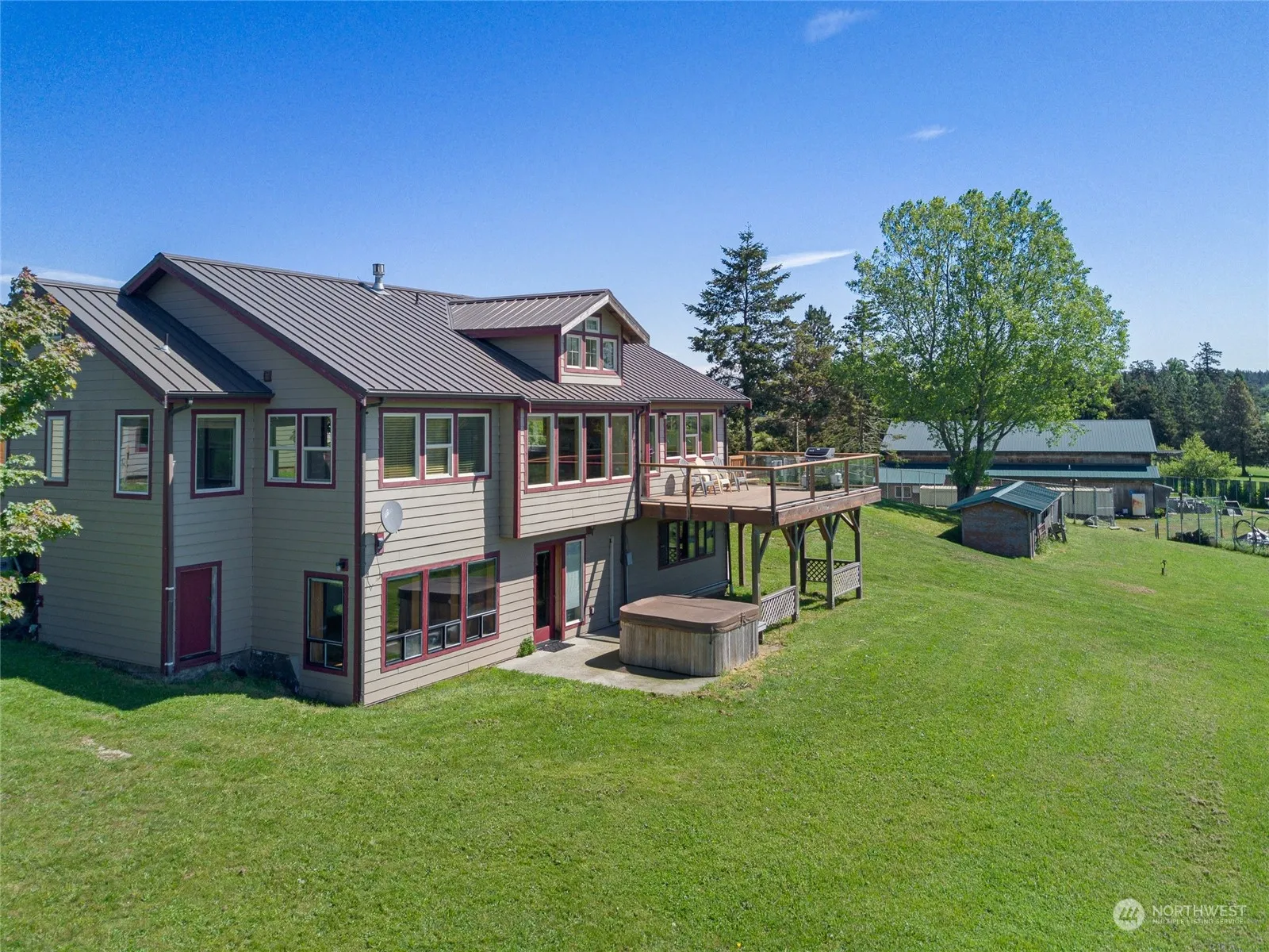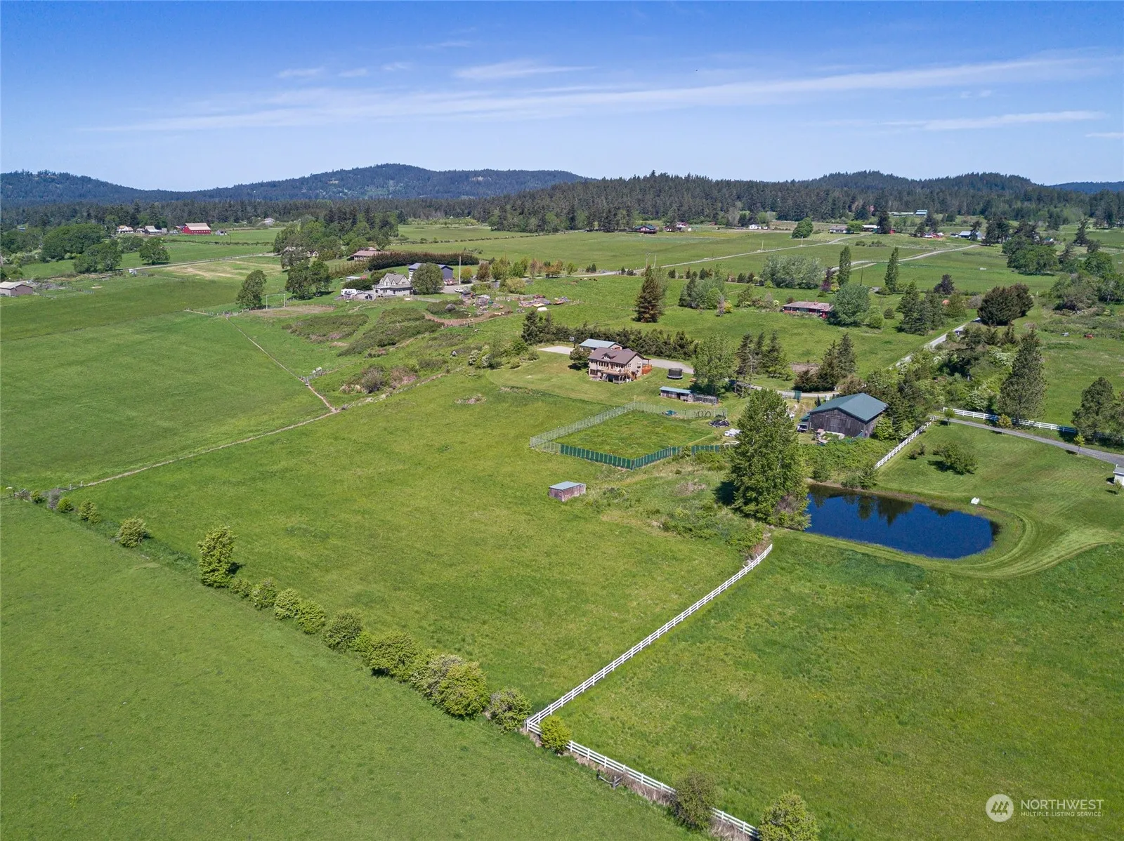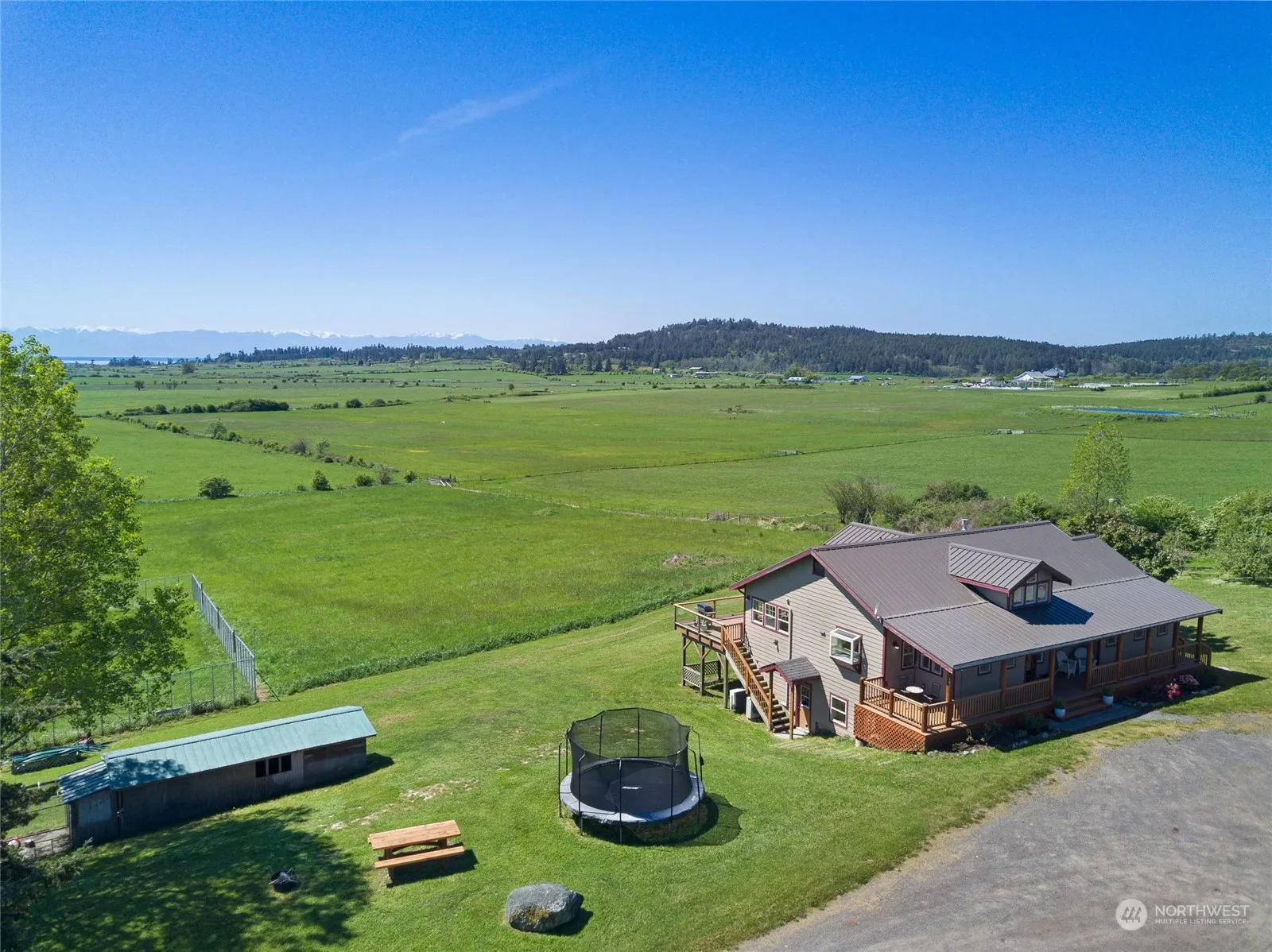 Extraordinary property with unparalleled views of sunlit San Juan Valley, False Bay & majestic Olympic mountains. House sits on private 6+ acres, overlooking historic, protected farmland, & field, ideal for horses/livestock. The home welcomes you with a captivating wall of windows framing the views, a spacious open floor plan w/vaulted ceiling, sunrise/sunset deck. Primary bedroom is located on the main floor, two additional bedrooms & family room downstairs. Updated amenities: mini split heating/air conditioning & high speed fiber. 2-car garage w/two bonus rooms, perfect for guests, hobbies or storage. a 3000+ sf shop w/3 phase power & many potential uses. Rent out or operate your own business. Sport court, hot tub, pond! Close to town.