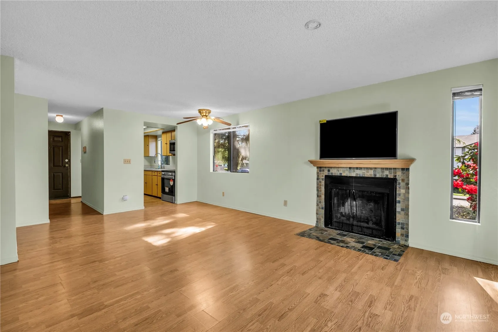 Brand New Windows & Sliding Door just installed! Brand new siding, freshly painted. No Rental Cap, No Stairs! Ground Floor End Unit! 2beds/1.75bath in the heart of East hill, balancing convenience, privacy & comfort! Mere minutes from shopping, transit, freeways, & Kent Station. Primary Suite offers walk-thru closet & private 3/4 bathroom. Guest Bed & Full Guest Bath w/tub down the hall. Ideal floorplan, abundant storage, spacious living room! New Stainless Stove/Fridge/Dishwasher. Newer in-Unit Washer/Dryer. All Appliances stay! Wood burning fireplace and covered patio offer cozy respite. Two Assigned parking spaces (1 is covered carport) close to unit. HOA dues cover Water/Sewer/Garbage, road maint. & landscaping. Don’t miss this one!