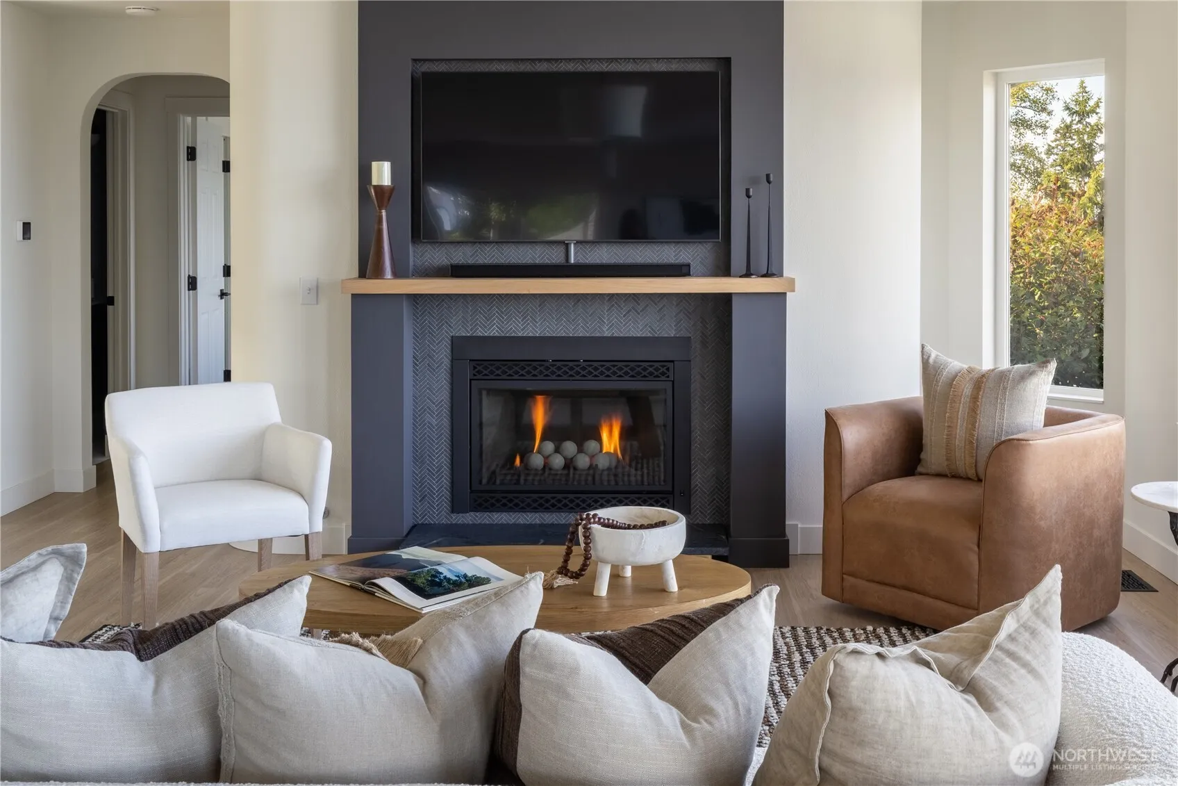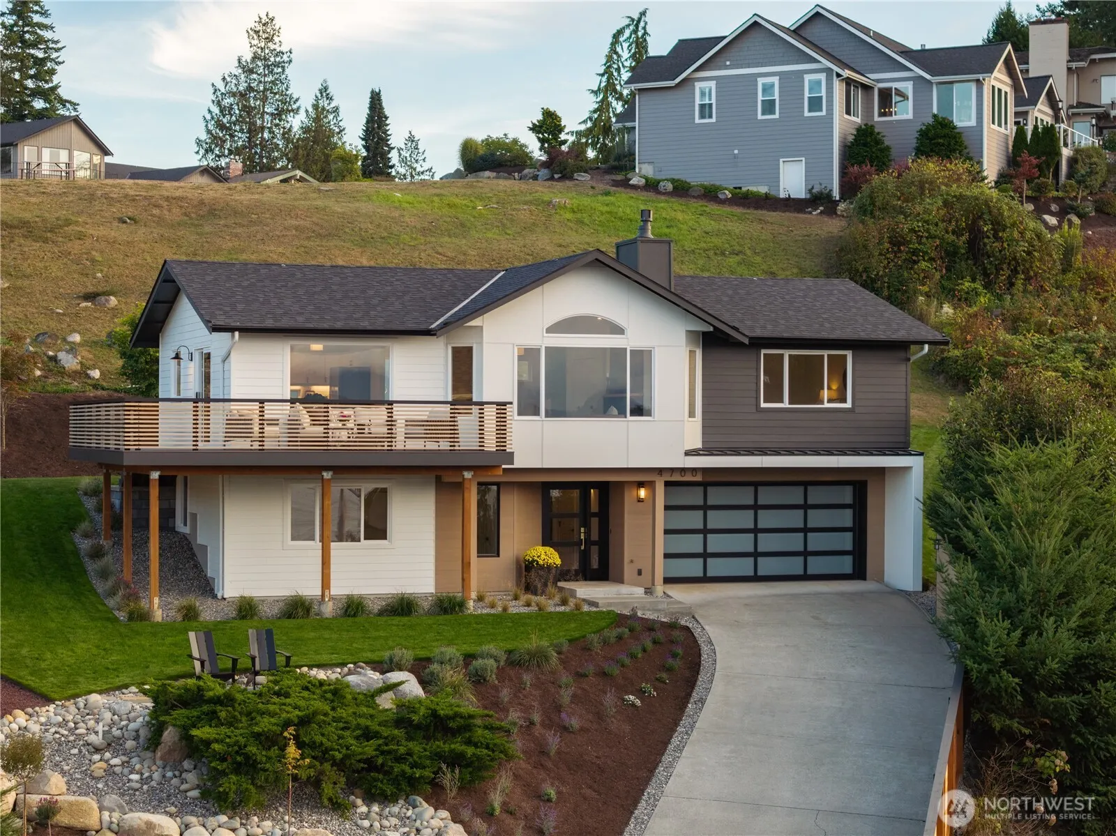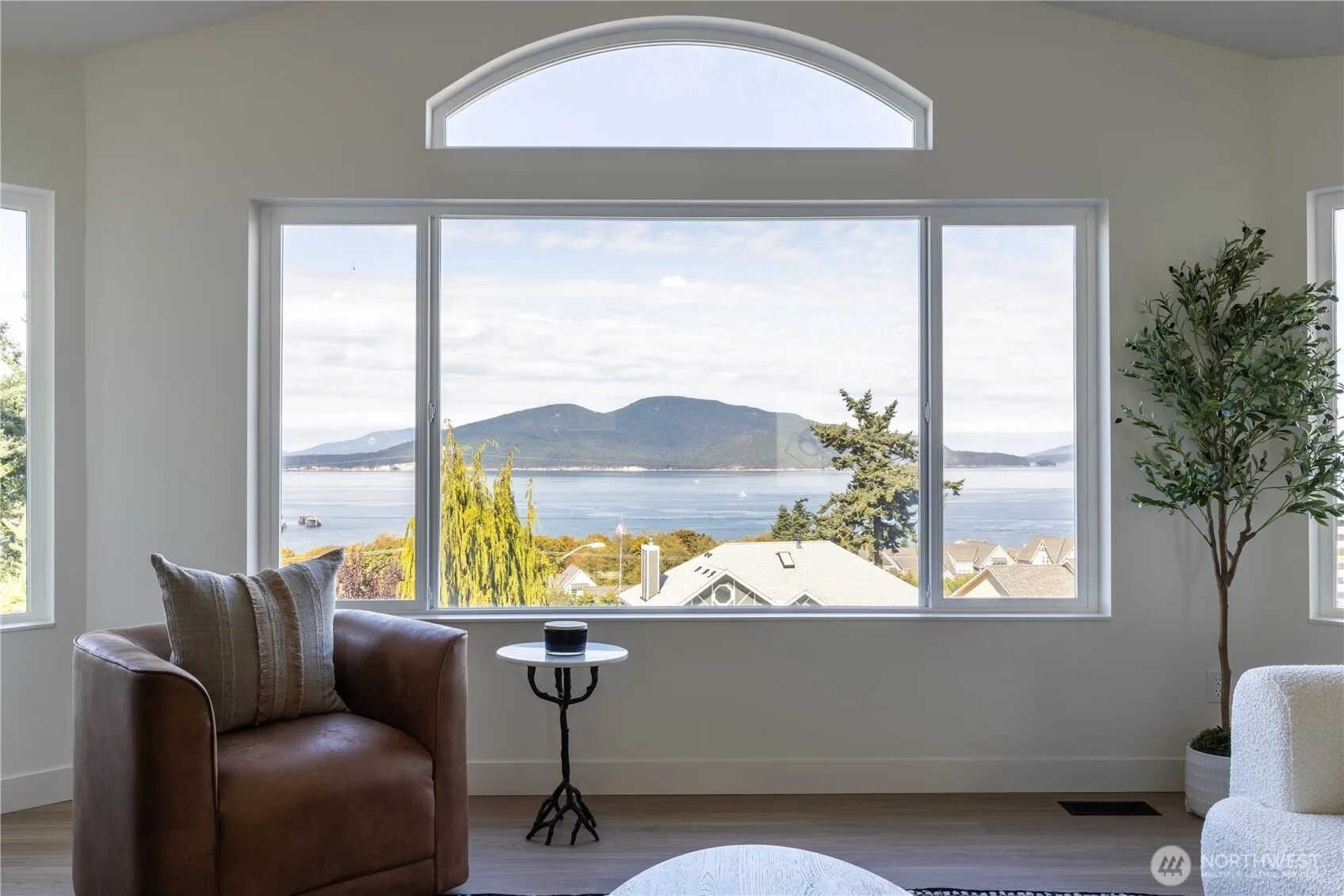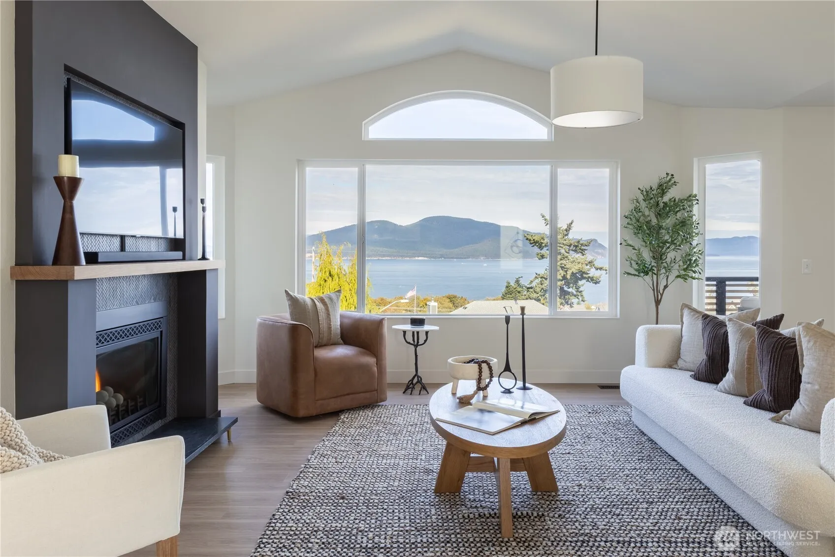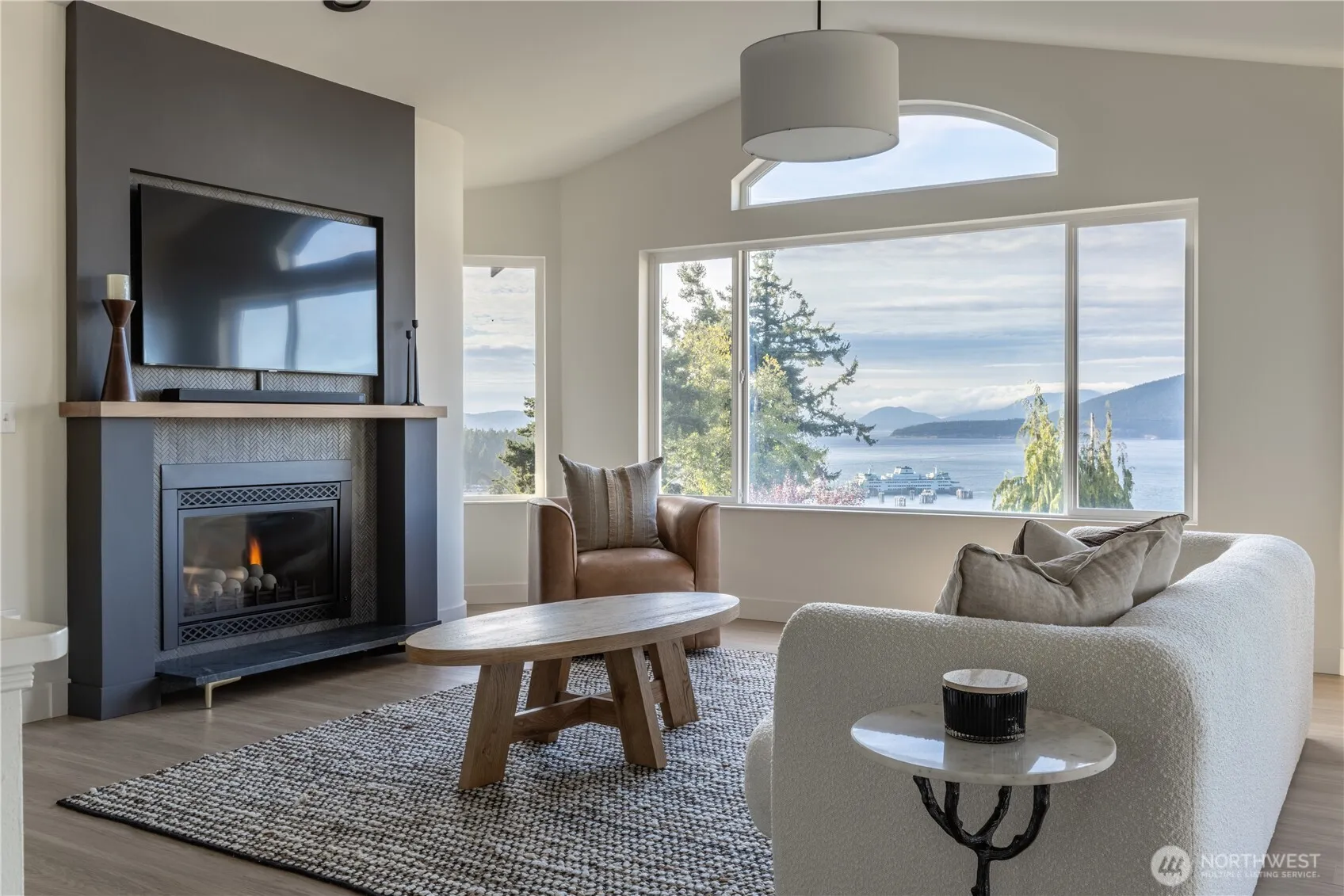 Move-in ready, refined & crafted for effortless luxury in the heart of Anacortes, this masterfully reimagined Contemporary NW home showcases sweeping Guemes Channel & WA State Ferries views. Meticulously renovated from top to bottom, this property blends timeless design w/low-maintenance living. Exterior features a brand-new roof, Hardie + cedar siding, seamless gutters, Milgard windows, custom Fiberon deck designed for years of enjoyment. Inside, light-filled living spaces highlight vaulted ceilings, showpiece fireplace wall, chef’s kitchen w/granite & premium Samsung appliances. Spa-like primary suite offers Carrara marble bath w/rainfall shower, body jets, dual vanity. Smart home tech, premium flooring & high-quality finishes throughout.